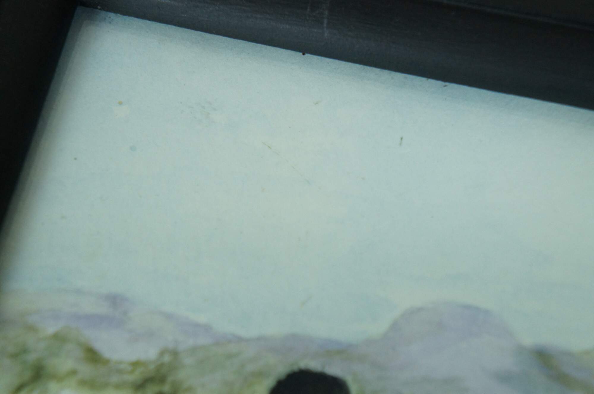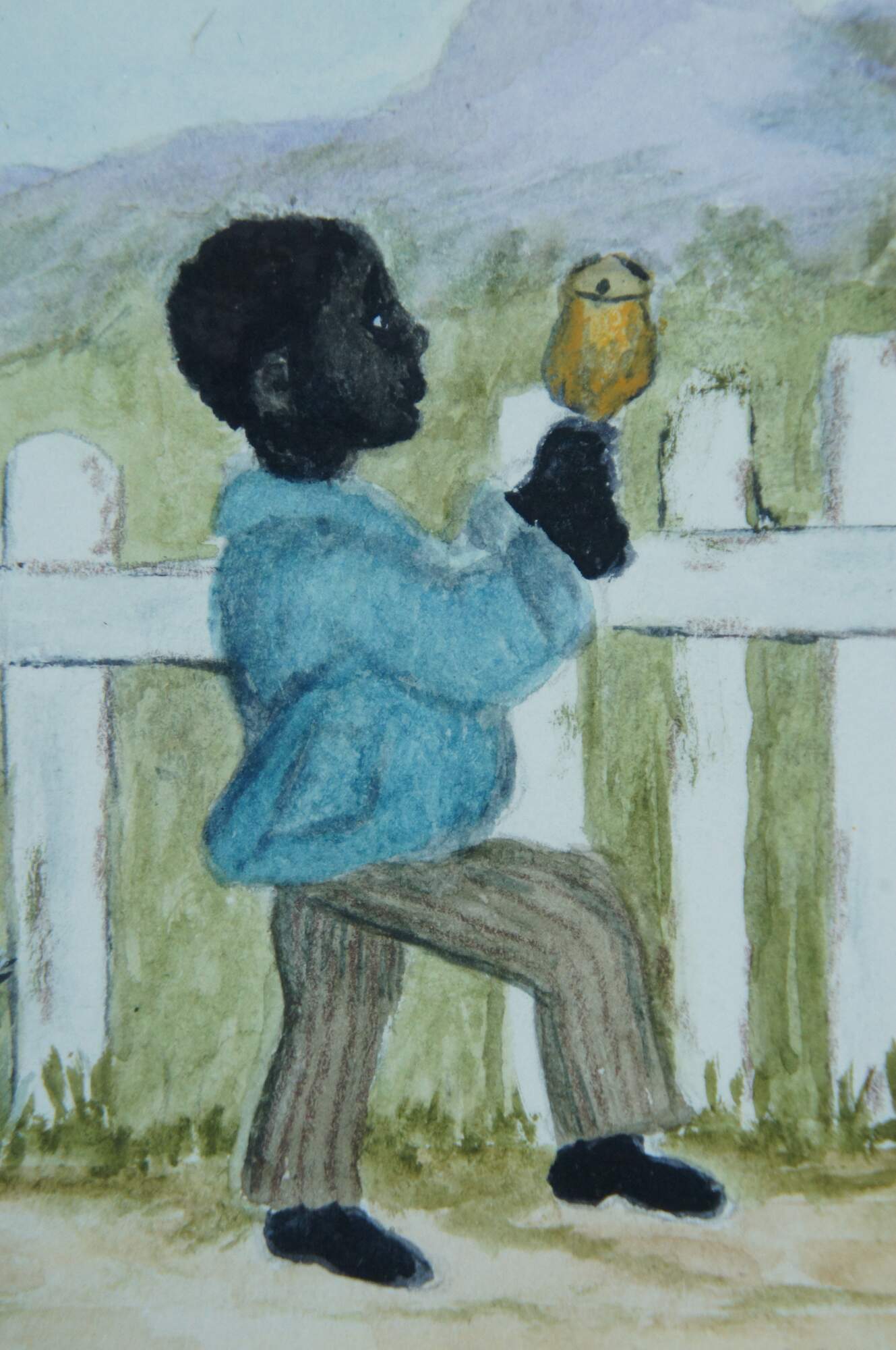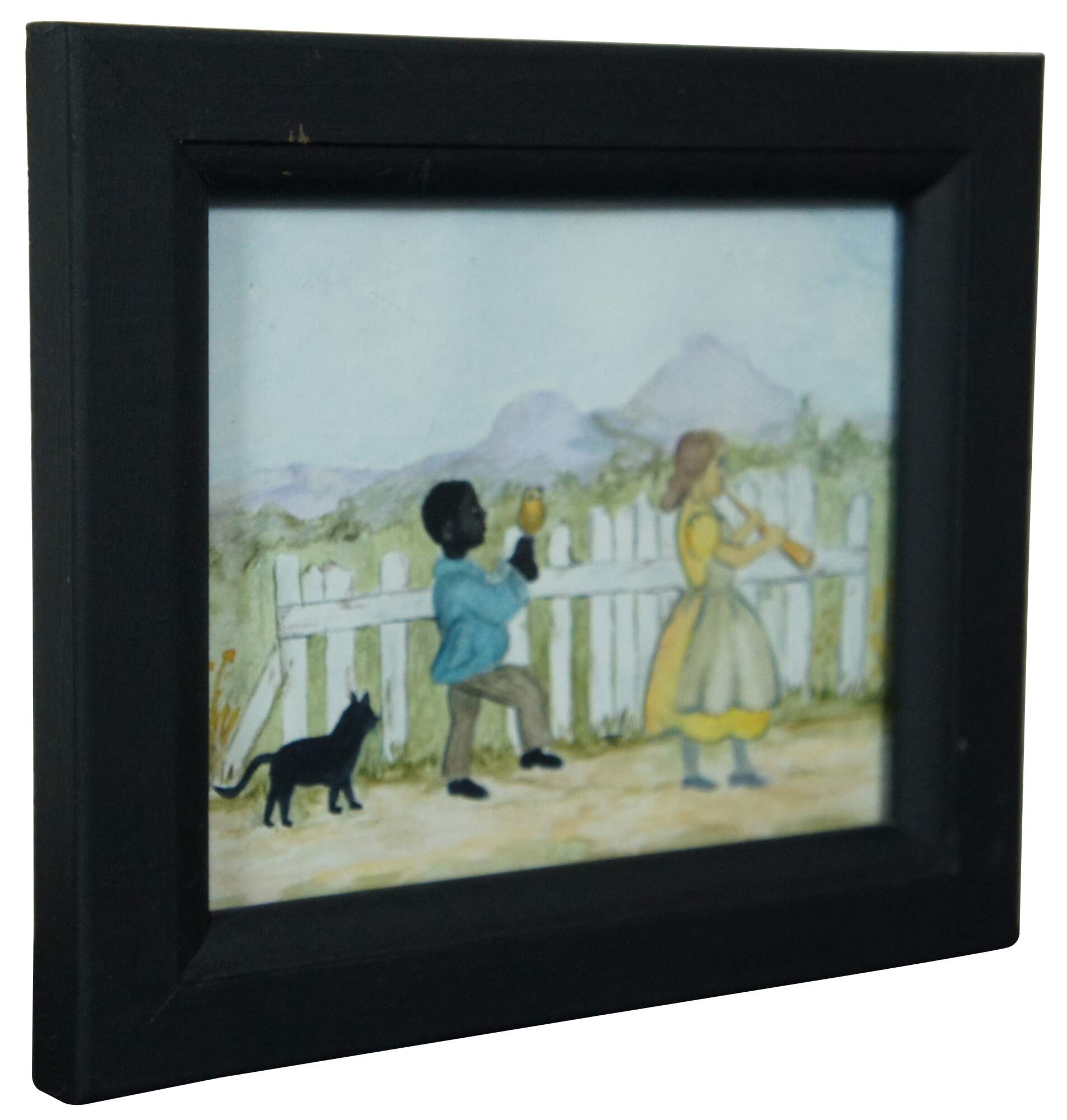 Antique folk art style watercolor painting of a pair of children with instruments and a cat walking down a road lined with a white fence.