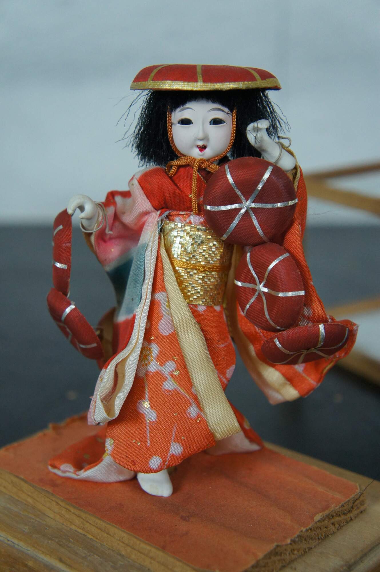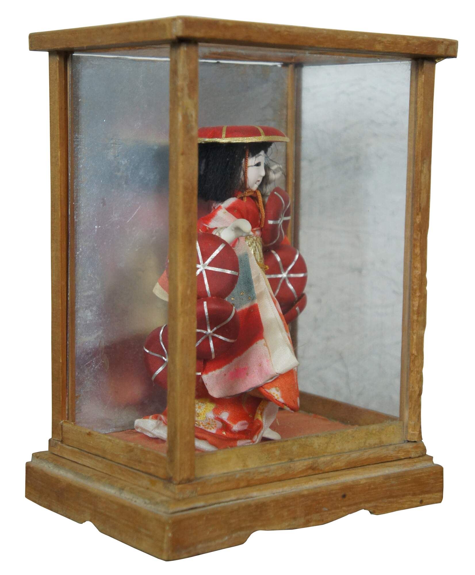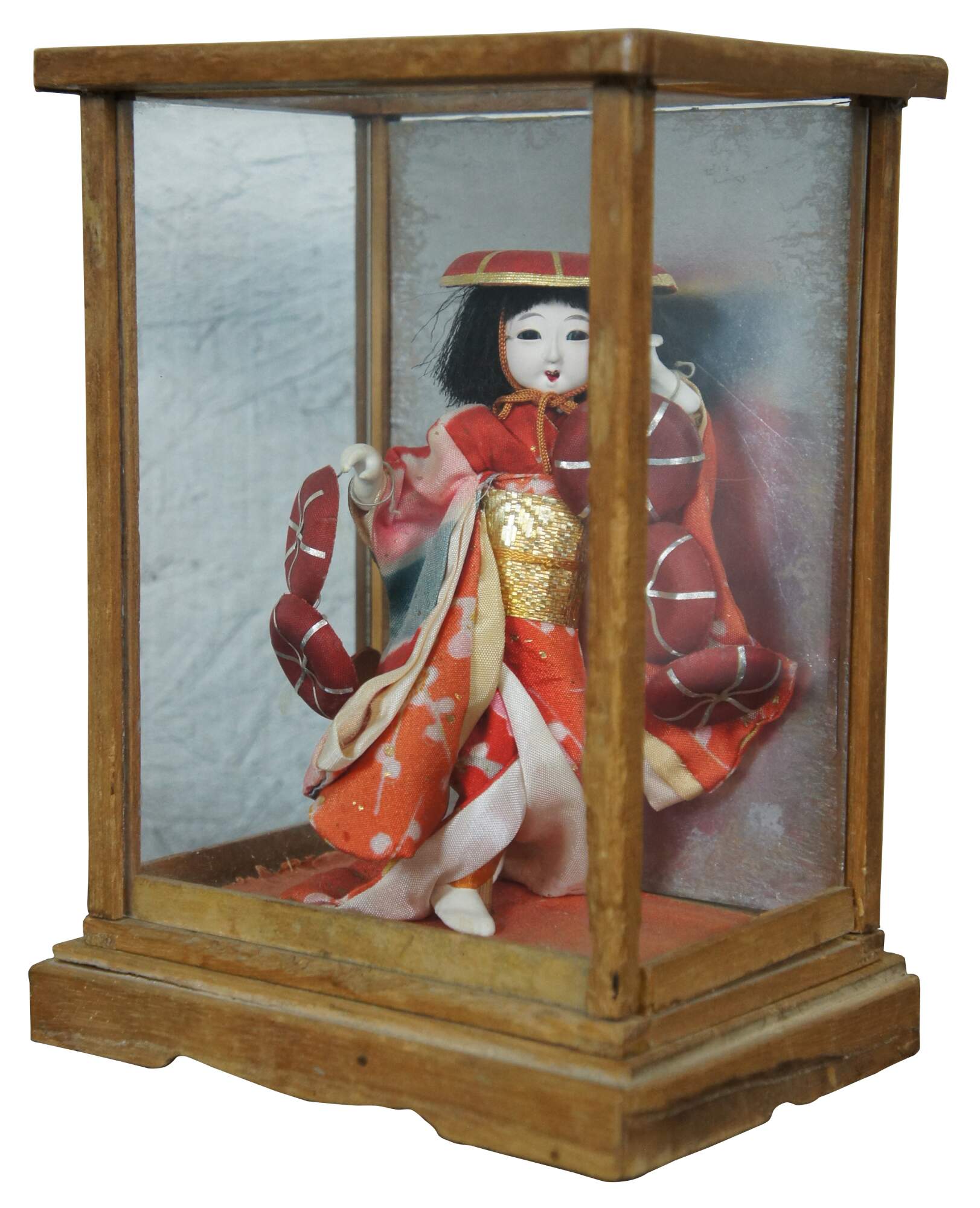 Vintage ningyô or Japanese doll with short cropped hair, dressed in red and gold Kimono, carrying strings of hats. Doll is set and displayed in a wood and glass display case. “Japanese dolls (人形, ningyō, lit. ""human form"") are one of the traditional Japanese crafts.