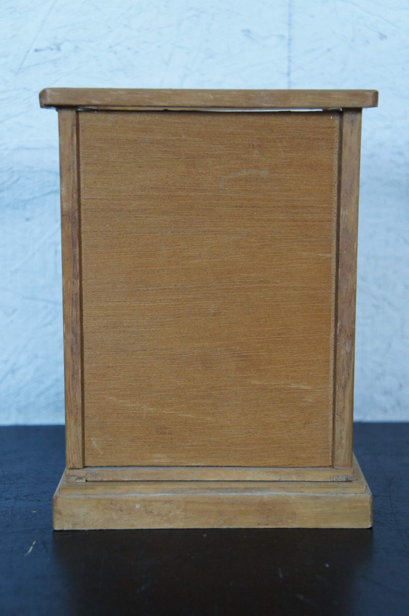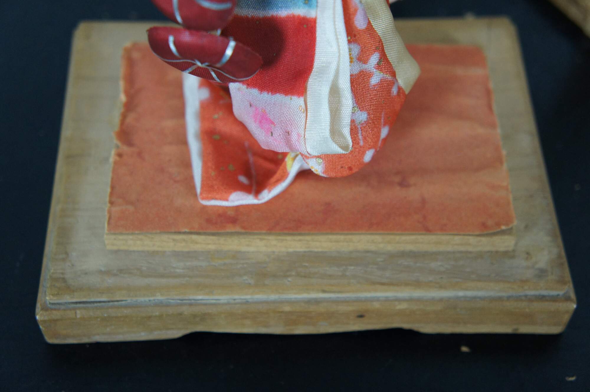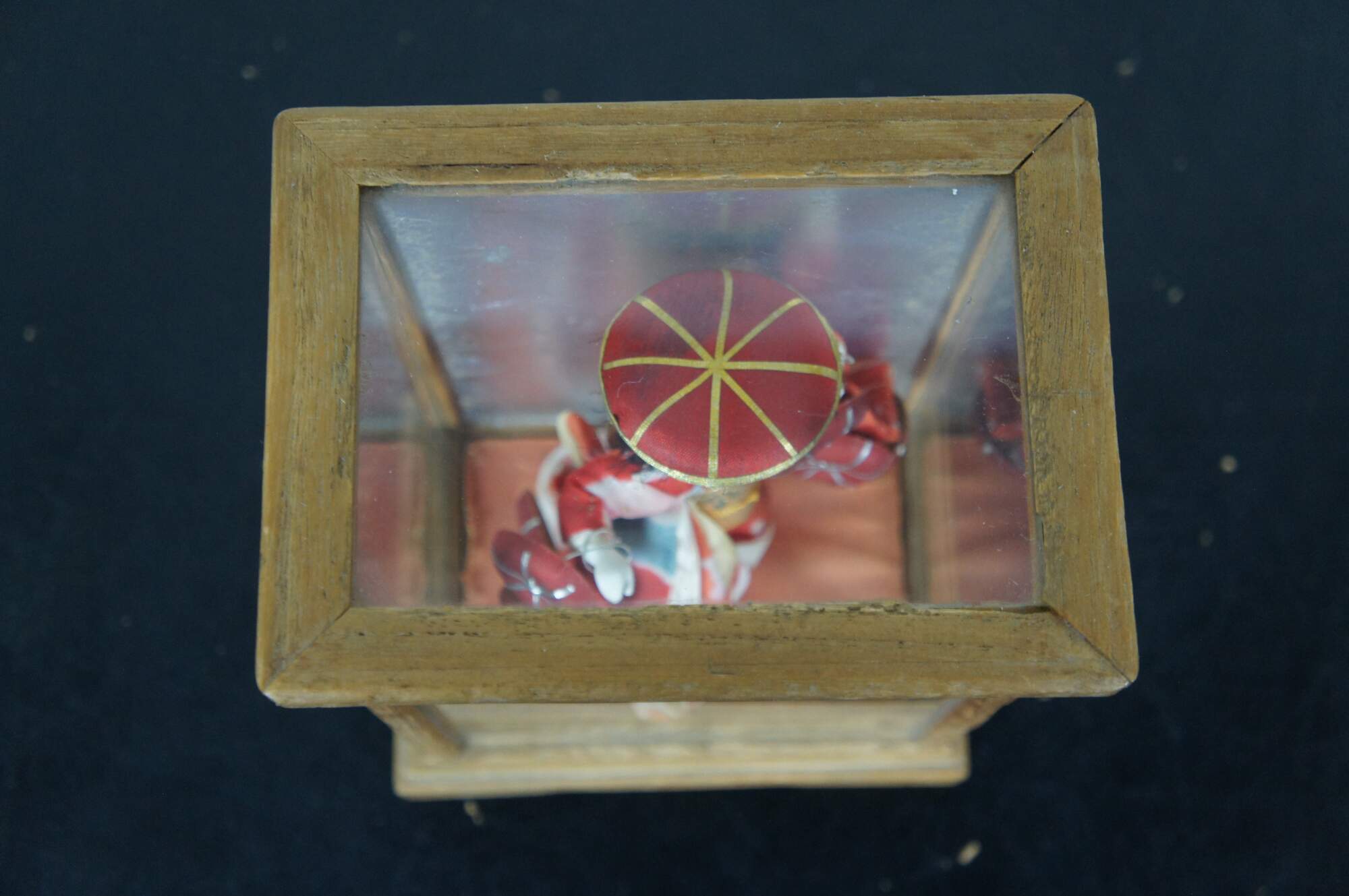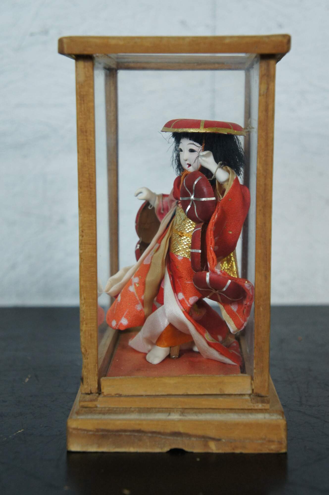 Vintage ningyô or Japanese doll with short cropped hair, dressed in red and gold Kimono, carrying strings of hats. Doll is set and displayed in a wood and glass display case. “Japanese dolls (人形, ningyō, lit. ""human form"") are one of the traditional Japanese crafts.