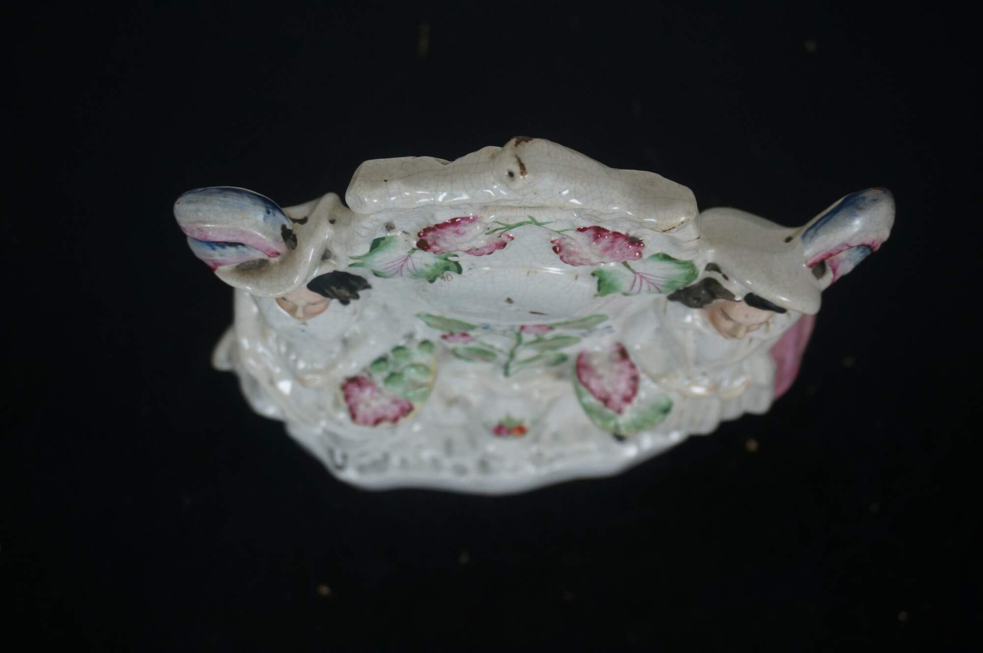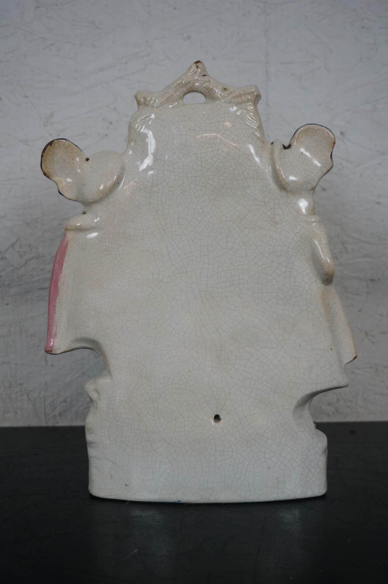 Antique 19th century English Staffordshire porcelain flatback figurine in the shape of a pair of male and female figures in Scottish dress, carrying baskets of grapes, standing on either side of a vase of flowers and painted clock face. Circa 1850s.
