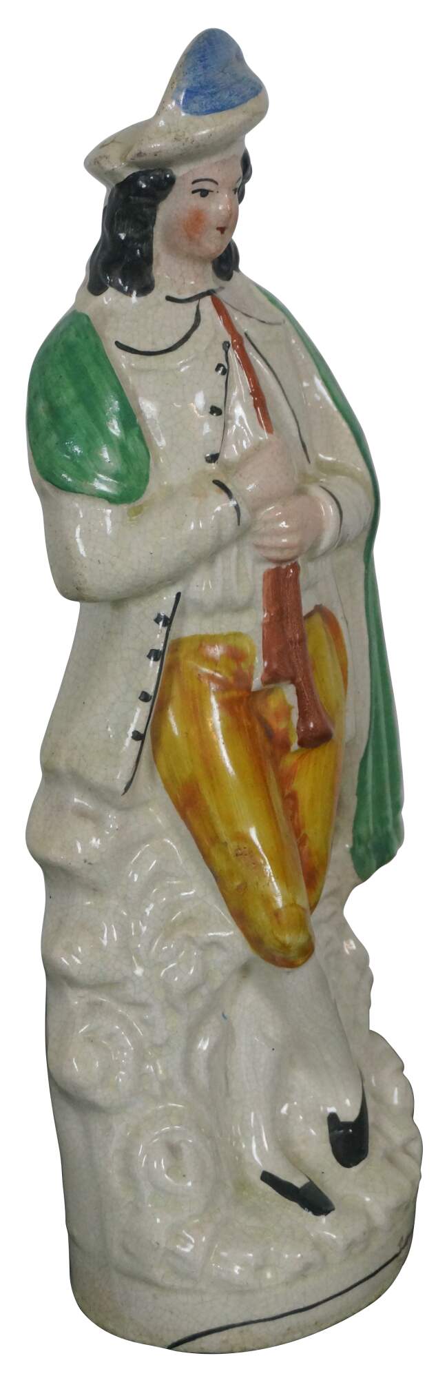 Antique 19th century English Staffordshire porcelain musician figurine in the shape of a man holding a pair of pipes or a chanter for bagpipes.