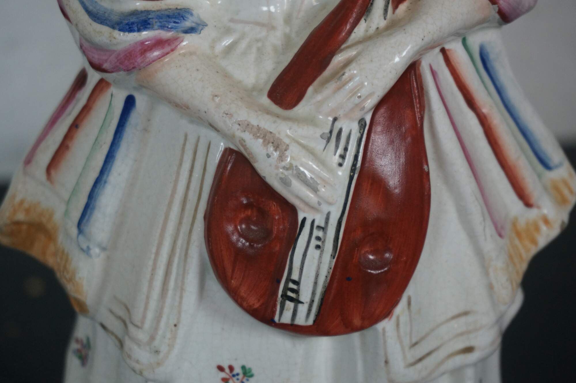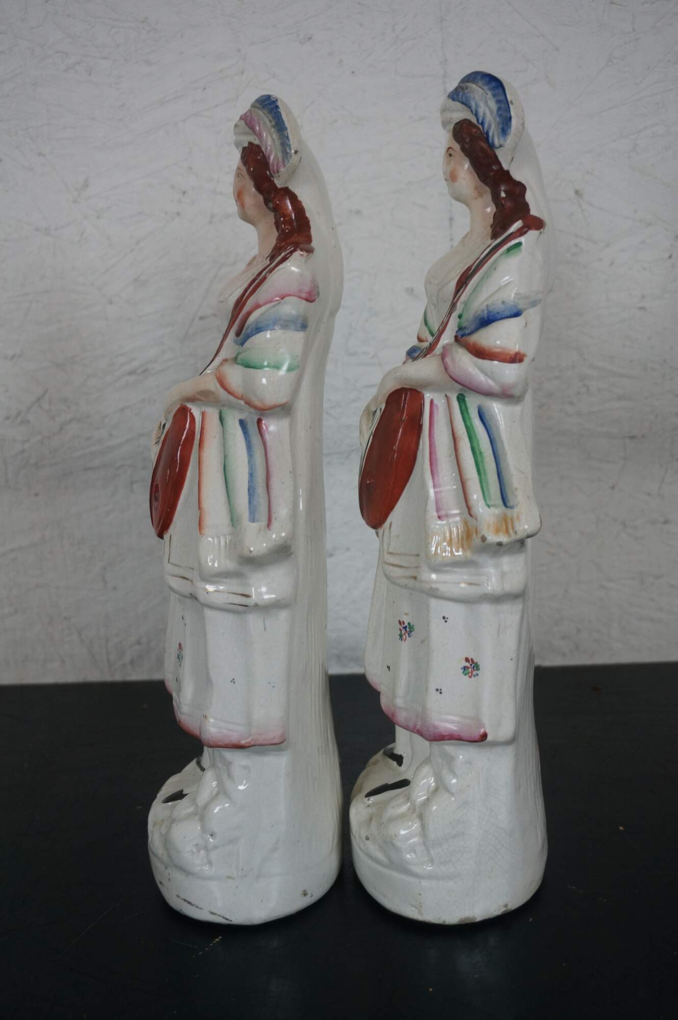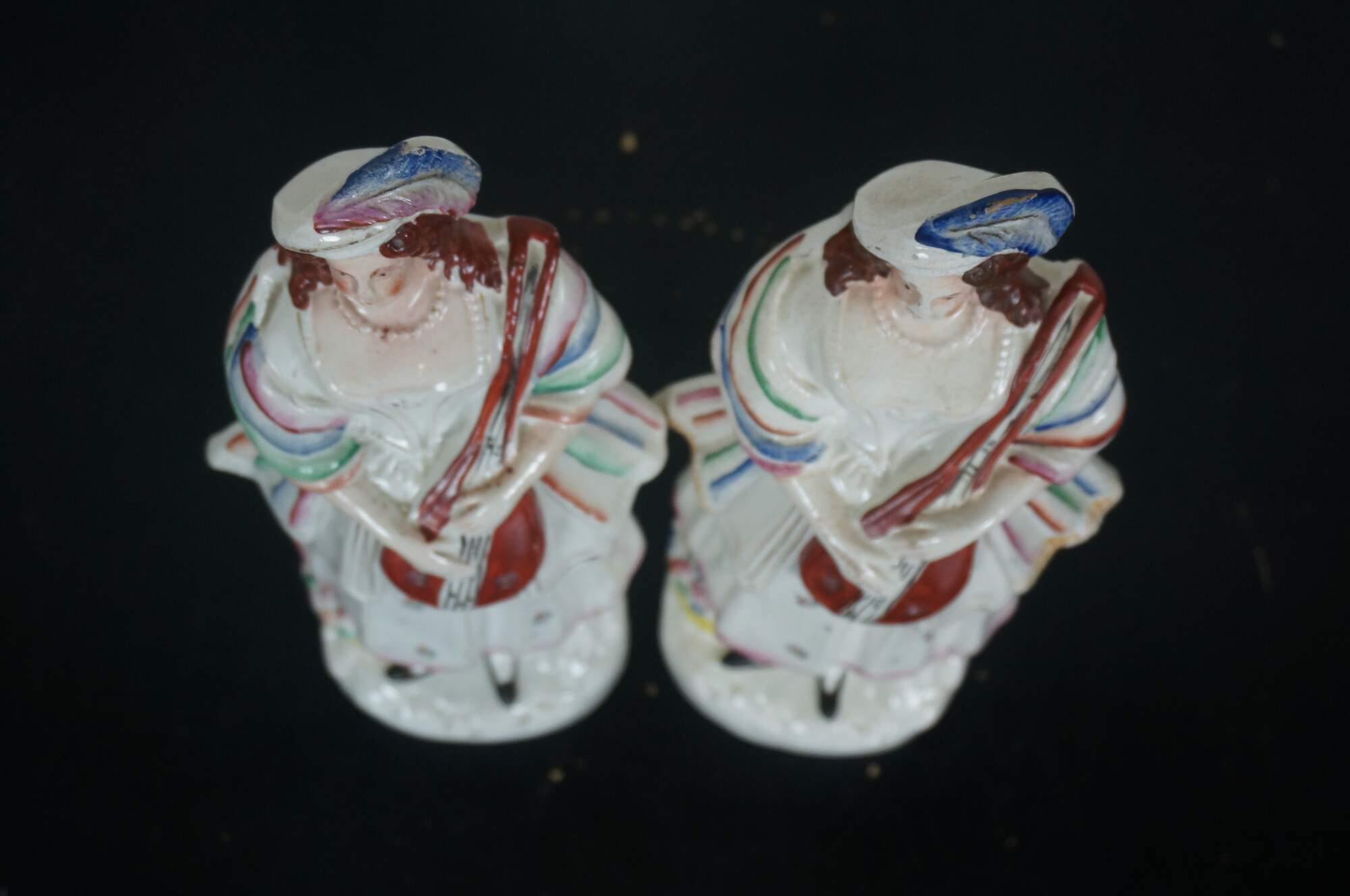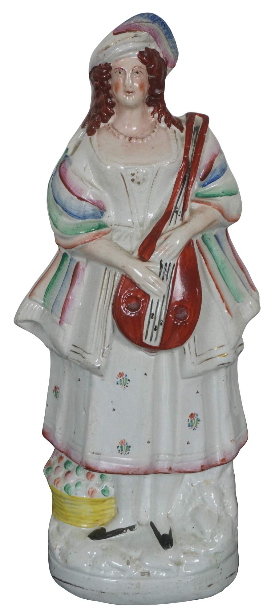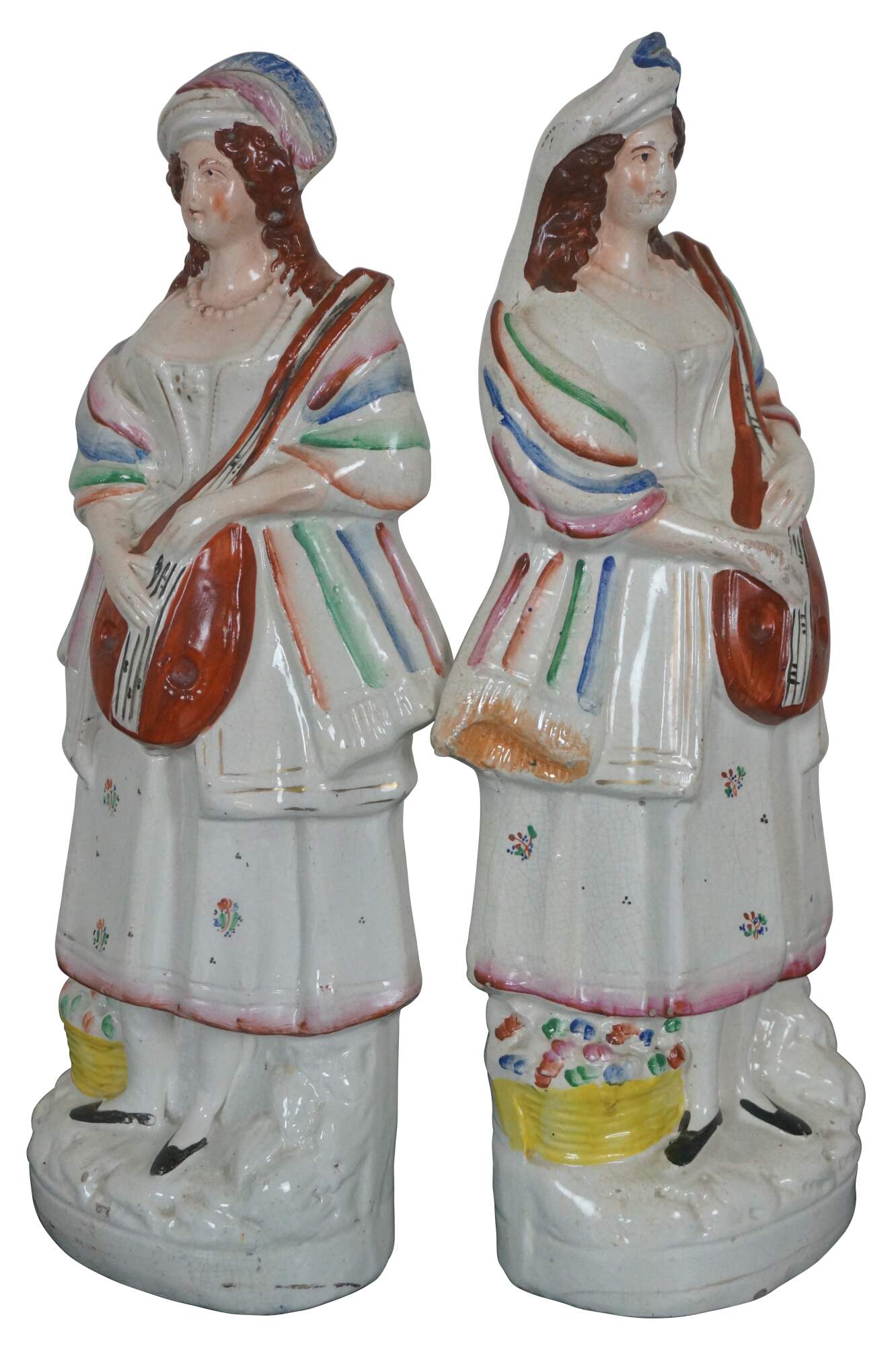 Pair of antique English Staffordshire porcelain mantel figures in the shape of Victorian woman in feathered hats holding mandolins.