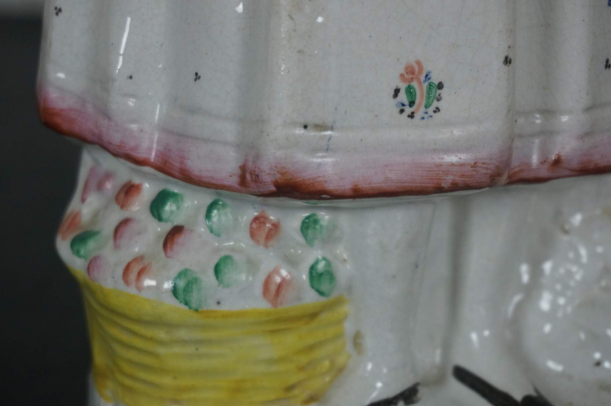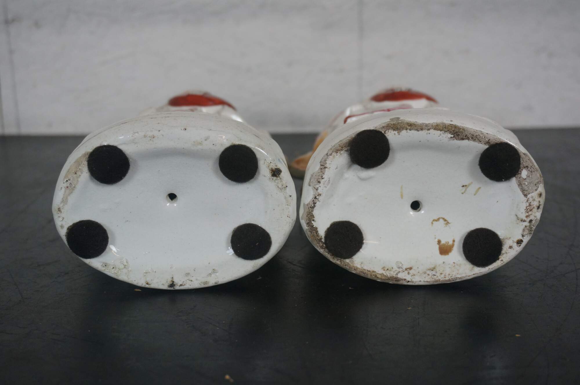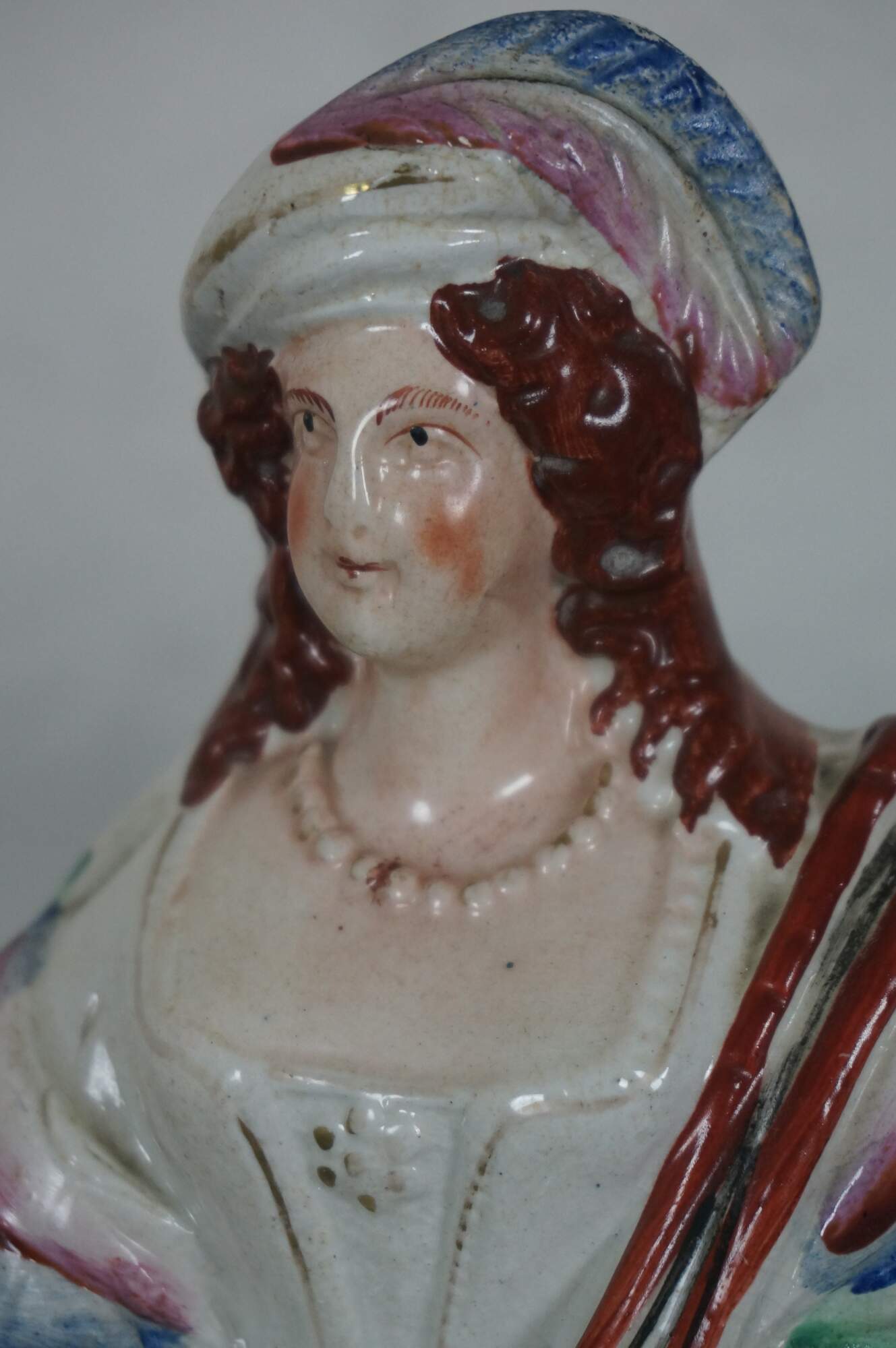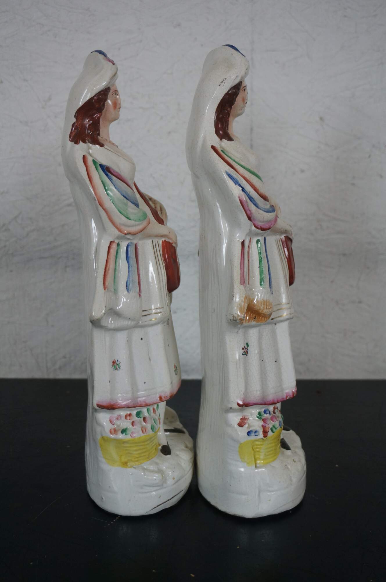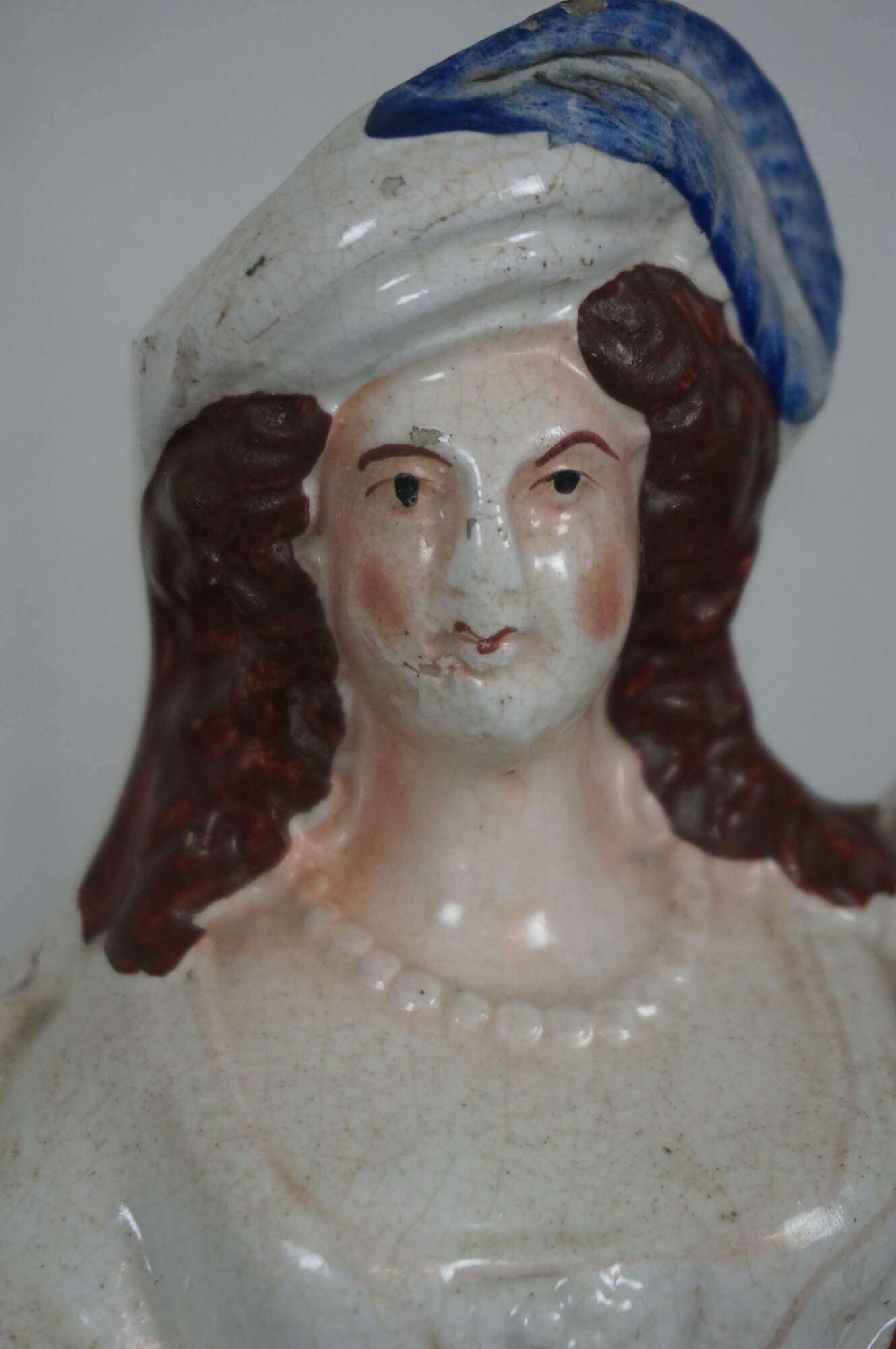 Pair of antique English Staffordshire porcelain mantel figures in the shape of Victorian woman in feathered hats holding mandolins.