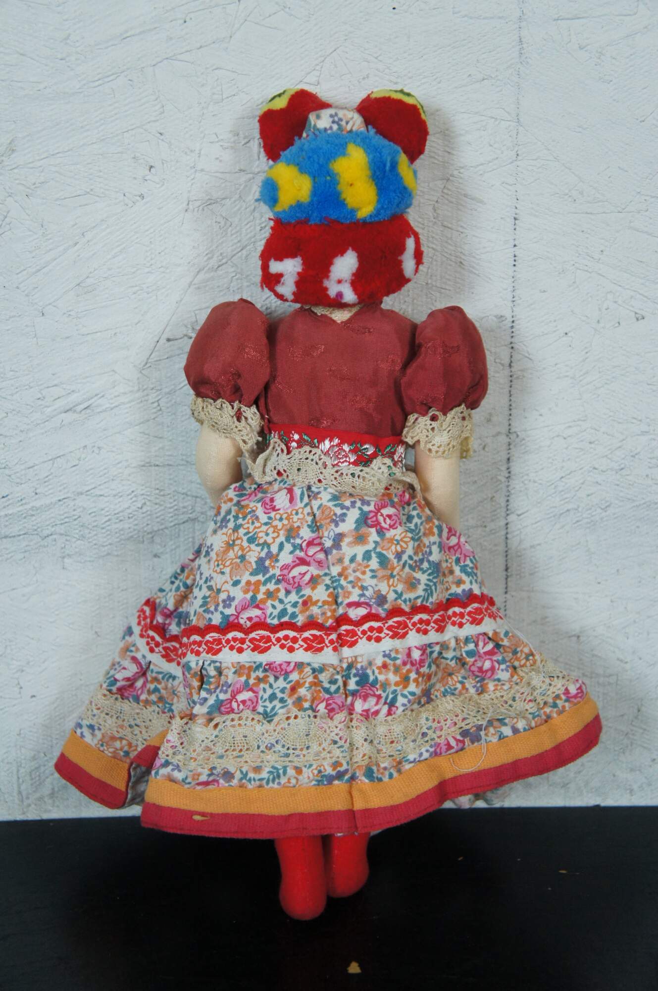 Antique cloth and composition head Hungarian folk art doll dressed in the traditional costume of the Matyo region, including puff sleeves, elegant embroidered trim, and hed scarf decorated with pom poms. “The Matyó[1] are a subgroup of Hungarians. The Matyó people populate an ethnographic region in Northern Hungary, called "Matyó Land (Matyóföld)". Matyó Land consists of the town of Mezőkövesd and its vicinity. The Matyó have retained distinctive traditions, costumes and embroidery.”