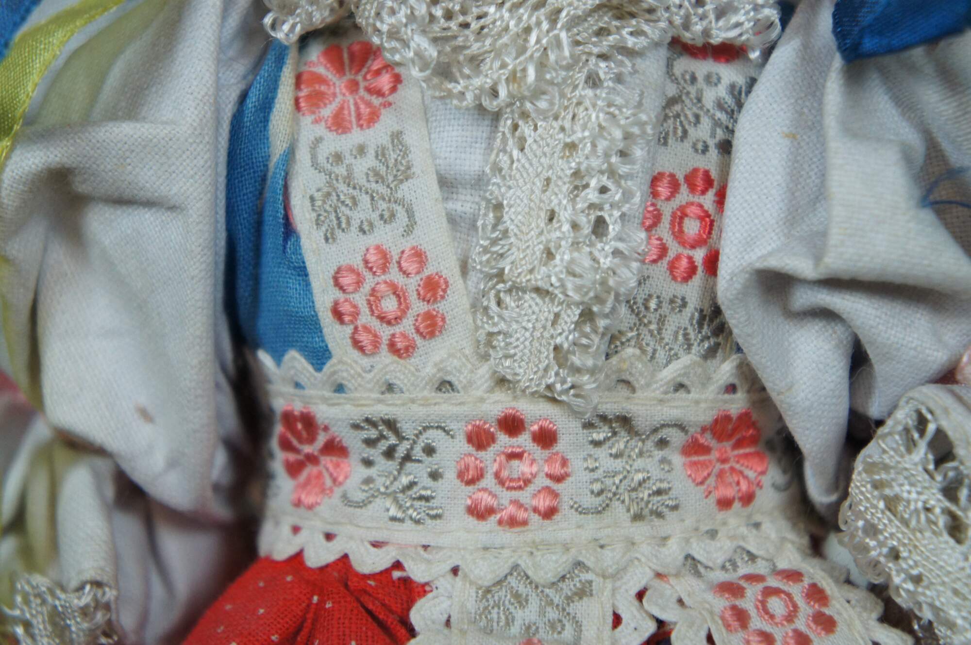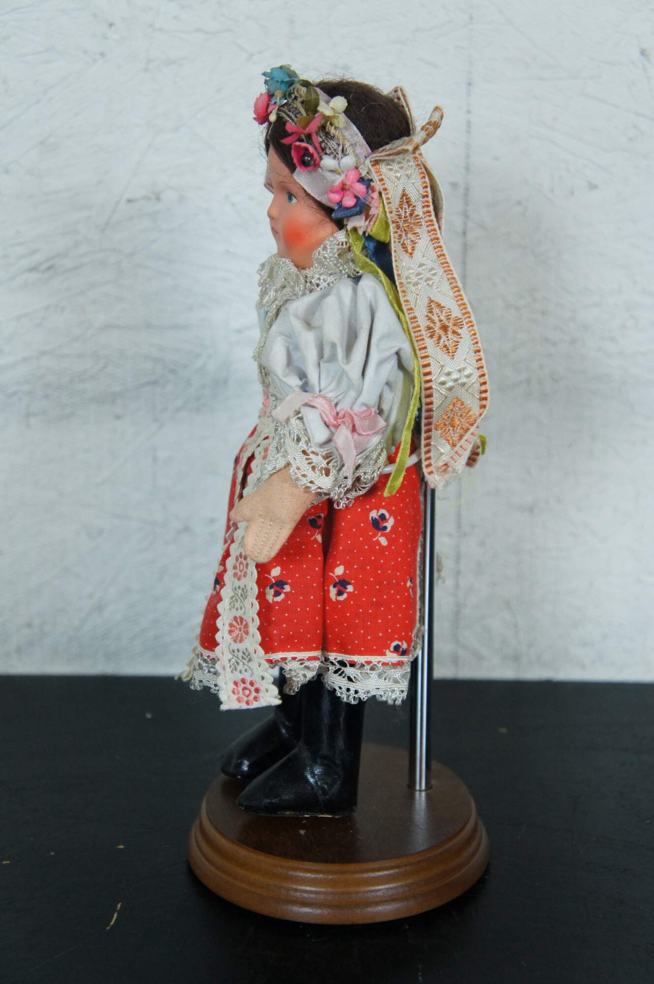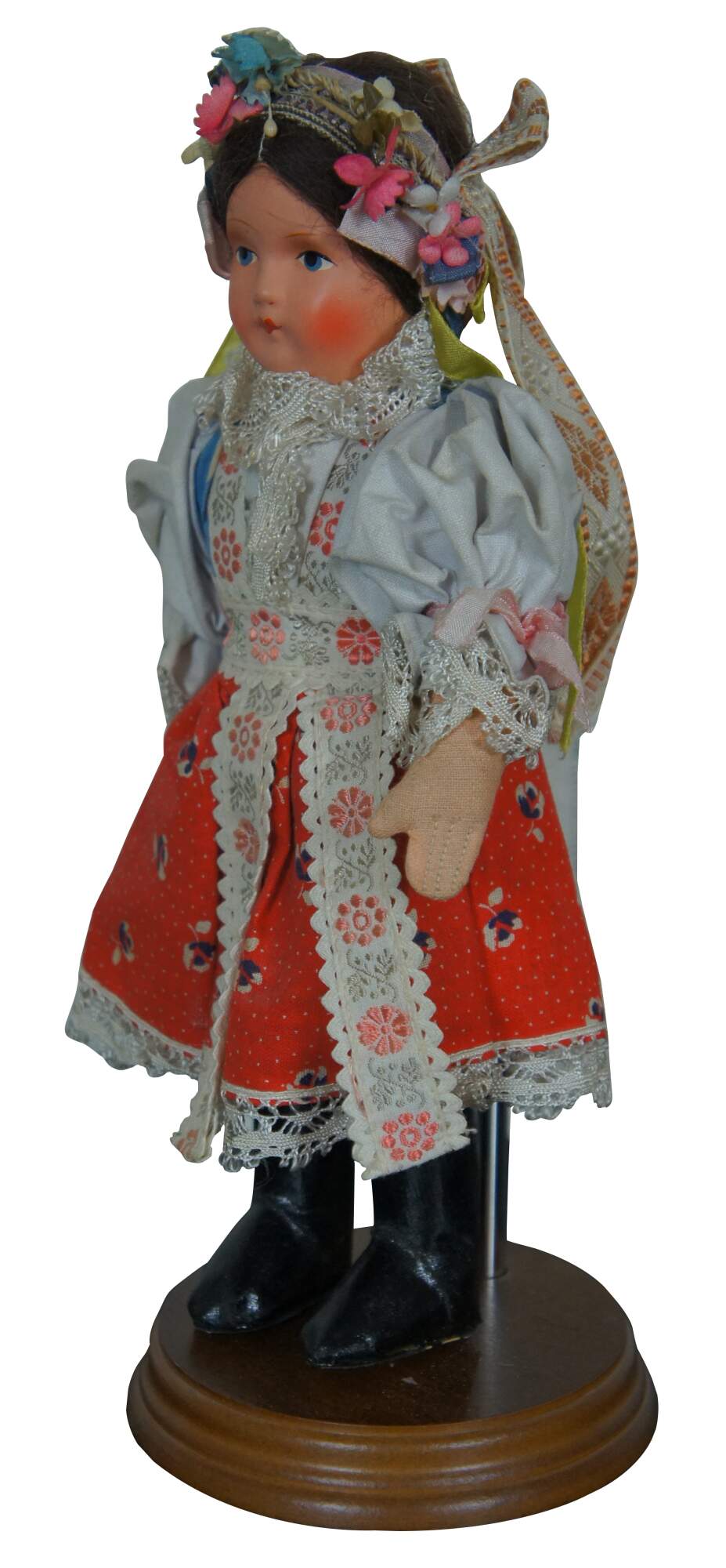 Vintage cloth and celluloid doll with hand painted face, dressed in traditional Czech folk costume, crafted by Slip – Slovak Home Industry, Made in Czechoslovakia. Includes Bard’s wood and chrome display stand.