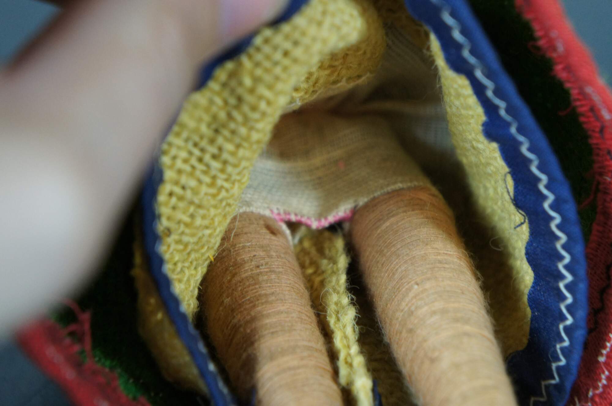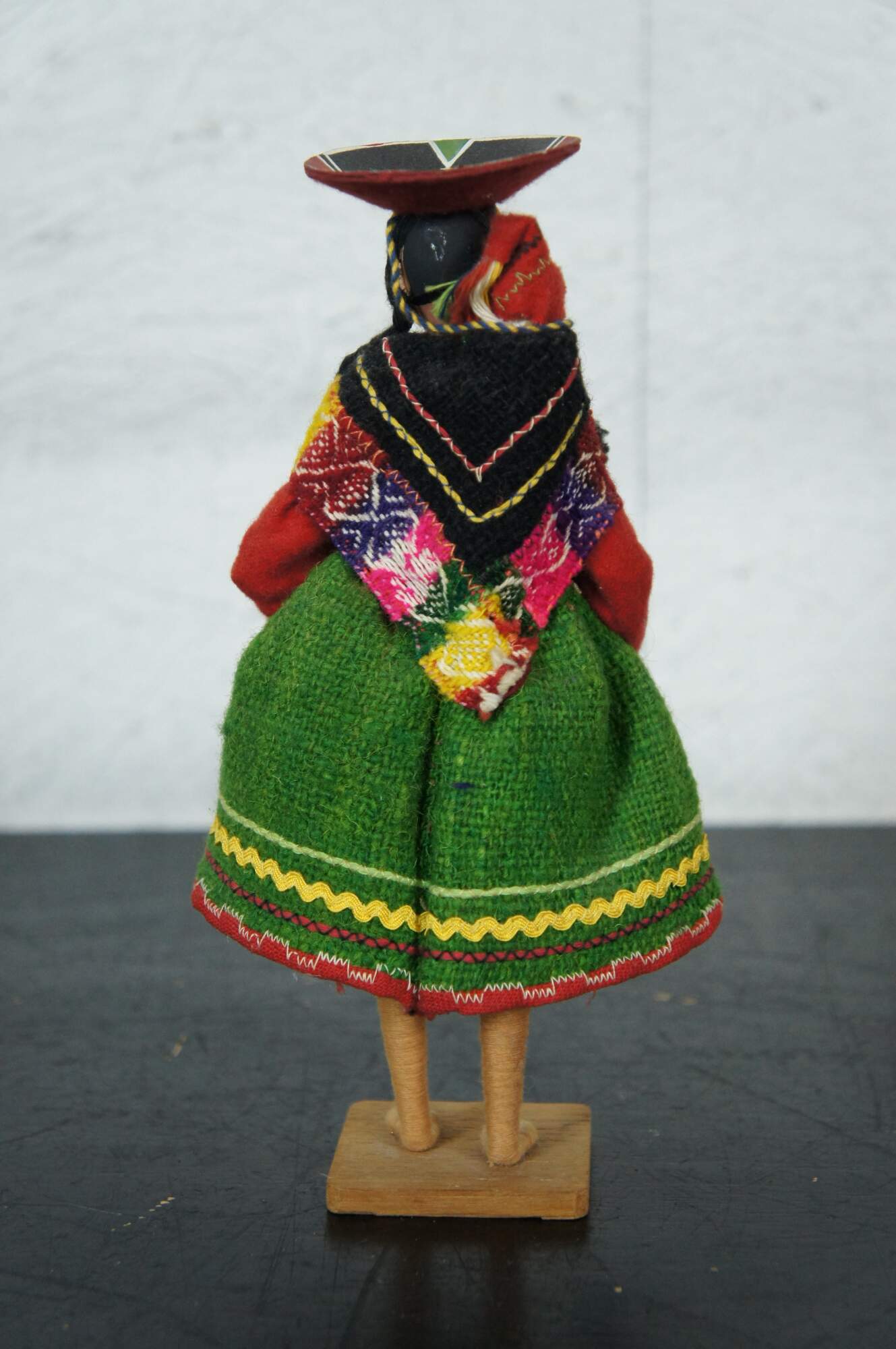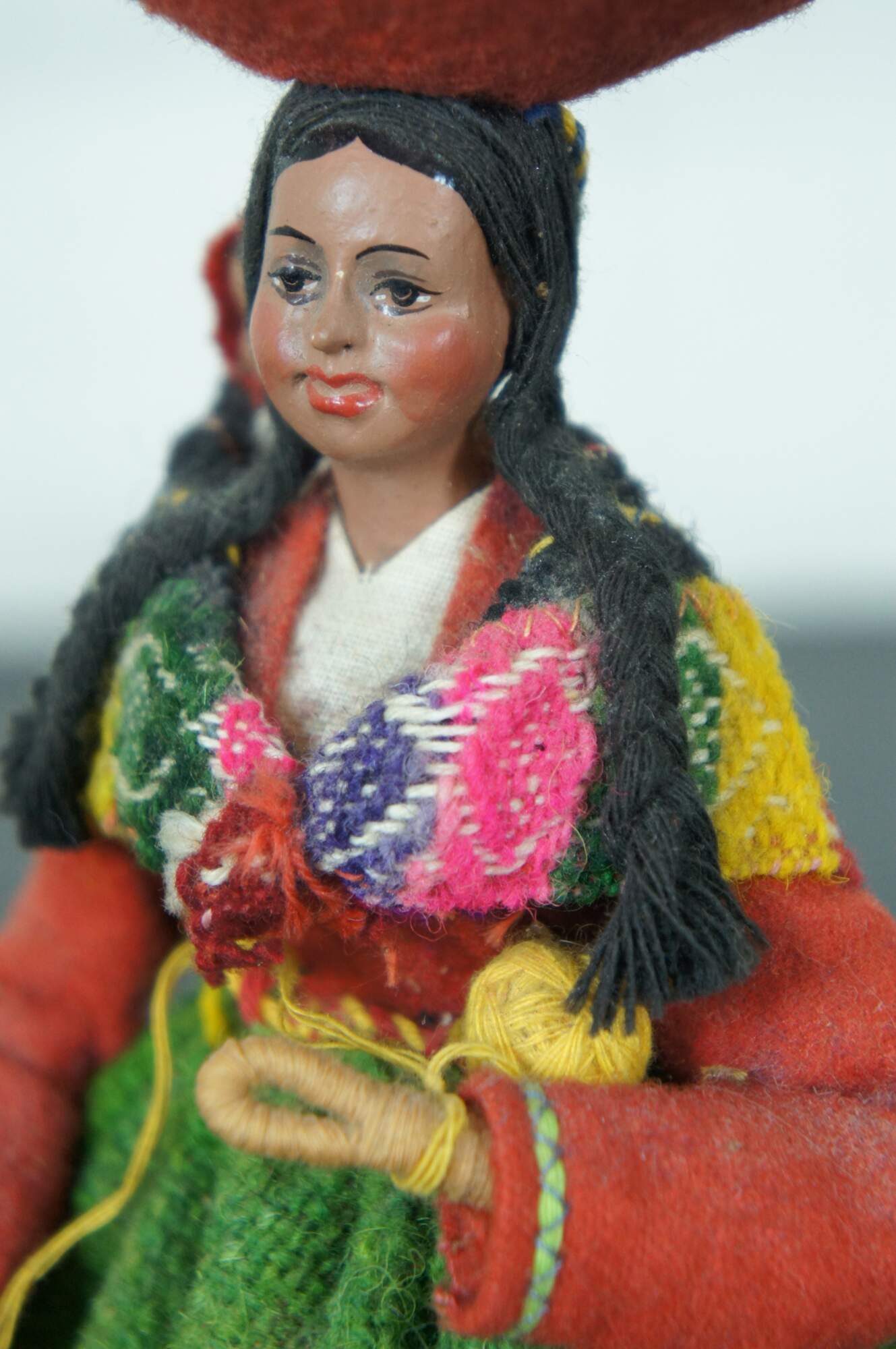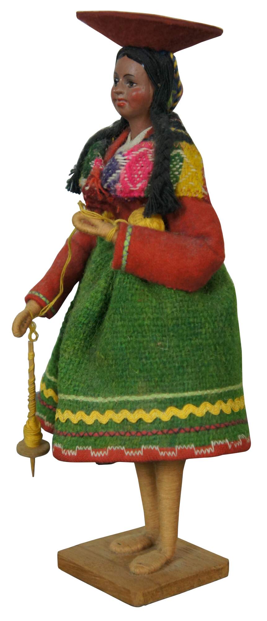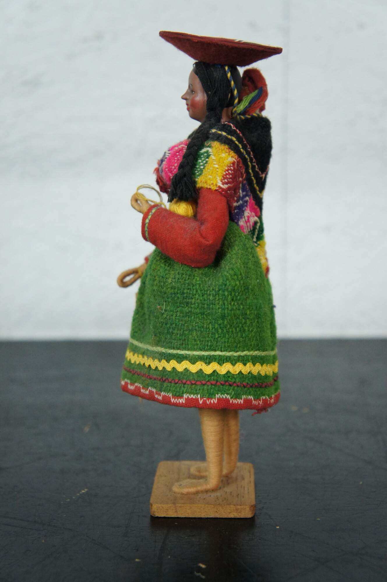 Vintage Peruvian folk art doll in the shape of a woman with an infant on her back, holding a drop spindle, hand made by the Artesanias de Celia de Alvarez, of Cuzco, Peru.