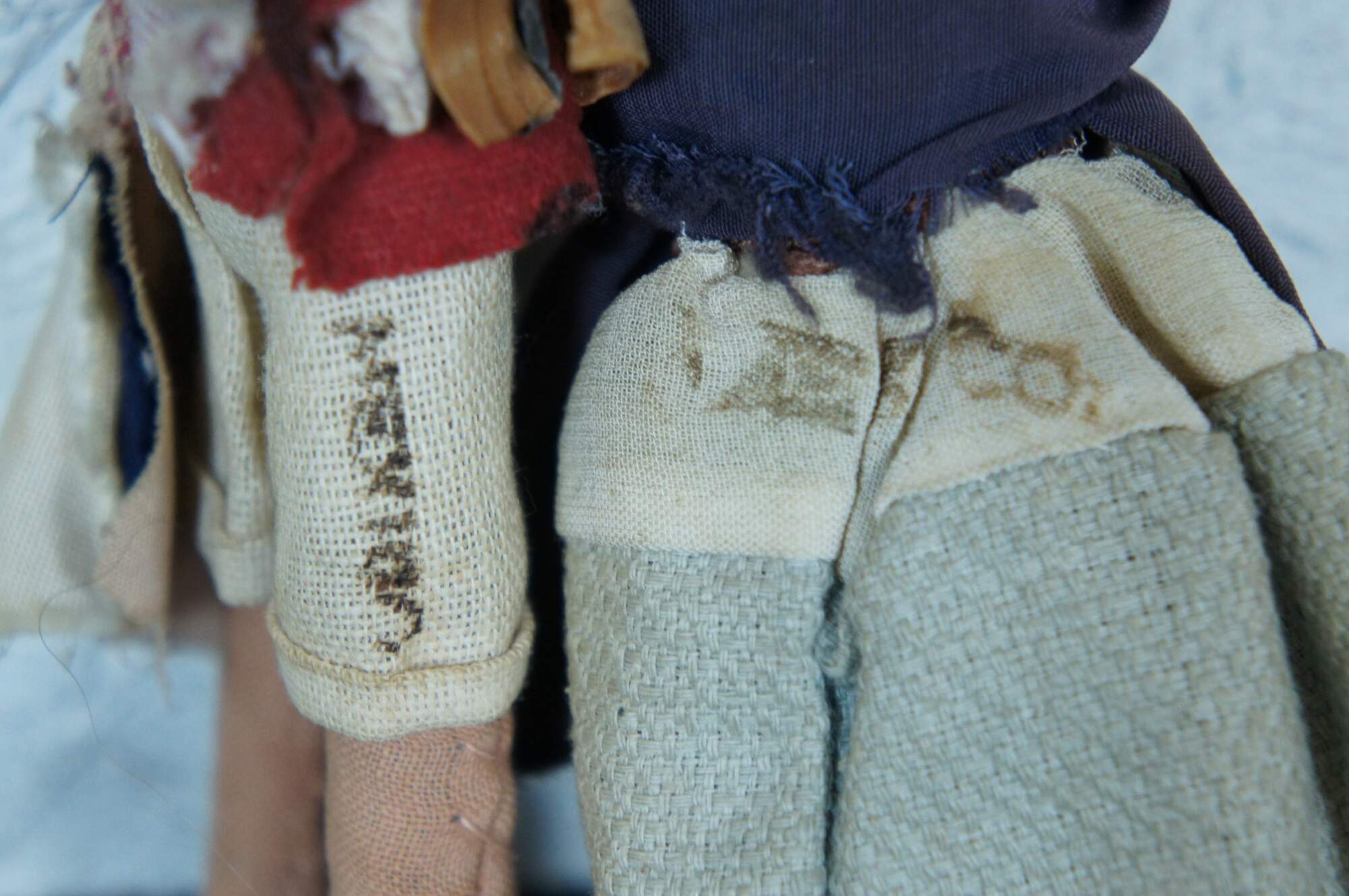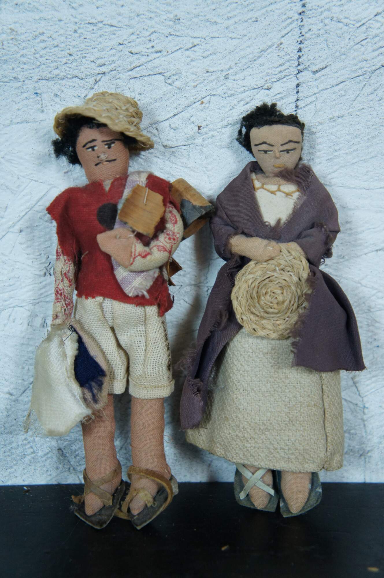 Vintage Mexican punched tin shadow box frame or nicho with glass front, containing a pair of South American folk art cloth dolls.