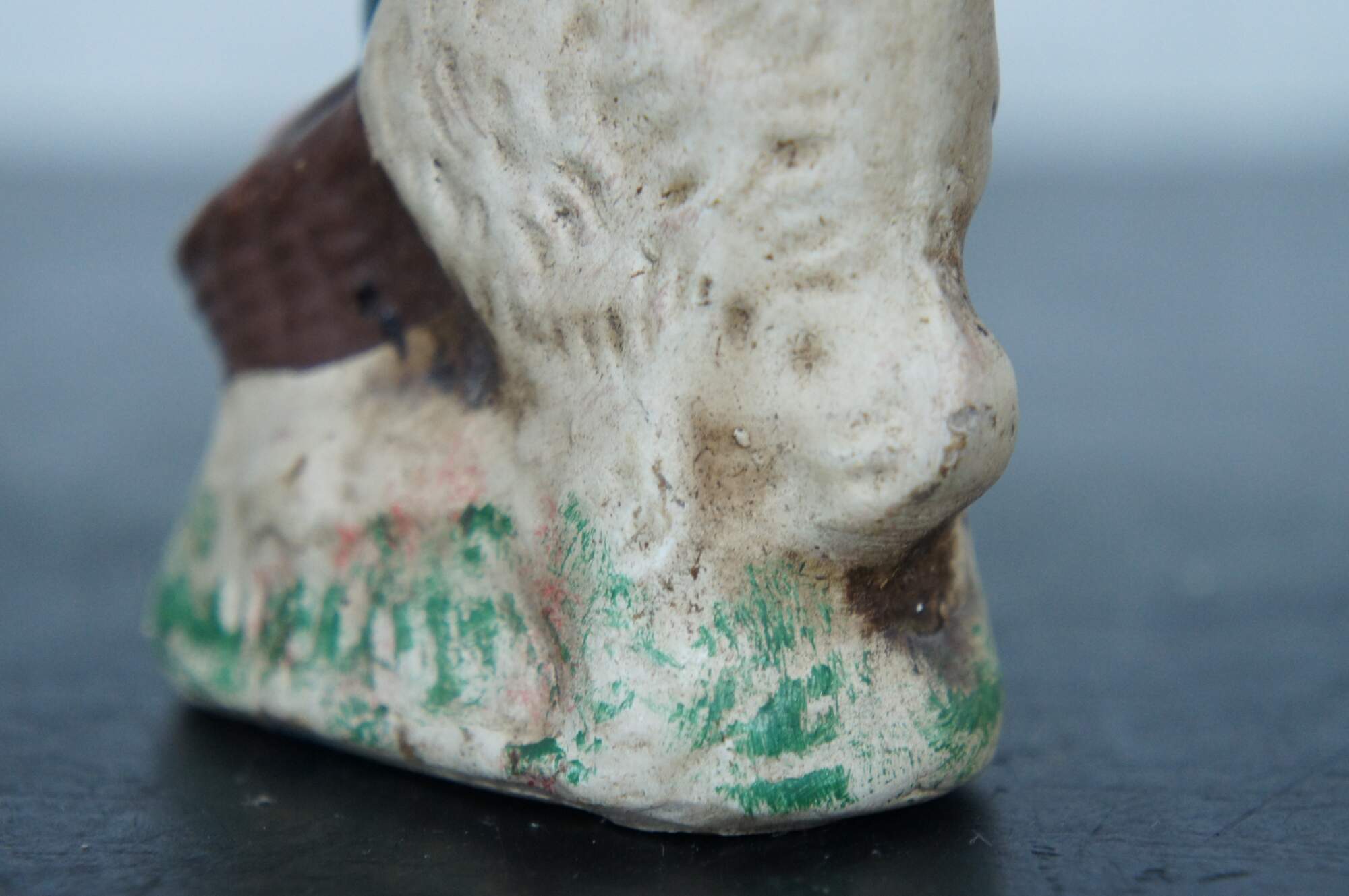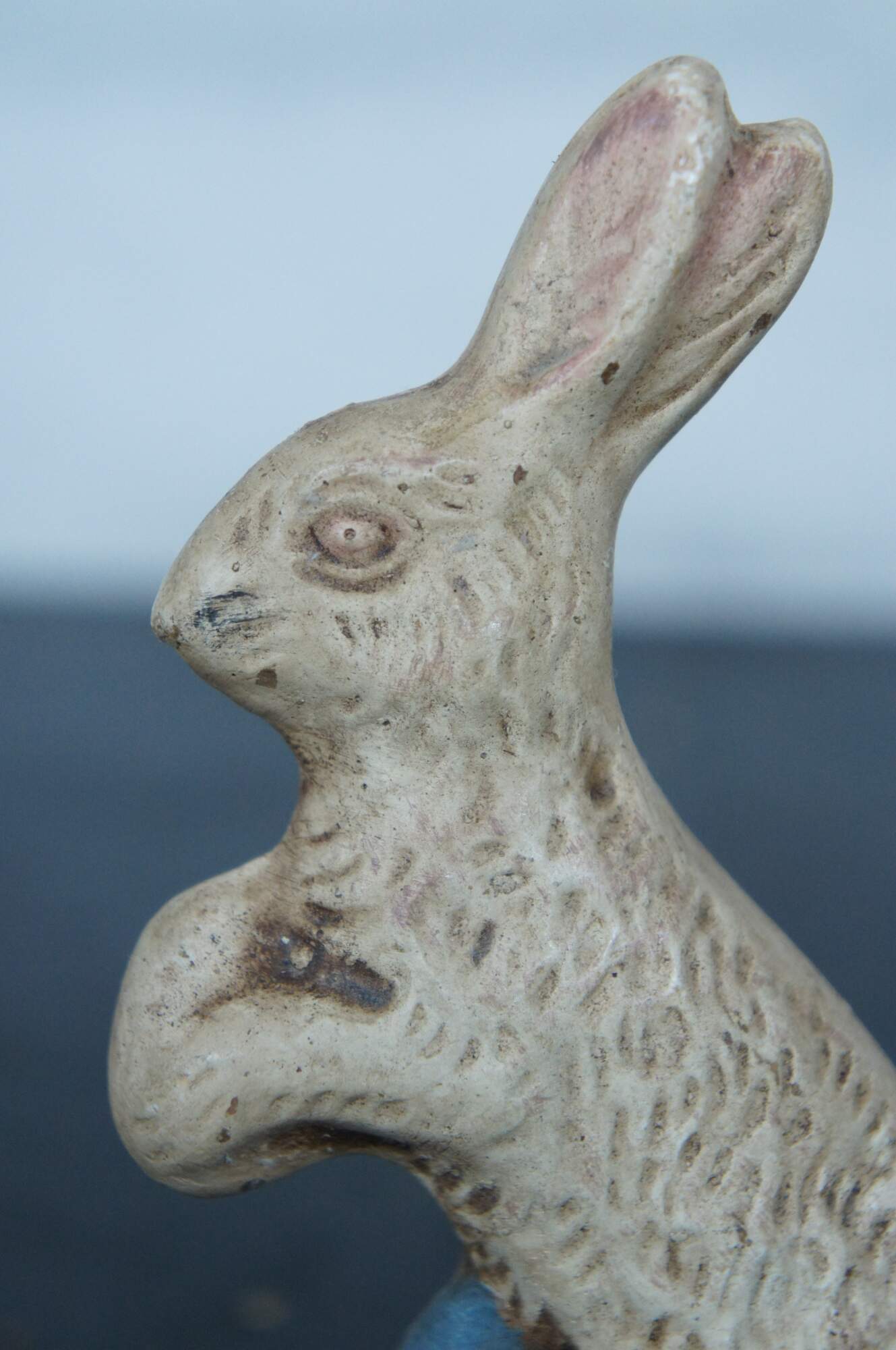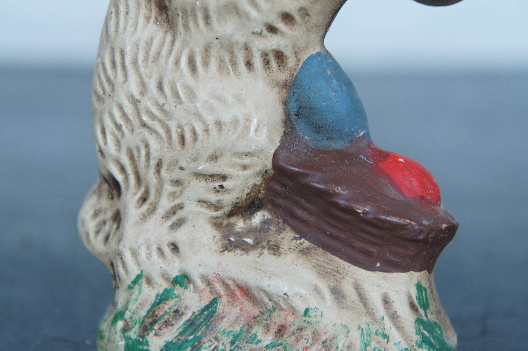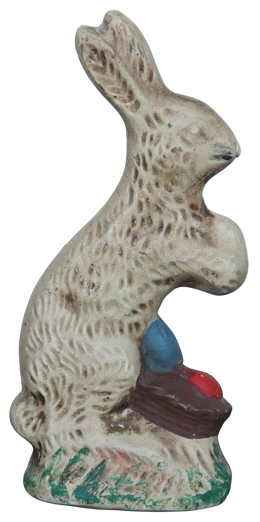 Early to mid 20th century chalkware Easter Rabbit with a basket of eggs, shaped as if formed in a chocolate mold.