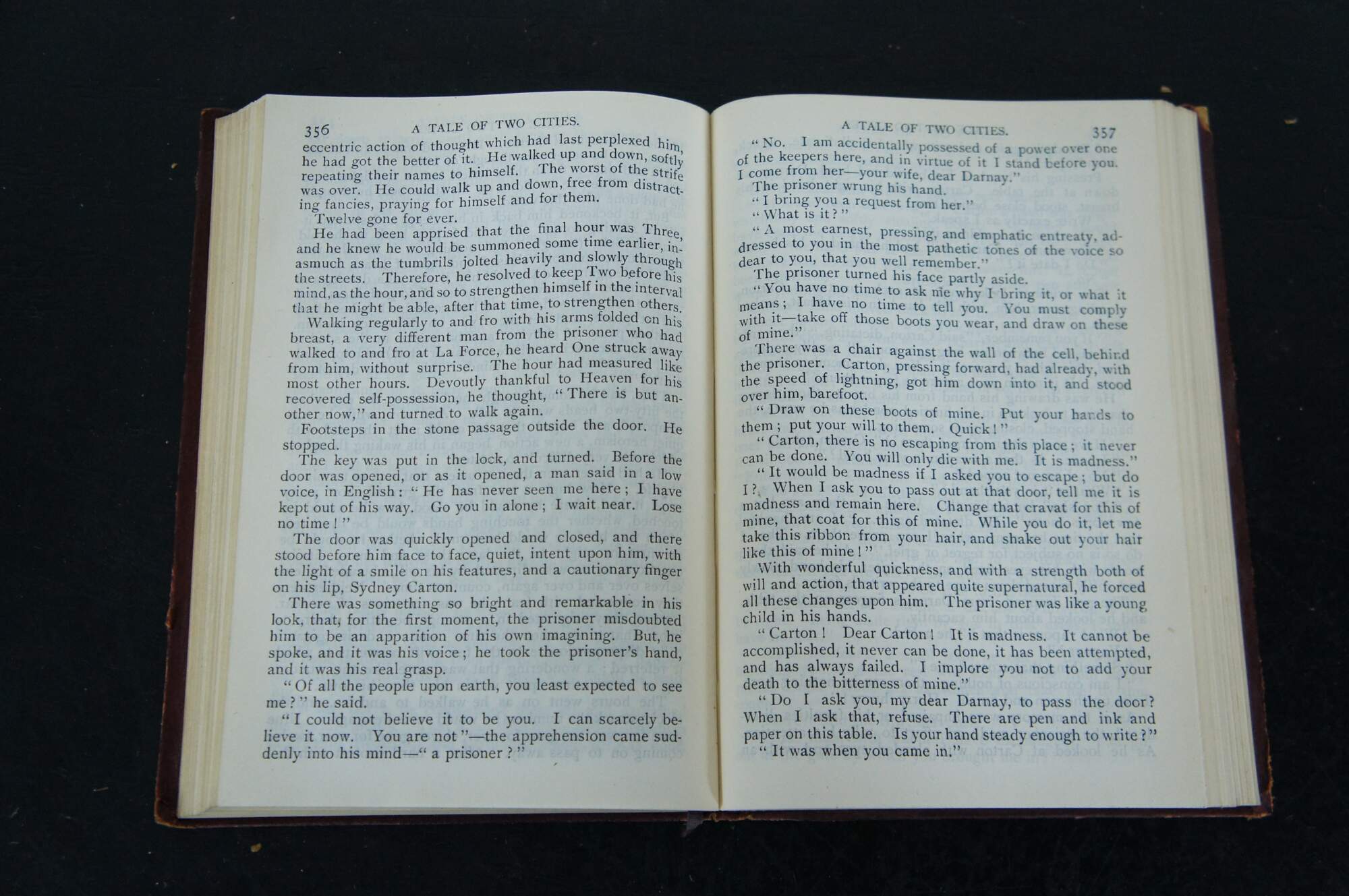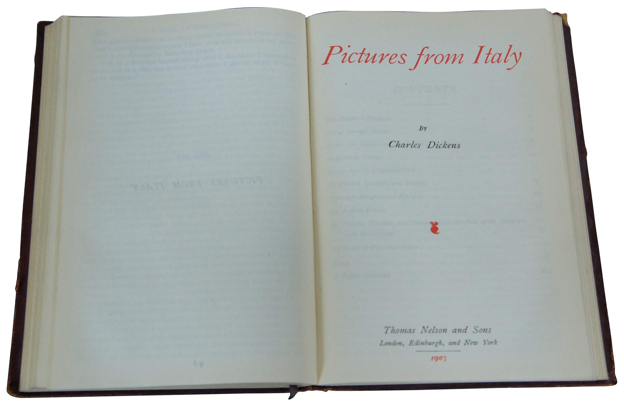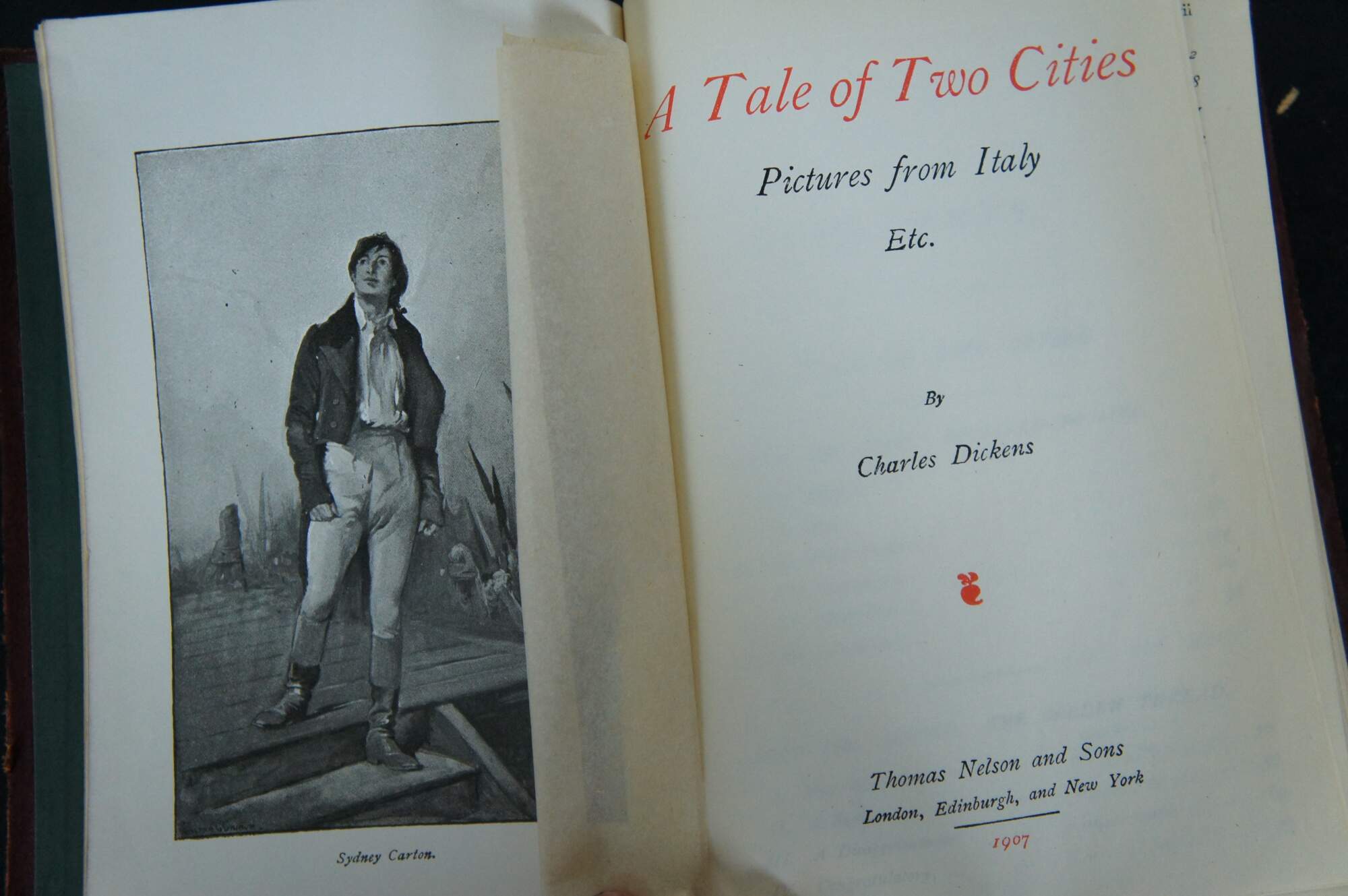 Antique red leather soft cover copy of “A Tales of Two Cities, Pictures from Italy, and Master Humphrey’s Clock” by Charles Dickens, published by Thomas Nelson and Sons, 1907.
