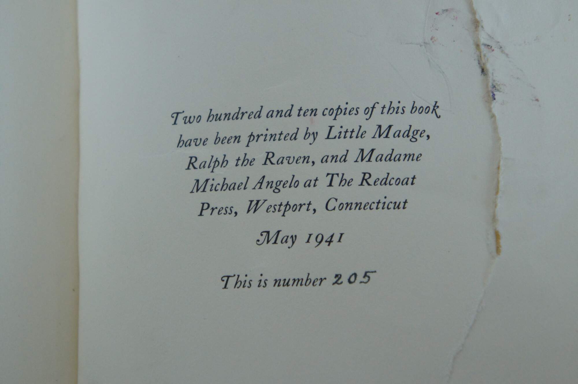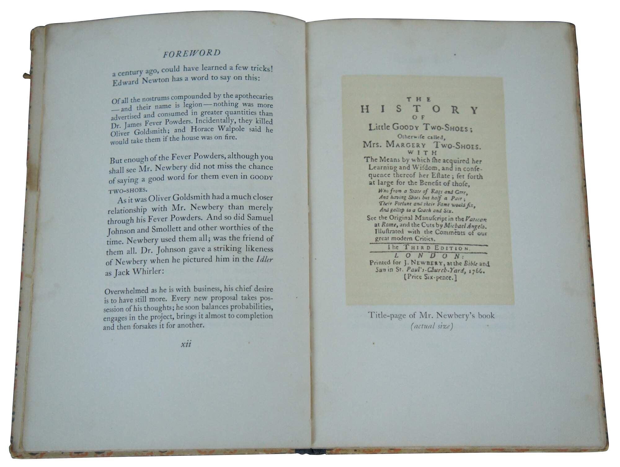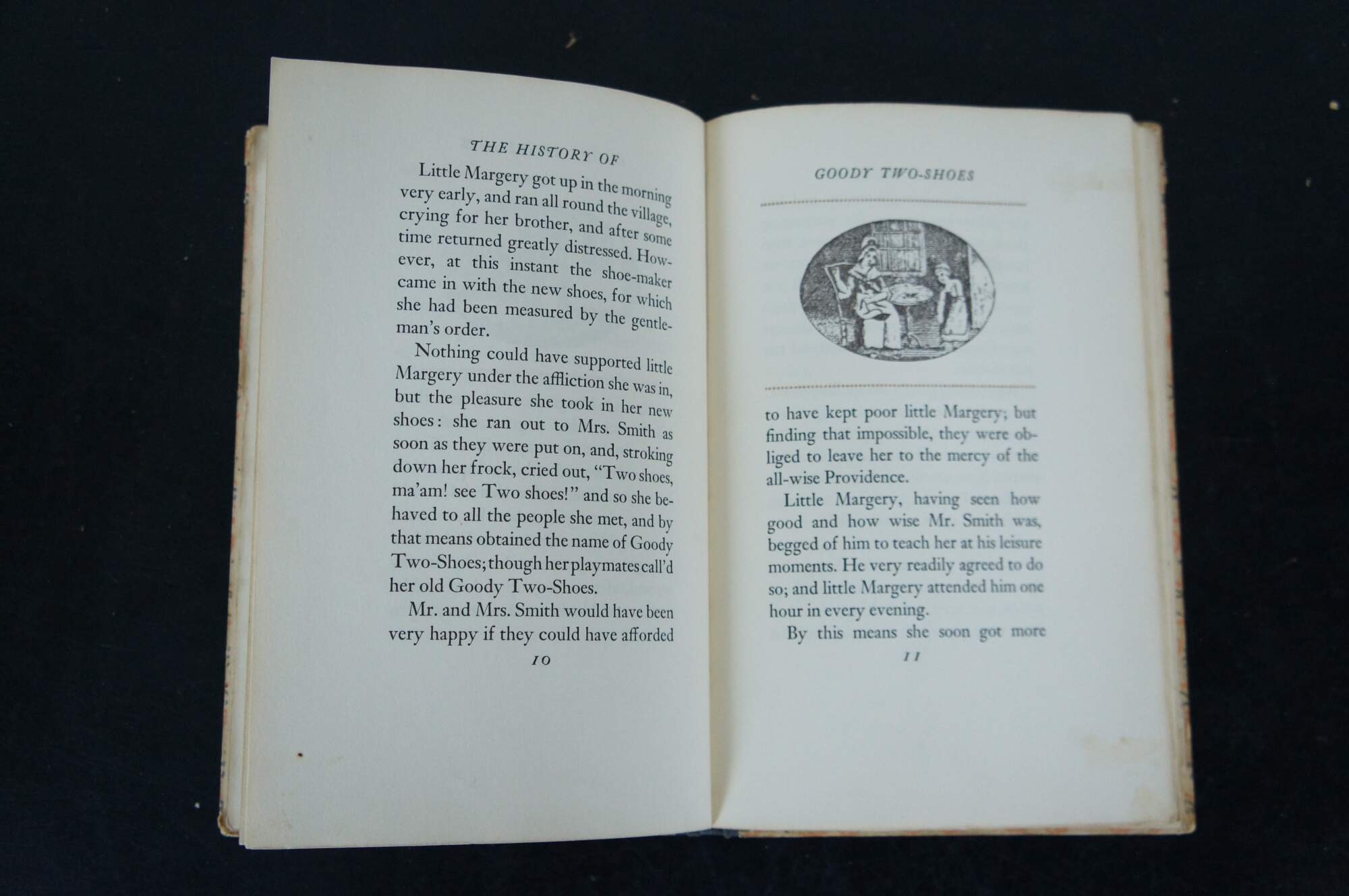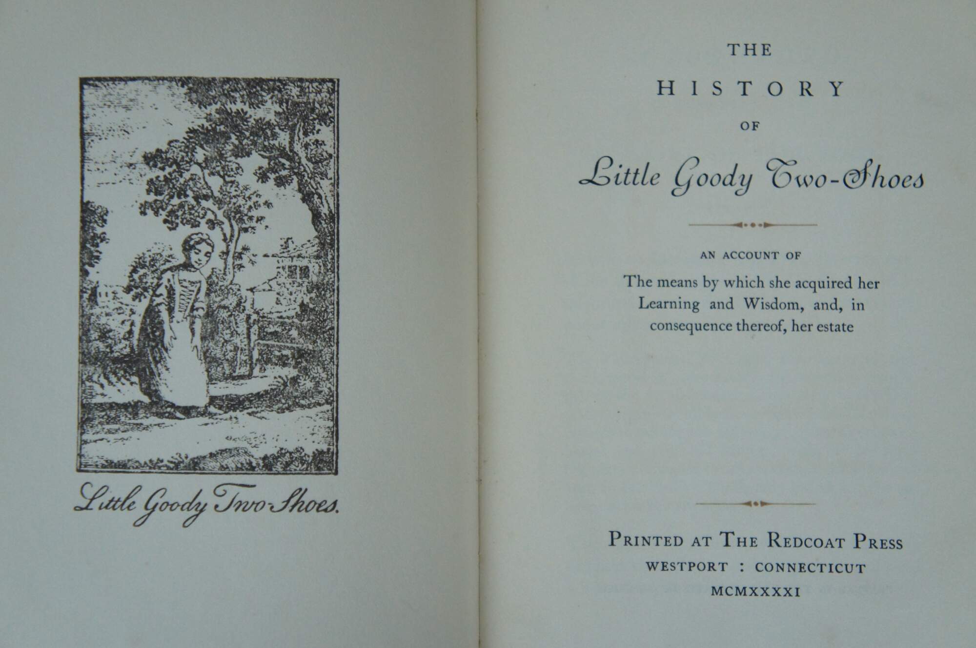 Antique hard cover copy of “The History of Little Goody Two-Shoes,” a reproduction of a story first printed in 1766, printed by Little Madge, Ralph the Raven, and Madame Michael Angelo at the Redcoat Press, Westport, Connecticut, May 1941, number 205 of 210 copies.