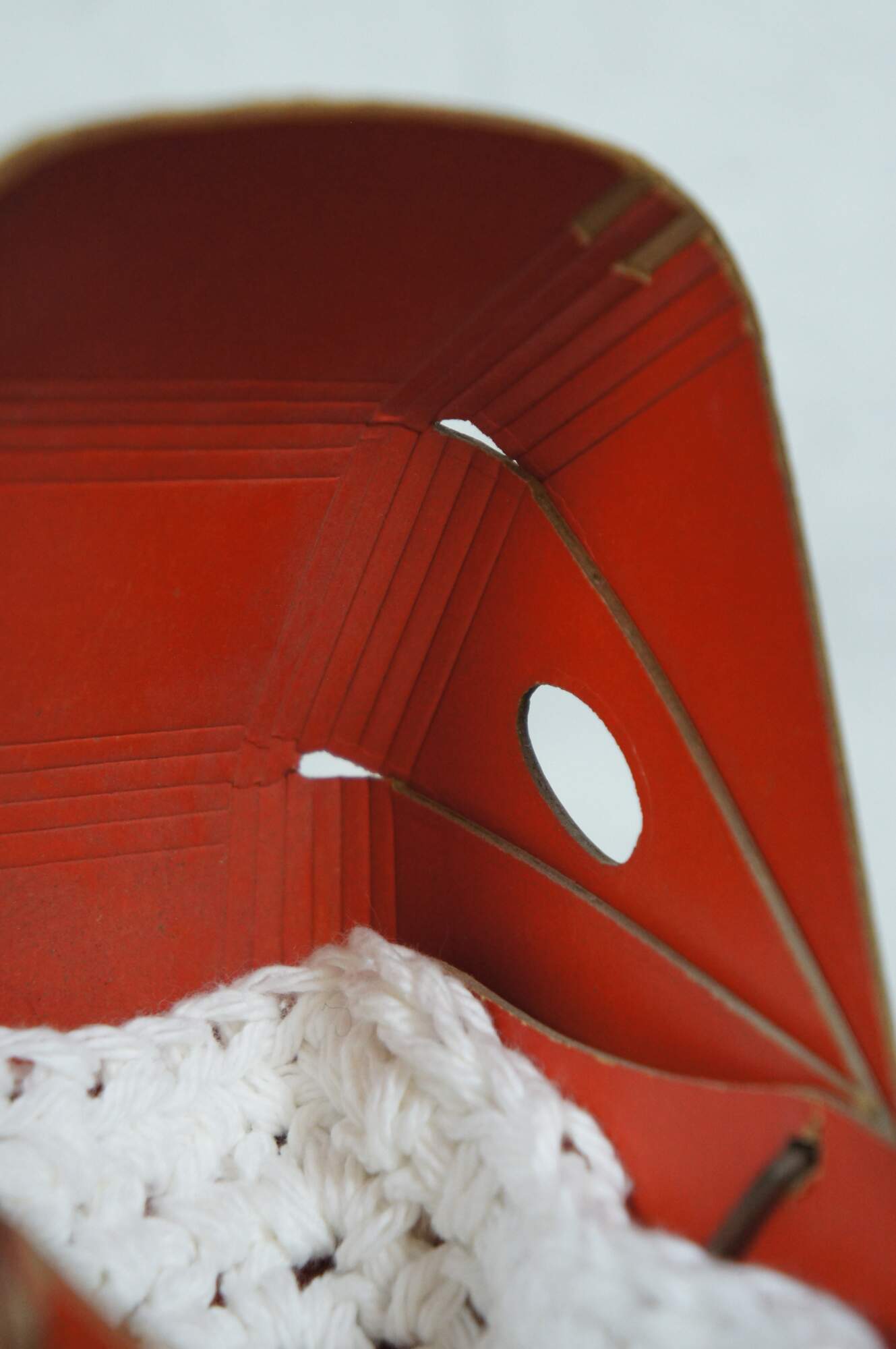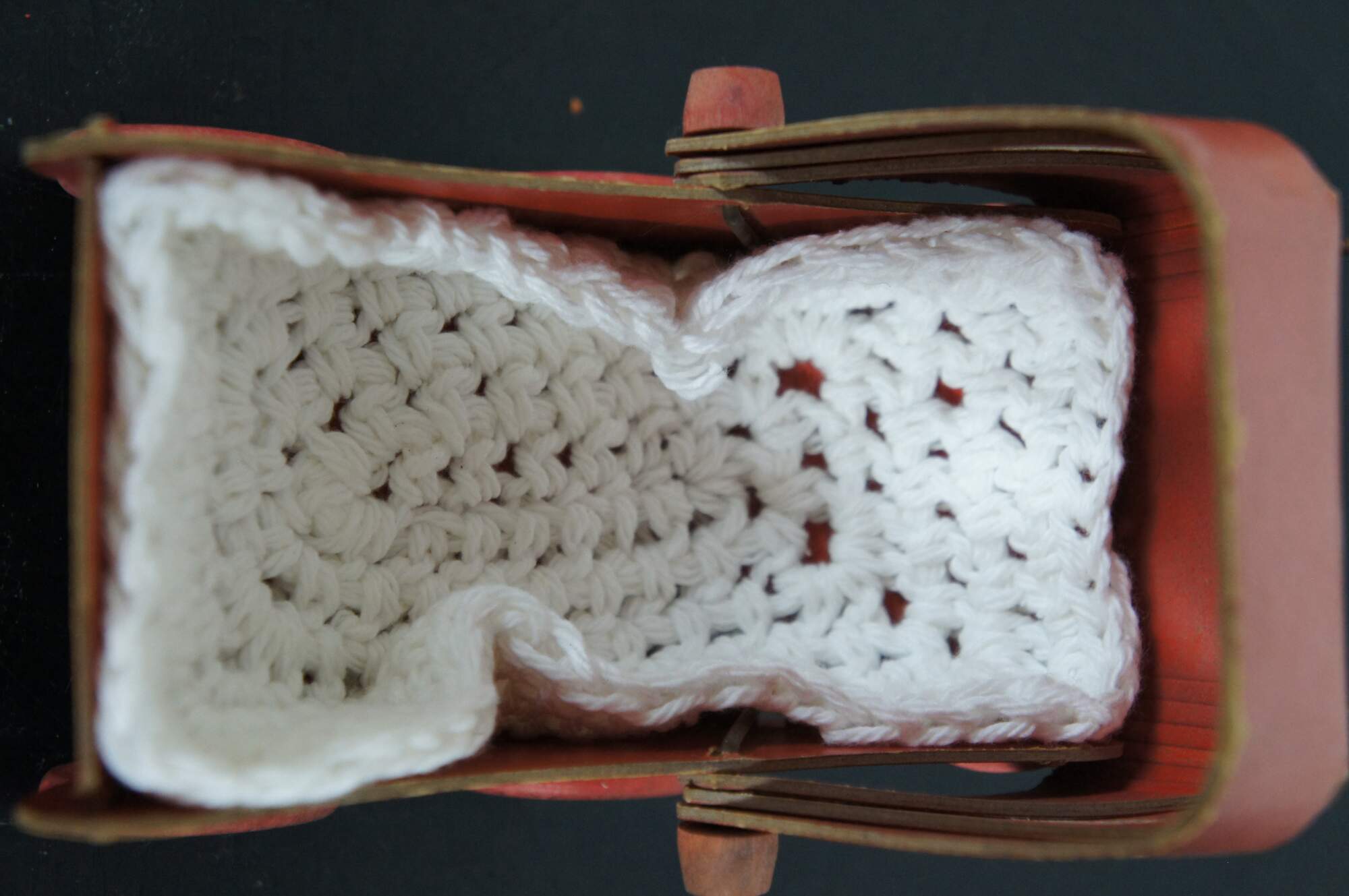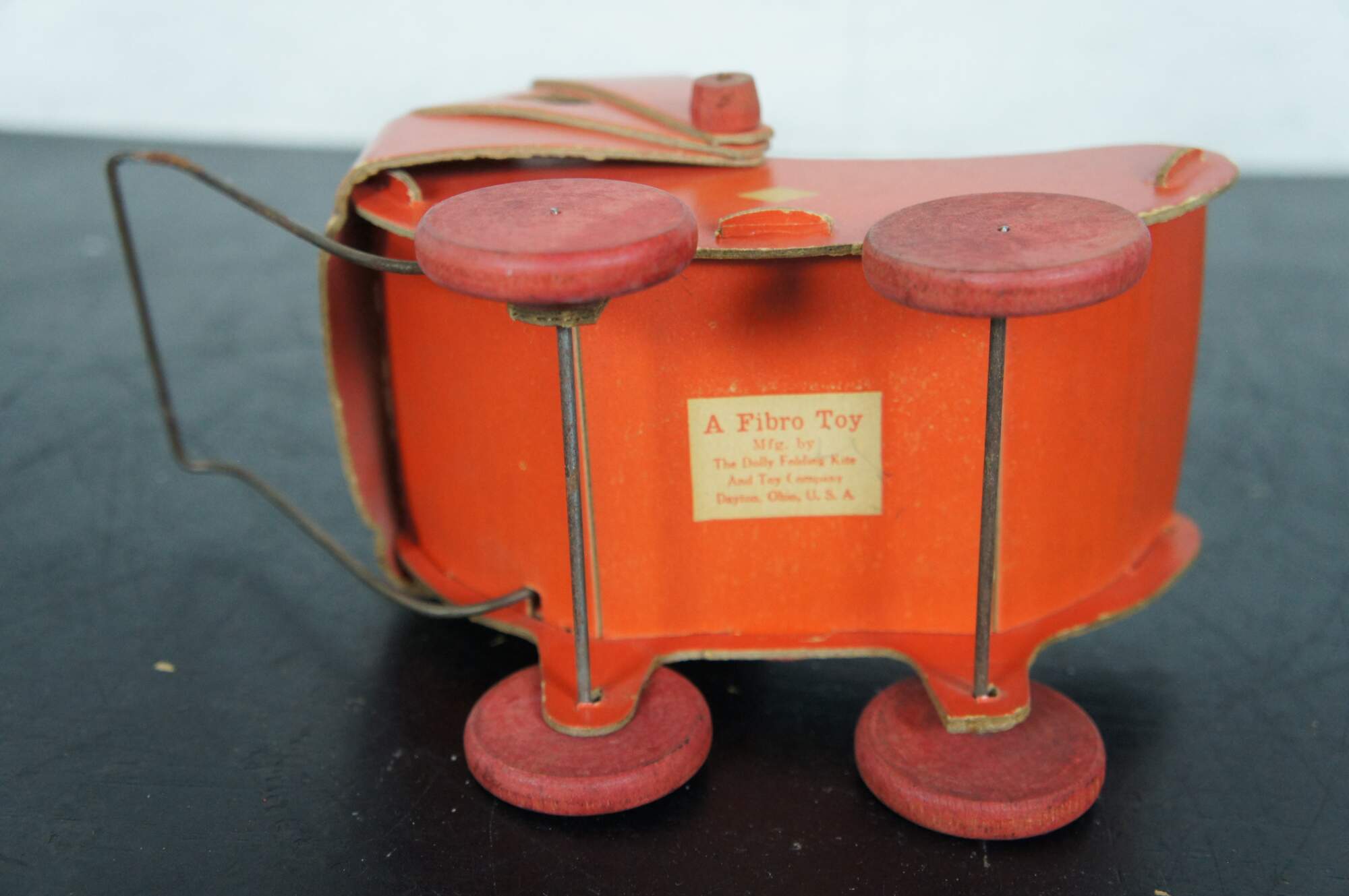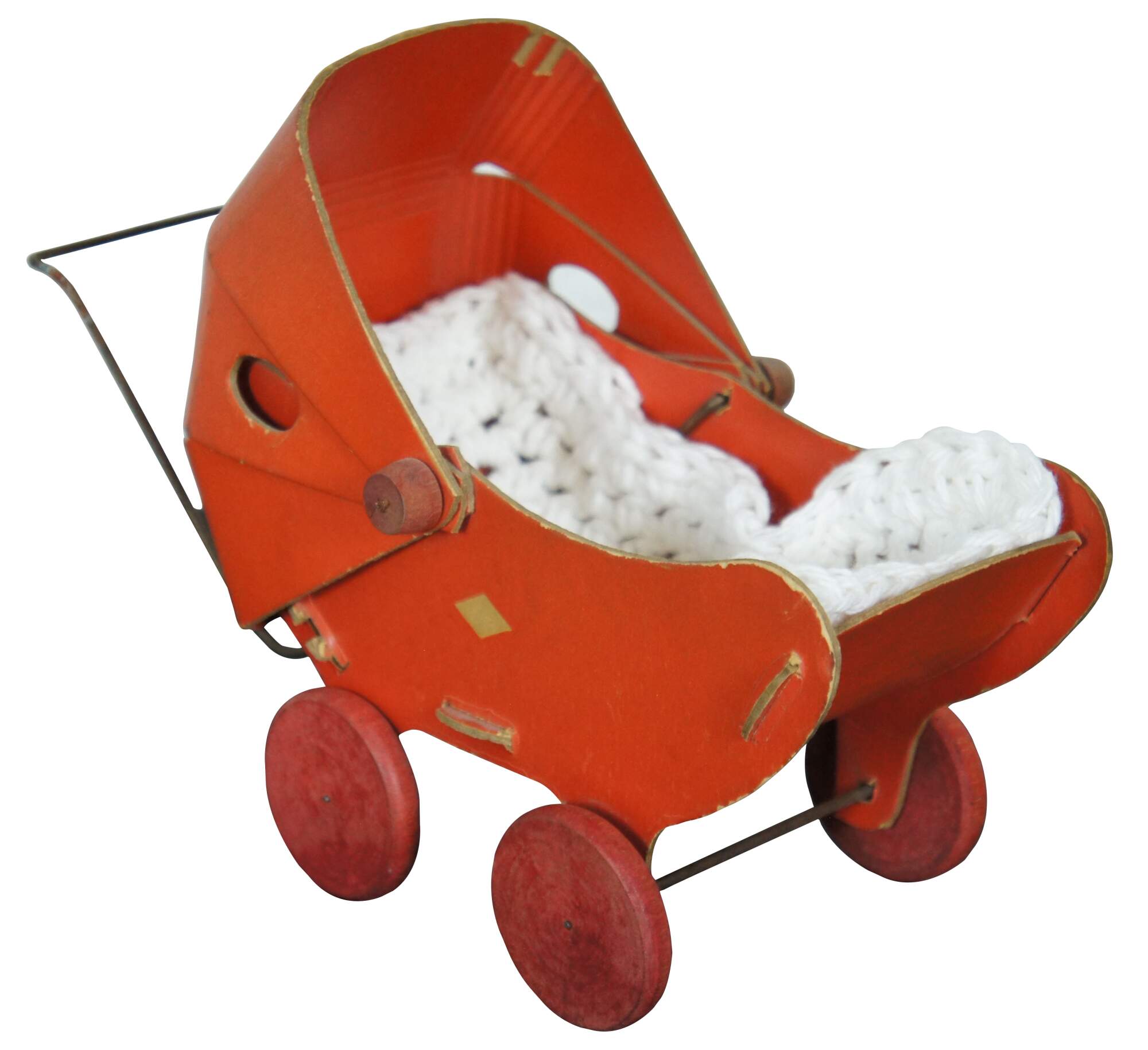 Antique 1930s red cardboard baby doll stroller Easter candy container with rotating hood and wooden wheels, a Fibro Toy by The Dolly Folding Kite and Toy Company of Dayton, Ohio.