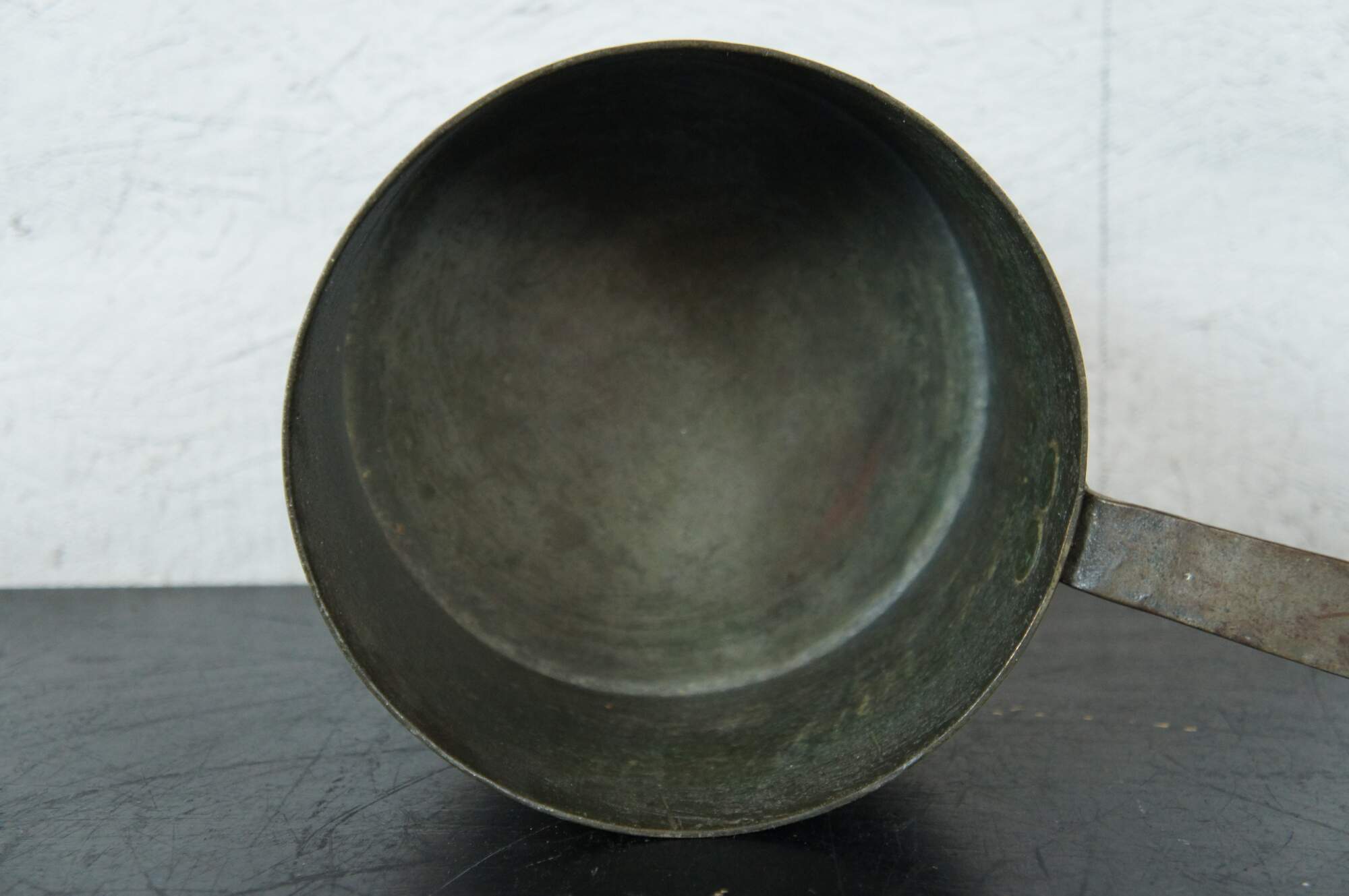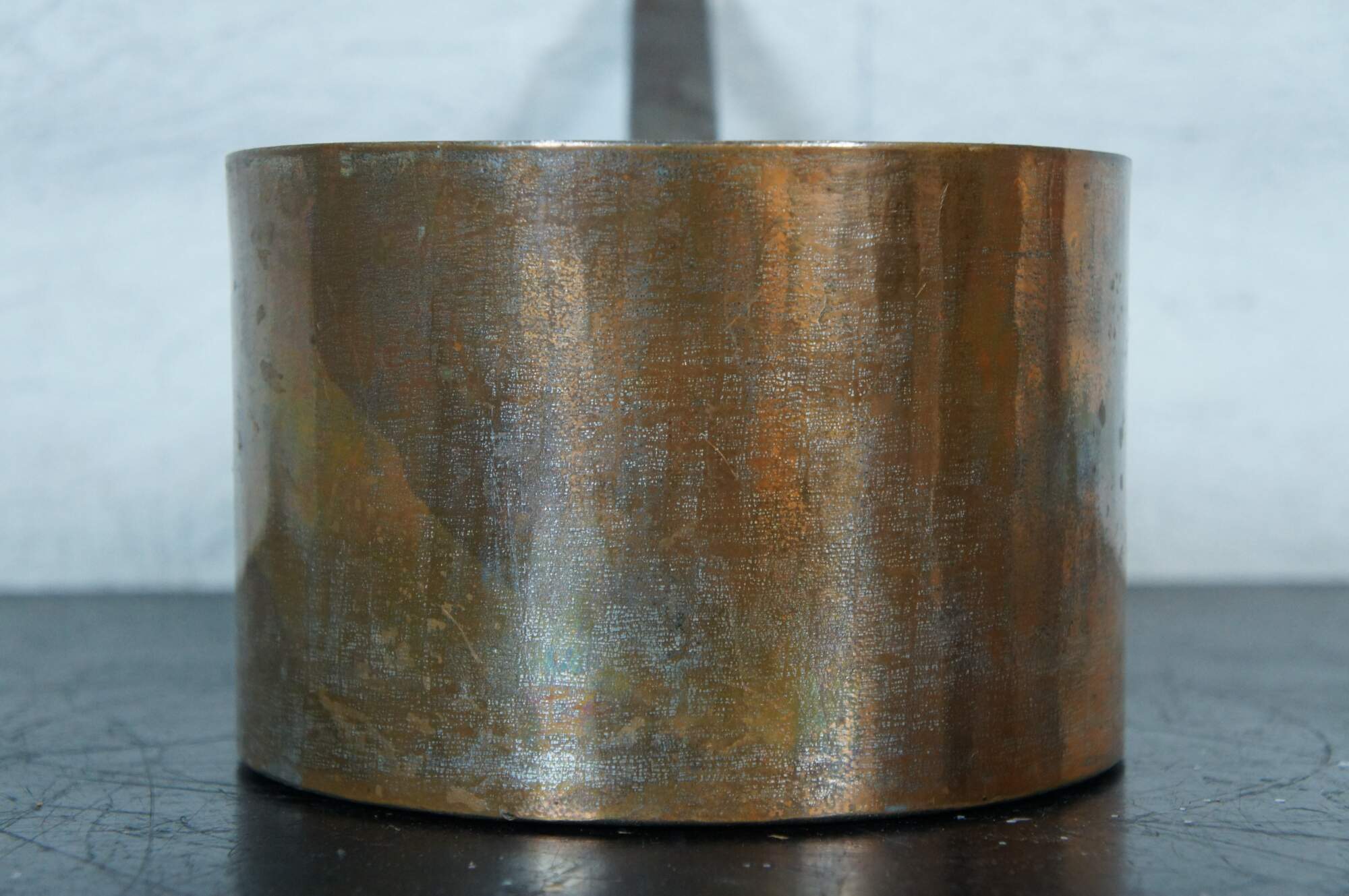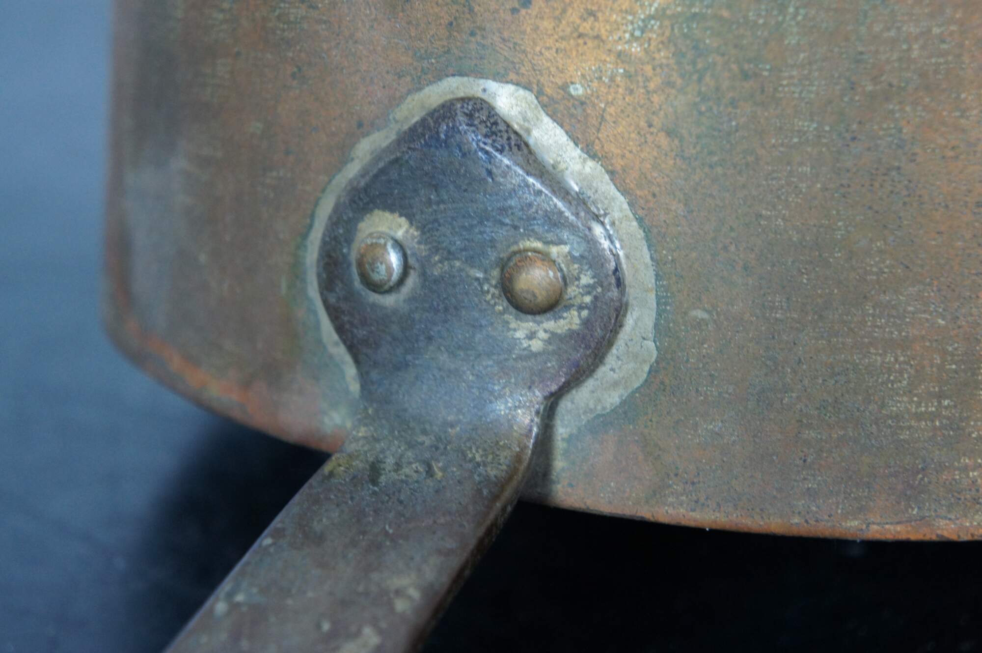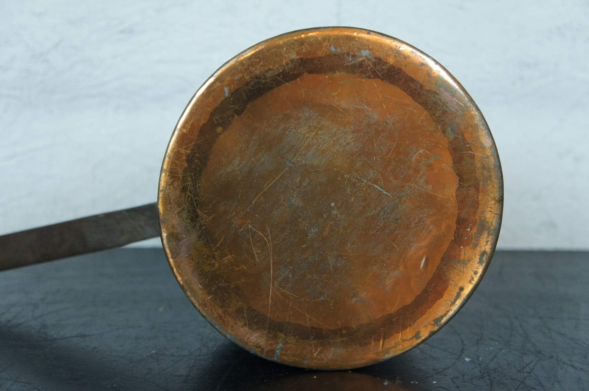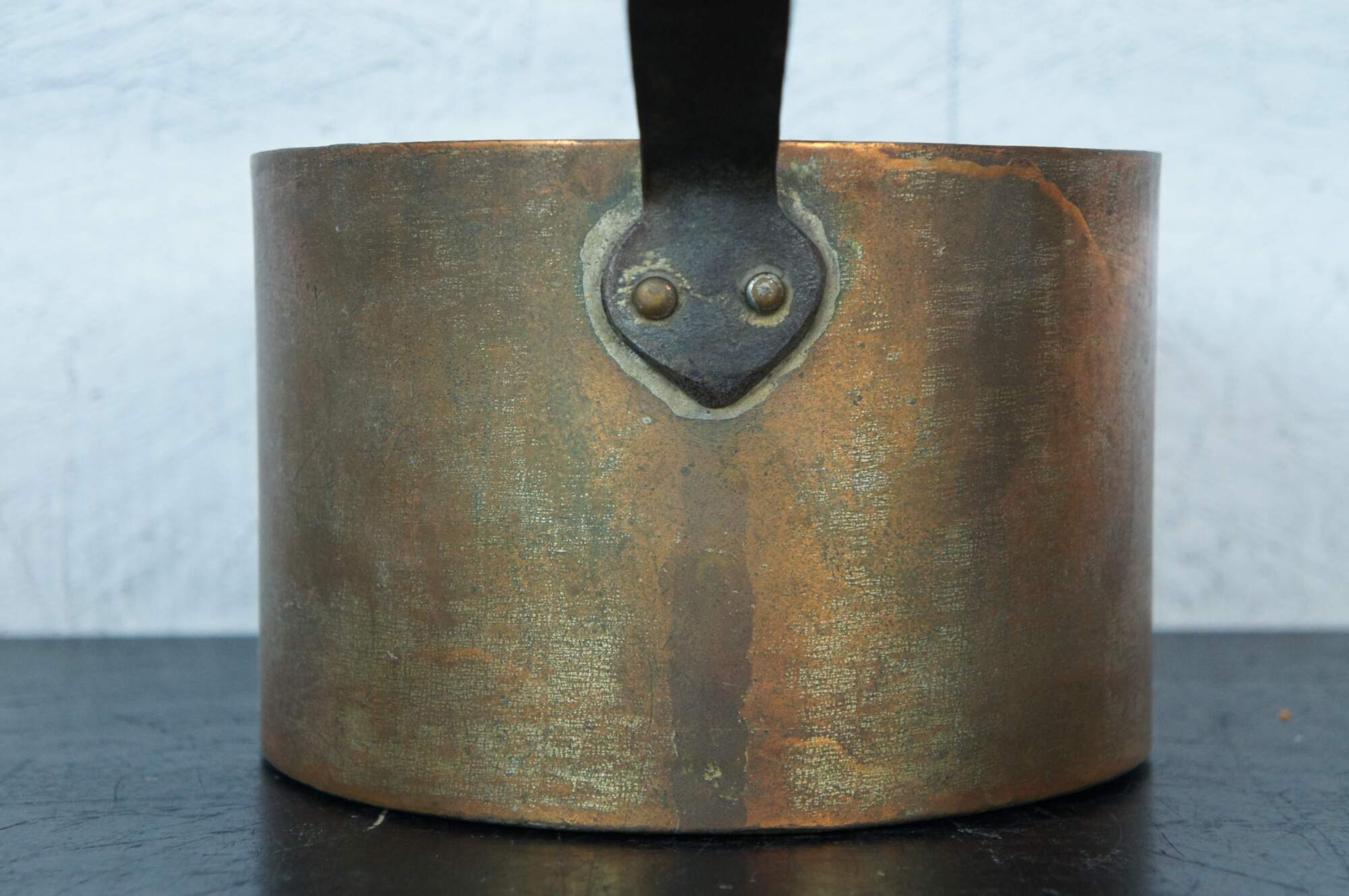 Antique copper sauce pan with iron handle; possibly marked with an M at the base of the handle.