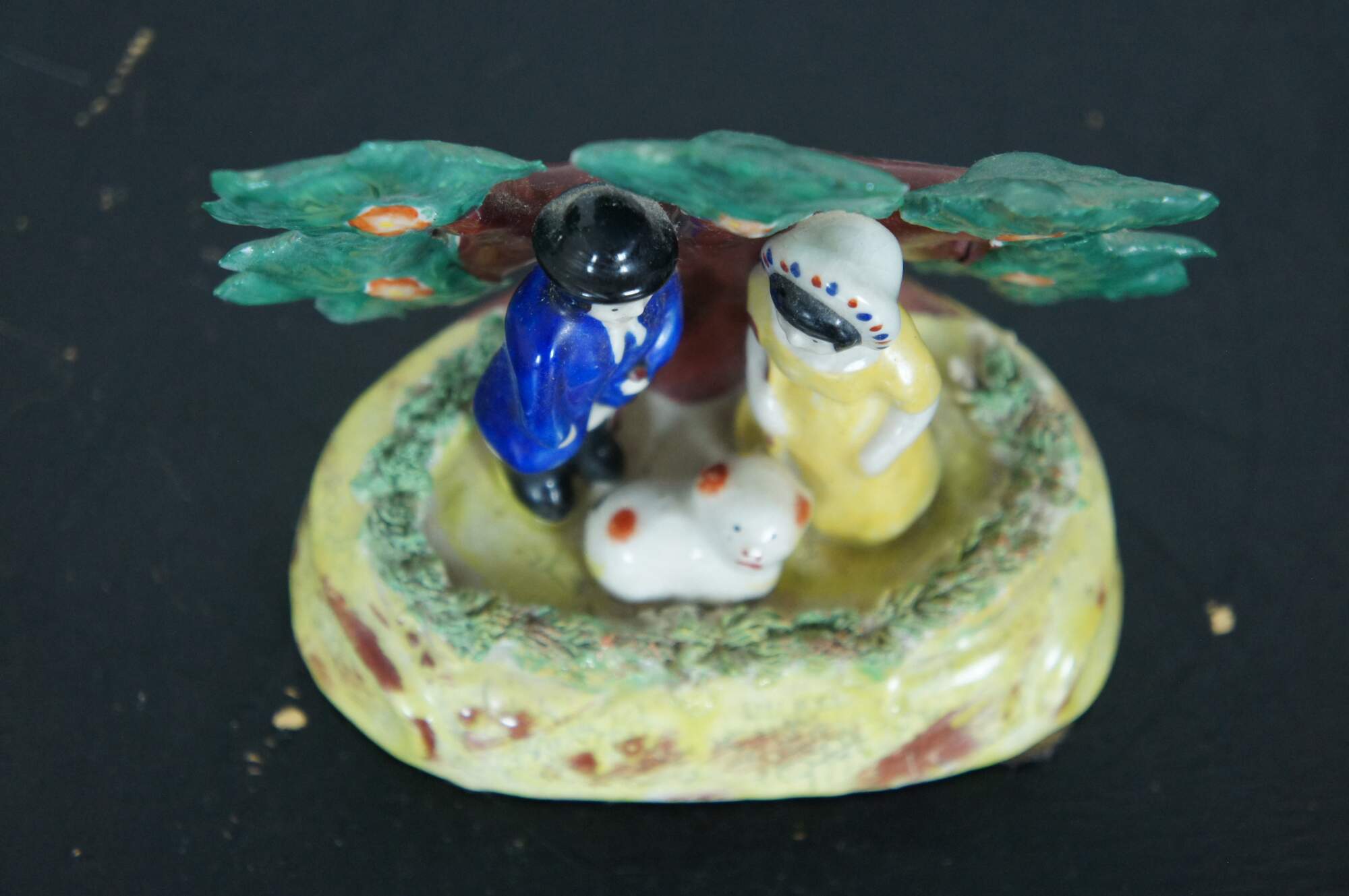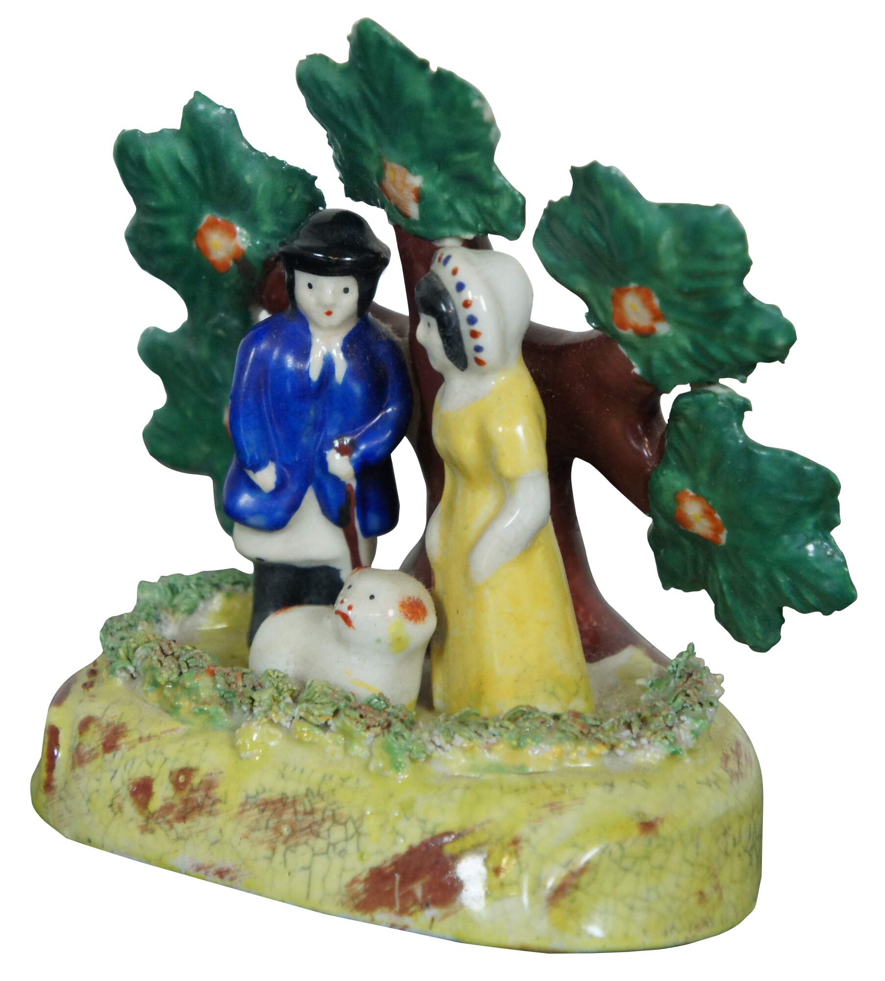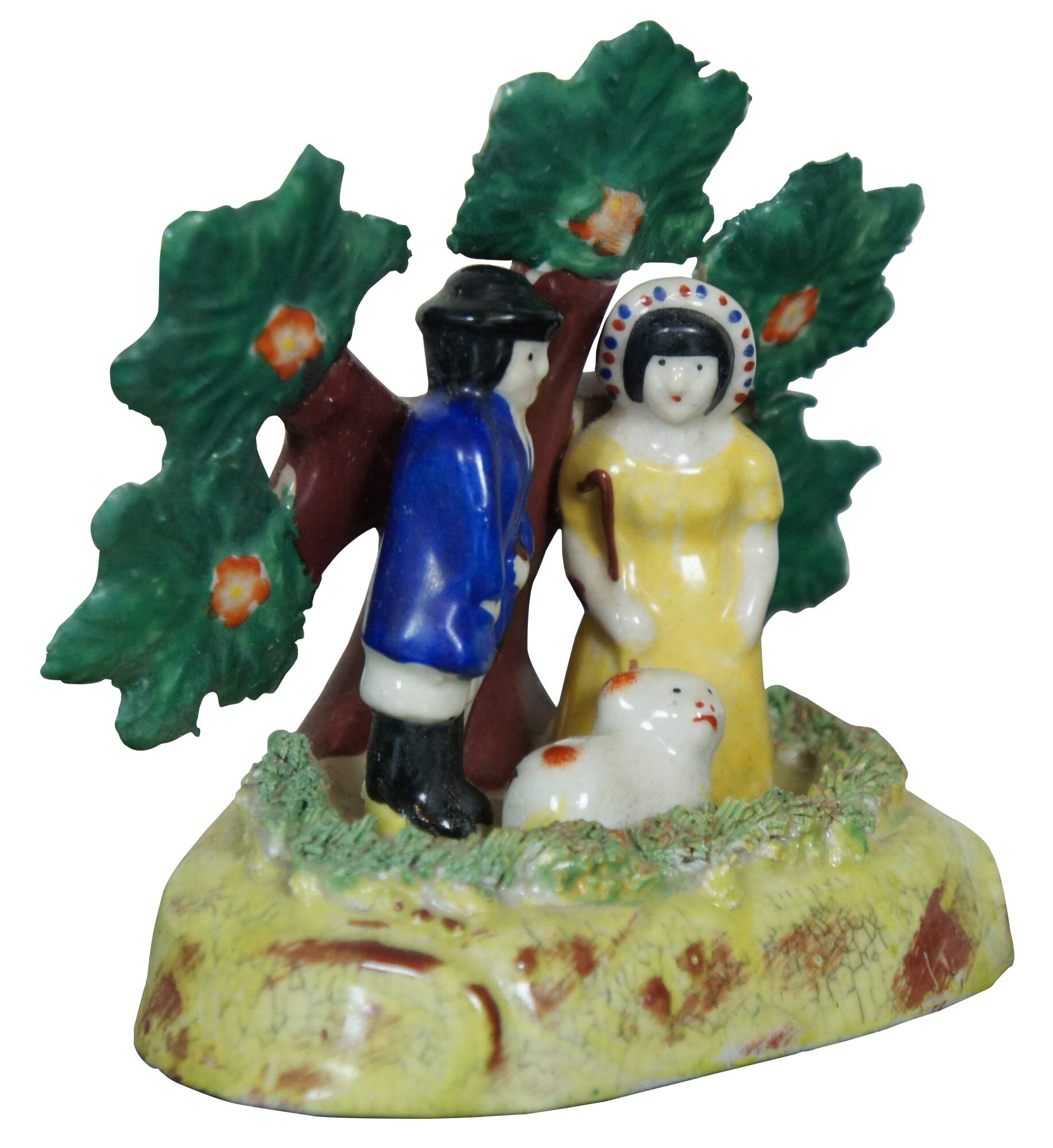 Antique early English Staffordshire porcelain pearlware bocage group, showing male and female shepherds with a red and white lamb, standing in front of a flowering tree. Attributed to the James Dudson factory at Stoke on Trent, circa 1830-1860.