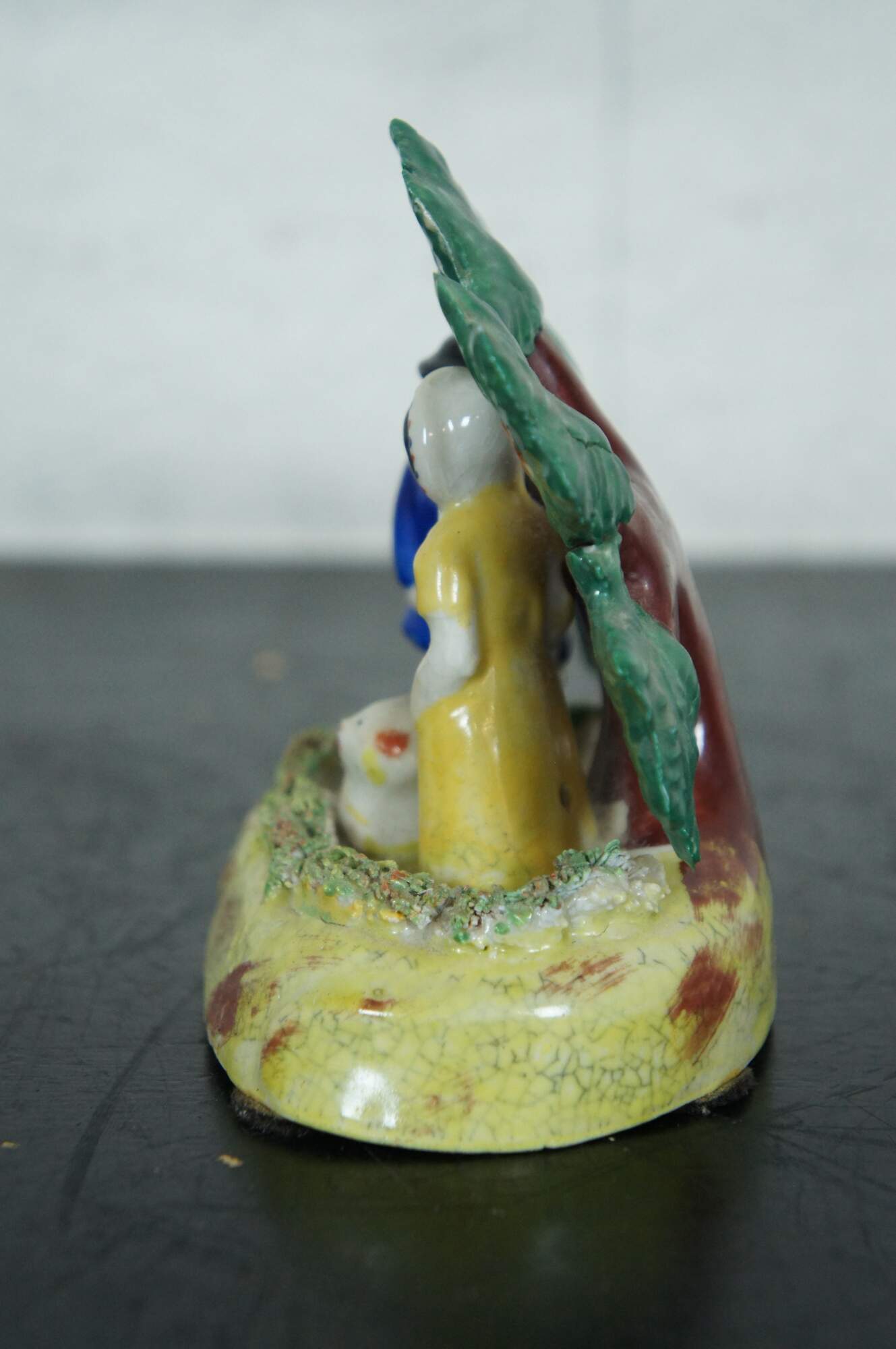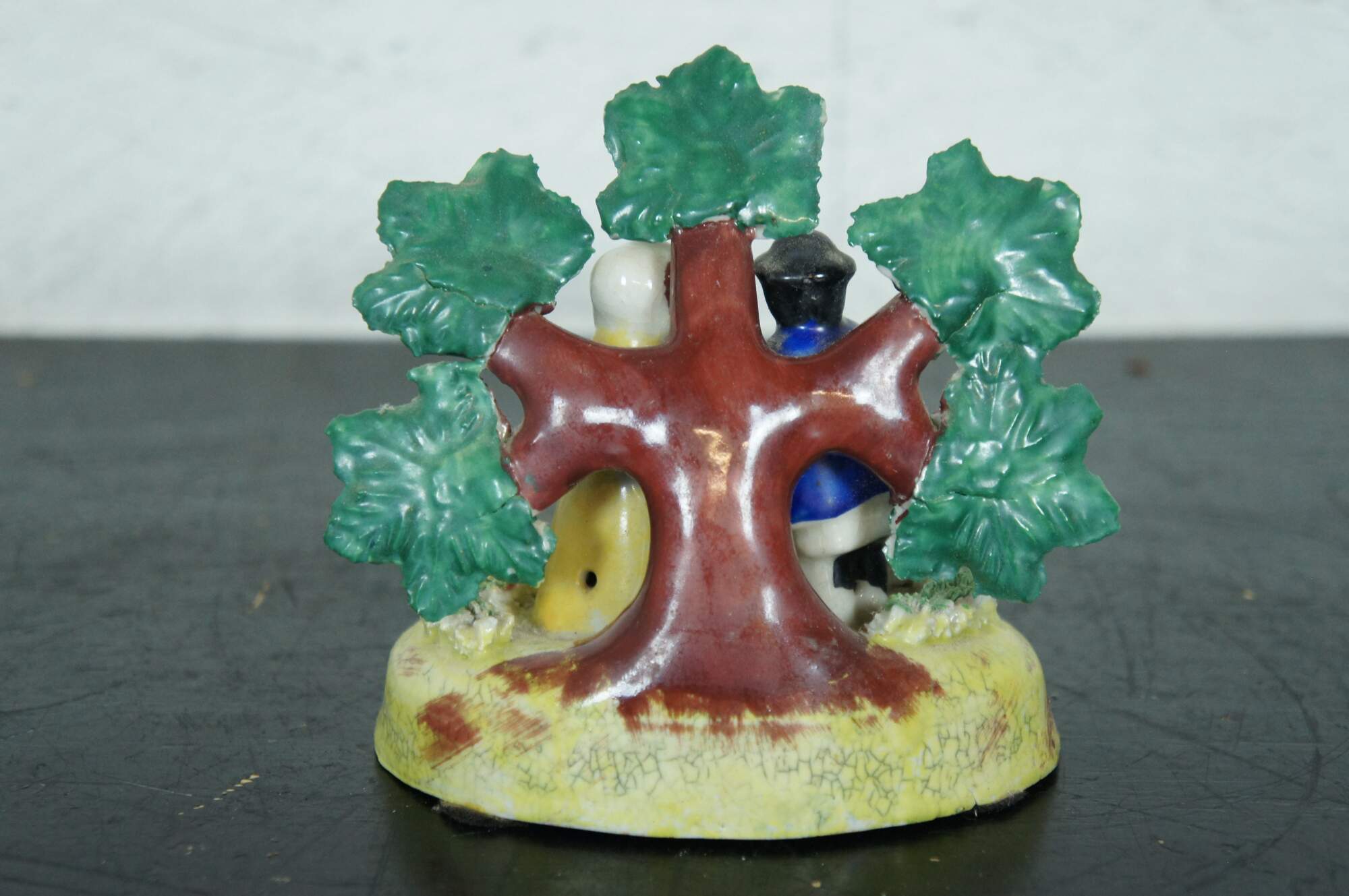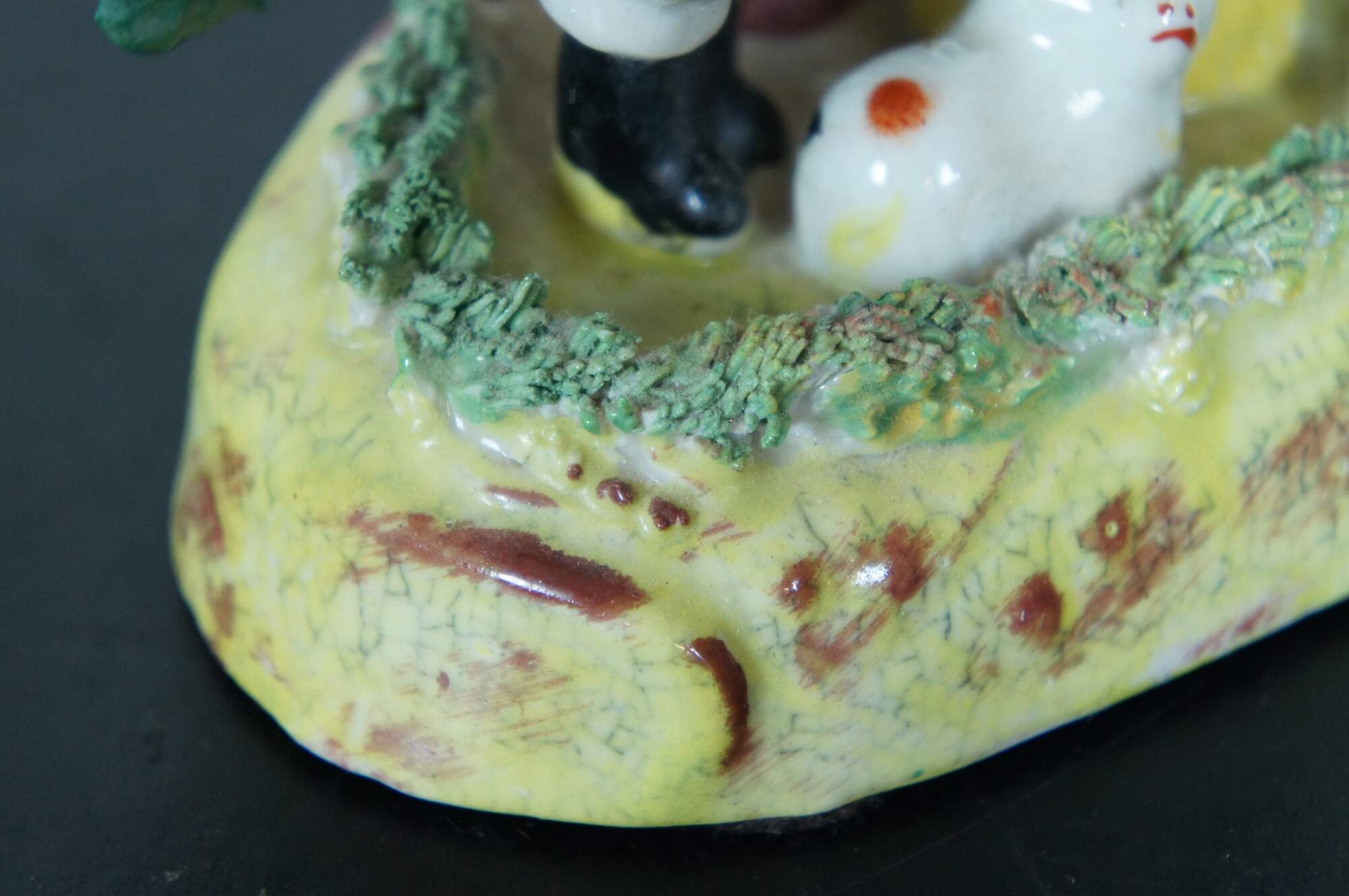 Antique early English Staffordshire porcelain pearlware bocage group, showing male and female shepherds with a red and white lamb, standing in front of a flowering tree. Attributed to the James Dudson factory at Stoke on Trent, circa 1830-1860.