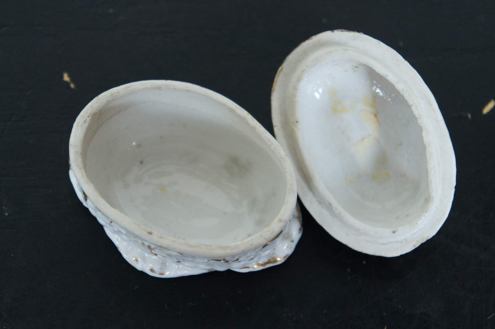 Antique Victorian Conta Boehme porcelain martime keepsake trinket box, oval shaped with ornate details and topped with flowers, an anchor, book and red object.“Fairings, which are small porcelain groups of gaily colored animal and human china figures, were given away as prizes or purchased at English fairs. Fairings were a popular fair souvenir during the middle of the Victorian era through 1915. Commemorative buildings and people, along with popular music and songs, inspired some of the fairings. Because beds were featured so prominently in many fairings, fairings often were referred to as “bedpieces.” Small trinket boxes were common souvenir items sold at fairs or seaside resorts. Staffordshire or other English potters did not make fairings. They were imported from Germany. Production of fairings ceased in 1914, resulting from tension associated with the coming of World War I.”
