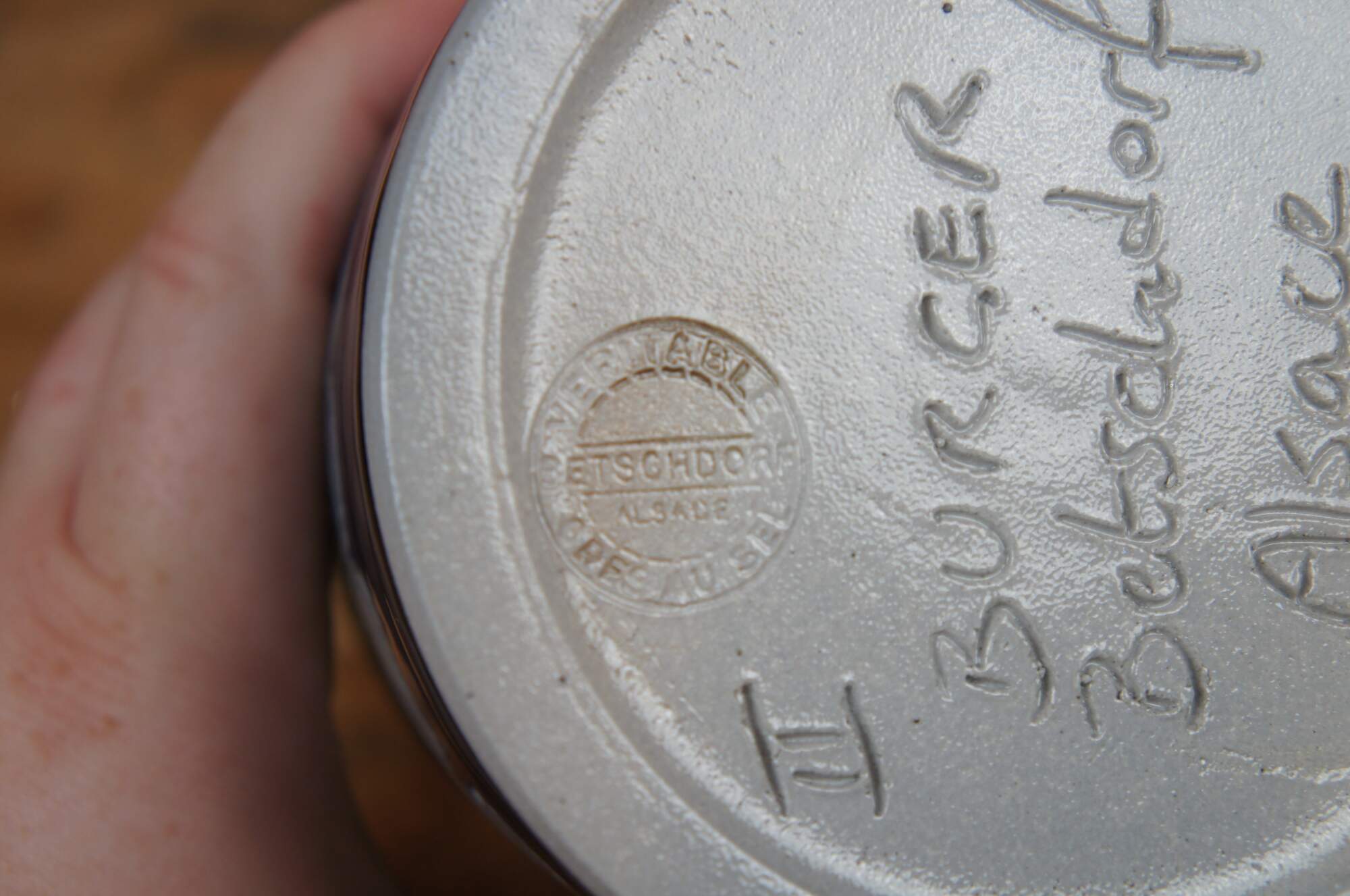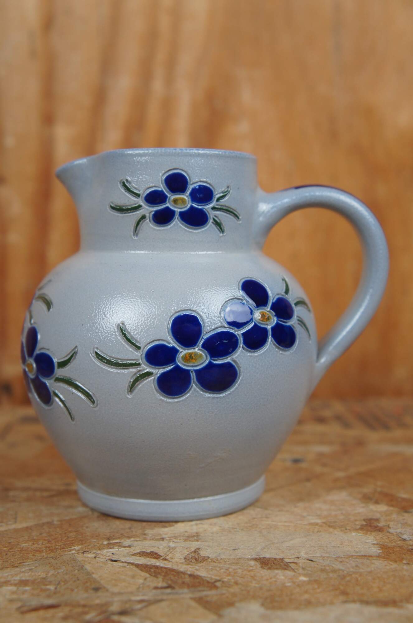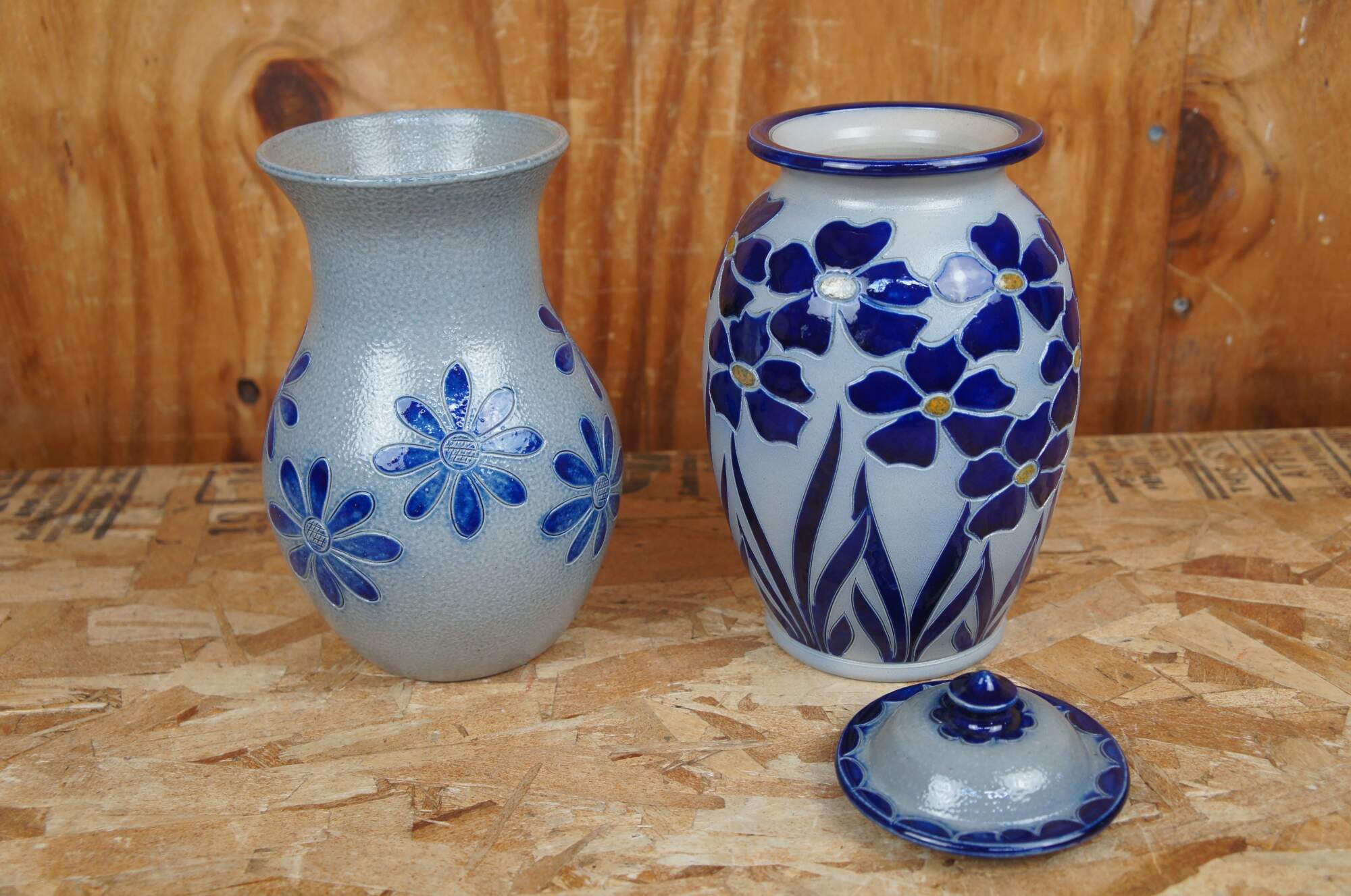 Vintage lot of French Betscdorf salt glaze pottery featuring floral motifs with cobalt blue accents. Includes 9 pieces: pitcher / creamer, jars, bud vases, a few with lids, one cork stopper.