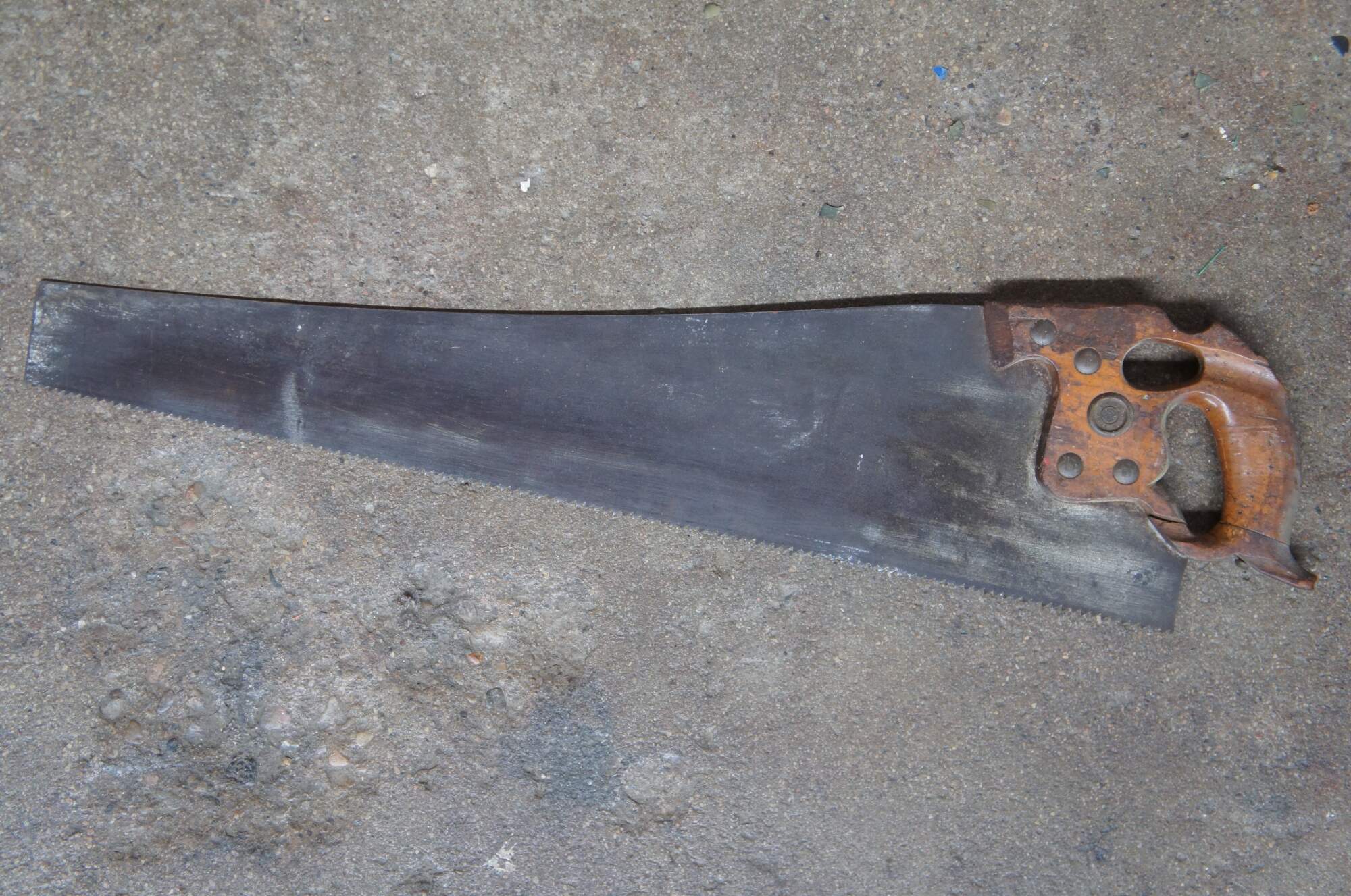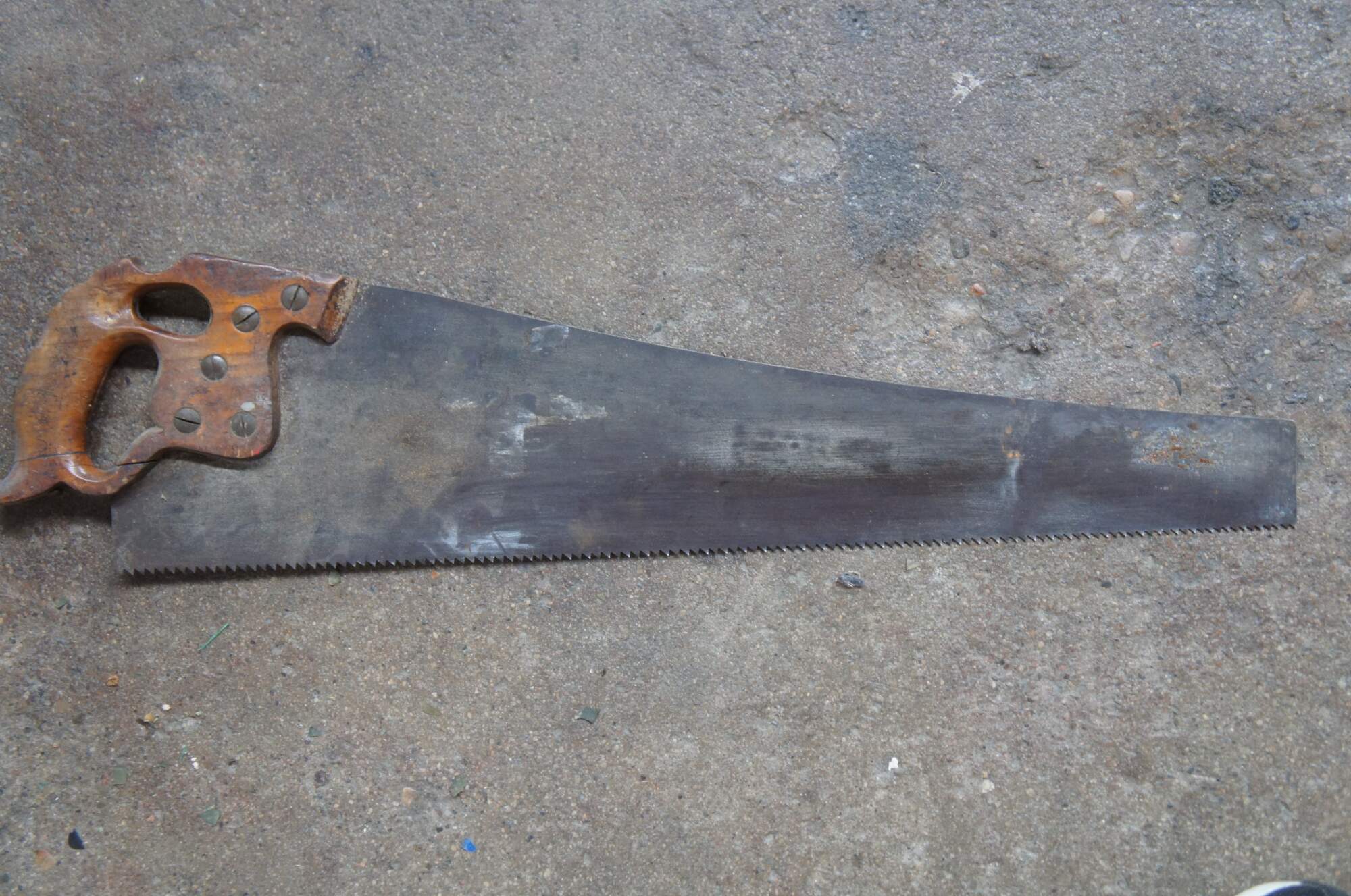 3 vintage hand saws marked Disston, warranted superior featuring wood handles and thumb holes.