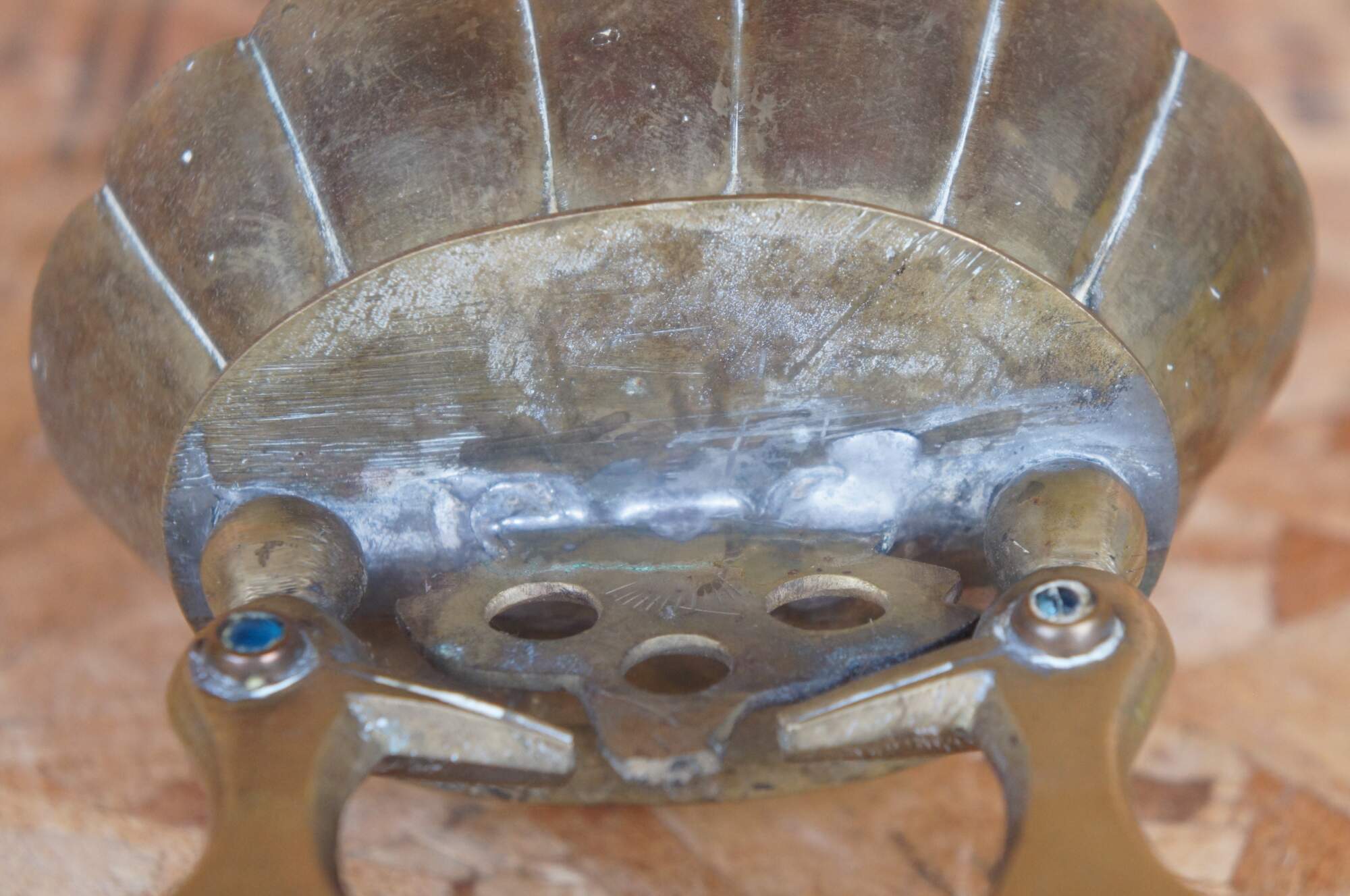 Two vintage Korean brass candlestick holders decorated with birds, fish, gems and wax catchers.
