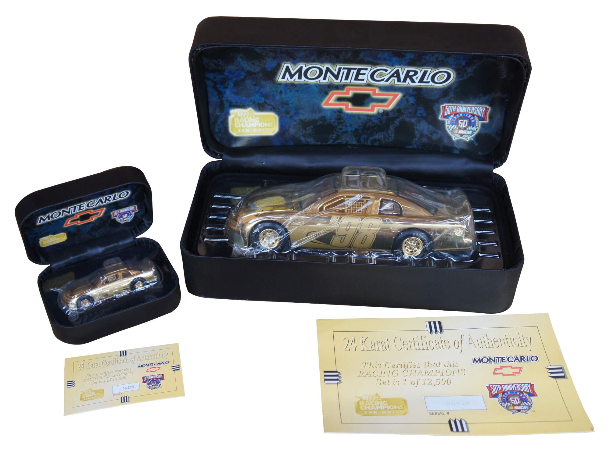 Pair of 50th Anniversary 24K gold plated Nascar racing champions Monte Carlo cars with collectible information / certificates and boxes.