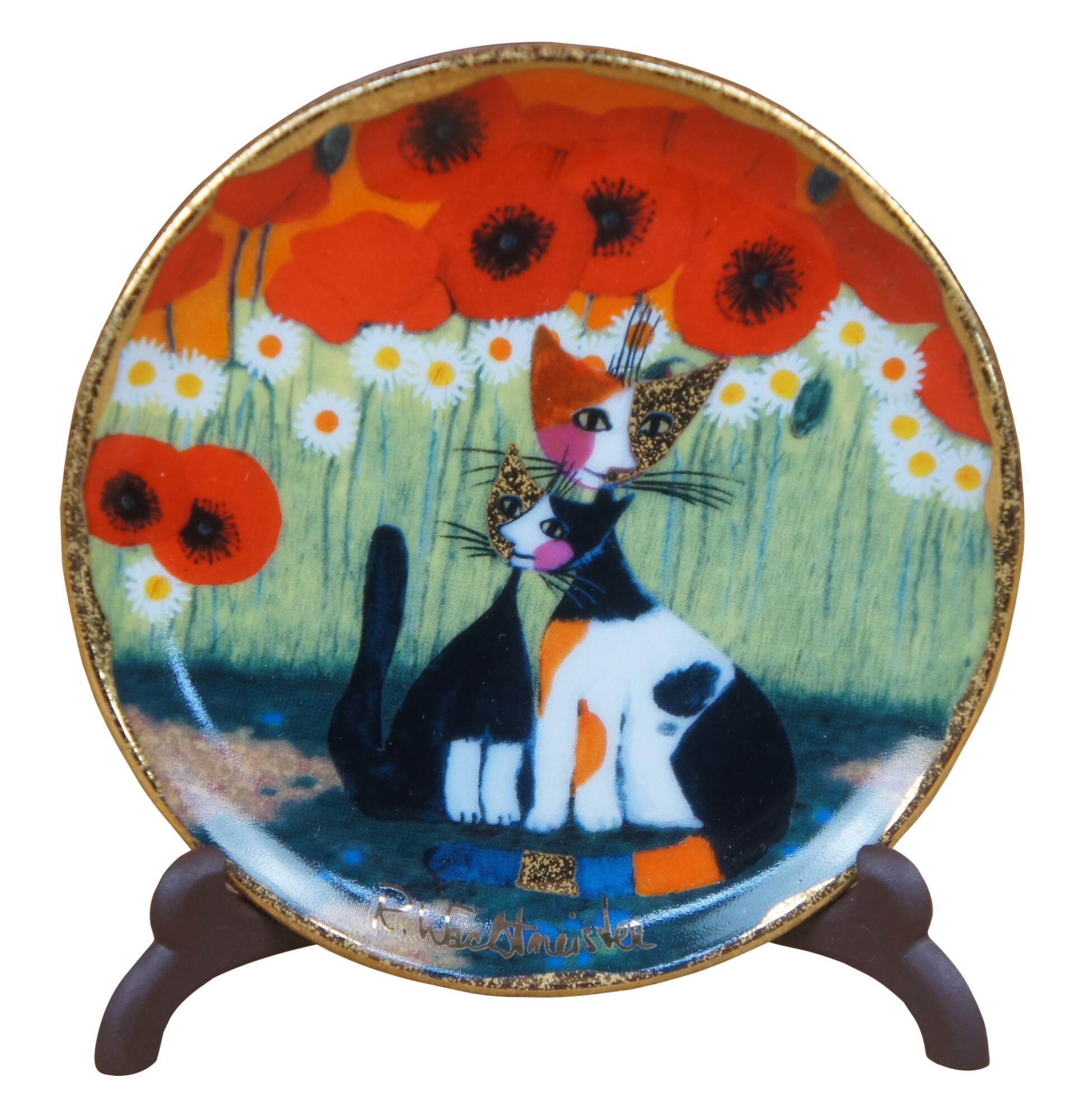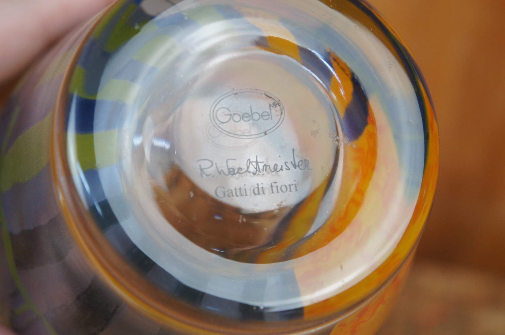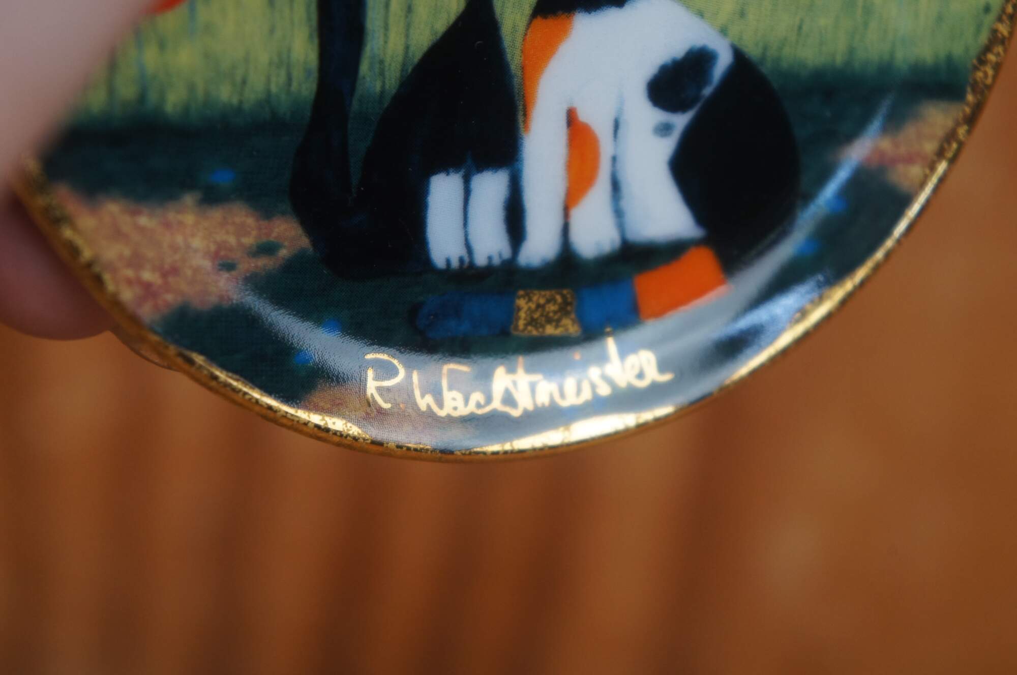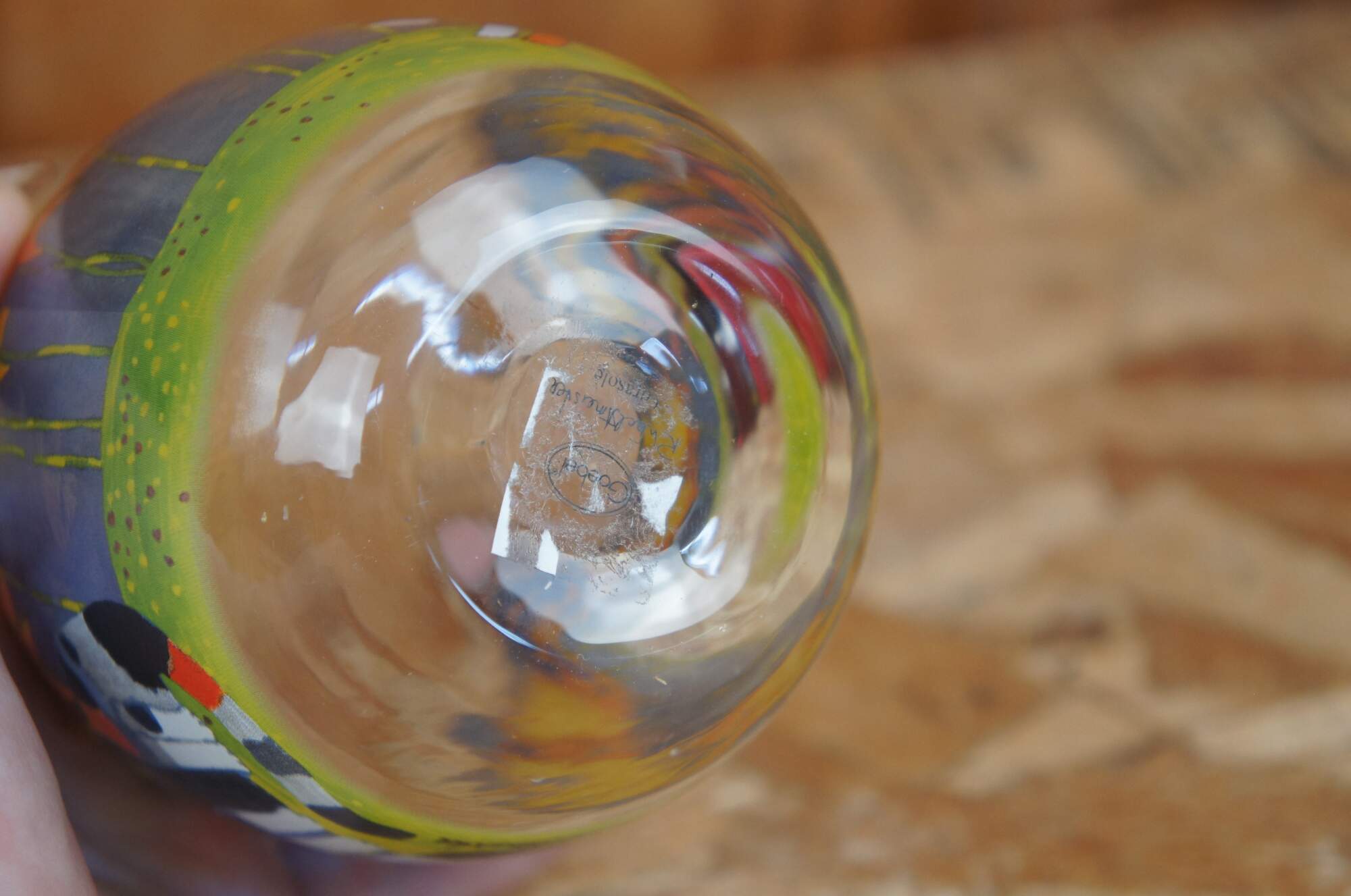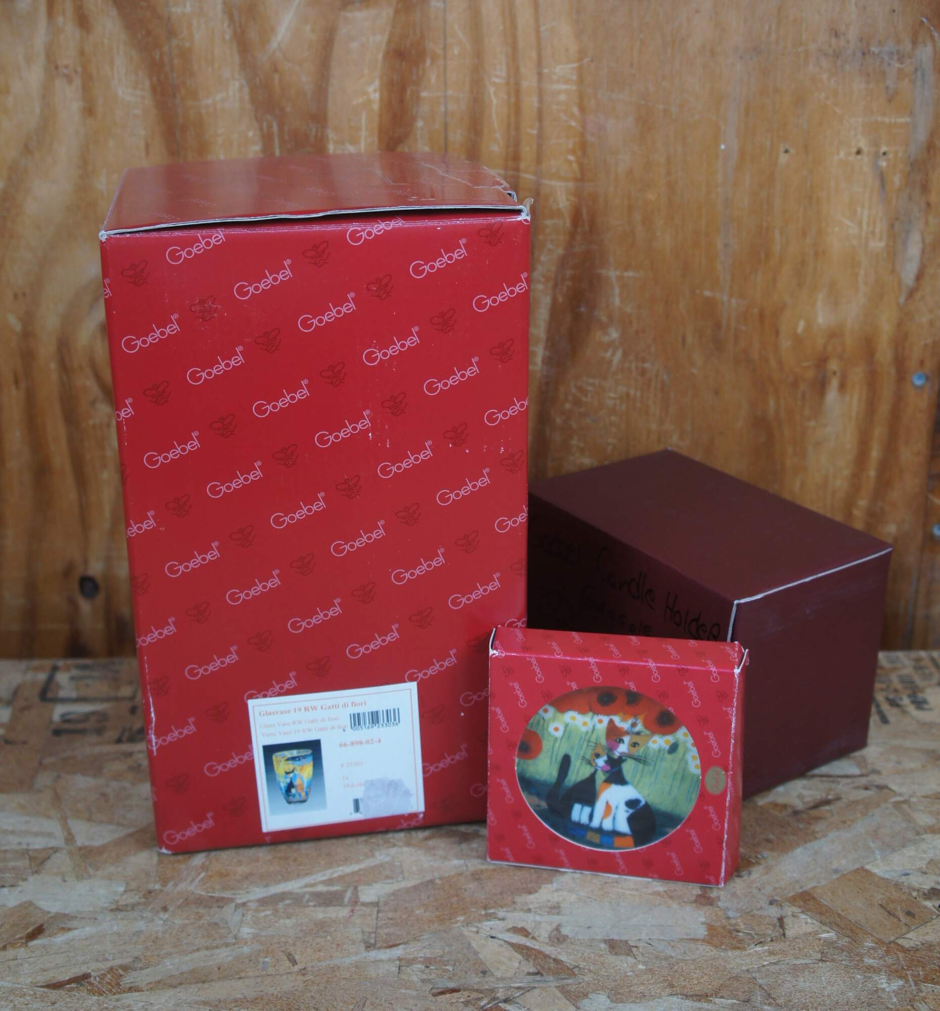 Three Goebel Rosina Wachtmeister collection pieces includes a Girasole glass cup or votive candle holder, gatti di fiori vase and small decorative Nico e Nicola dish or plate with stand. All with original boxes.