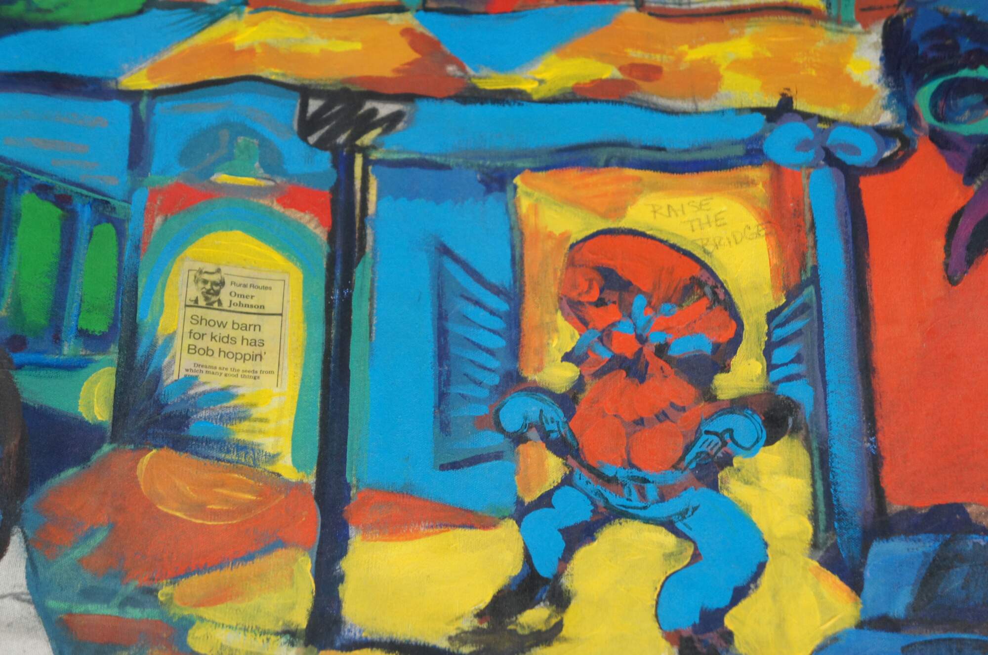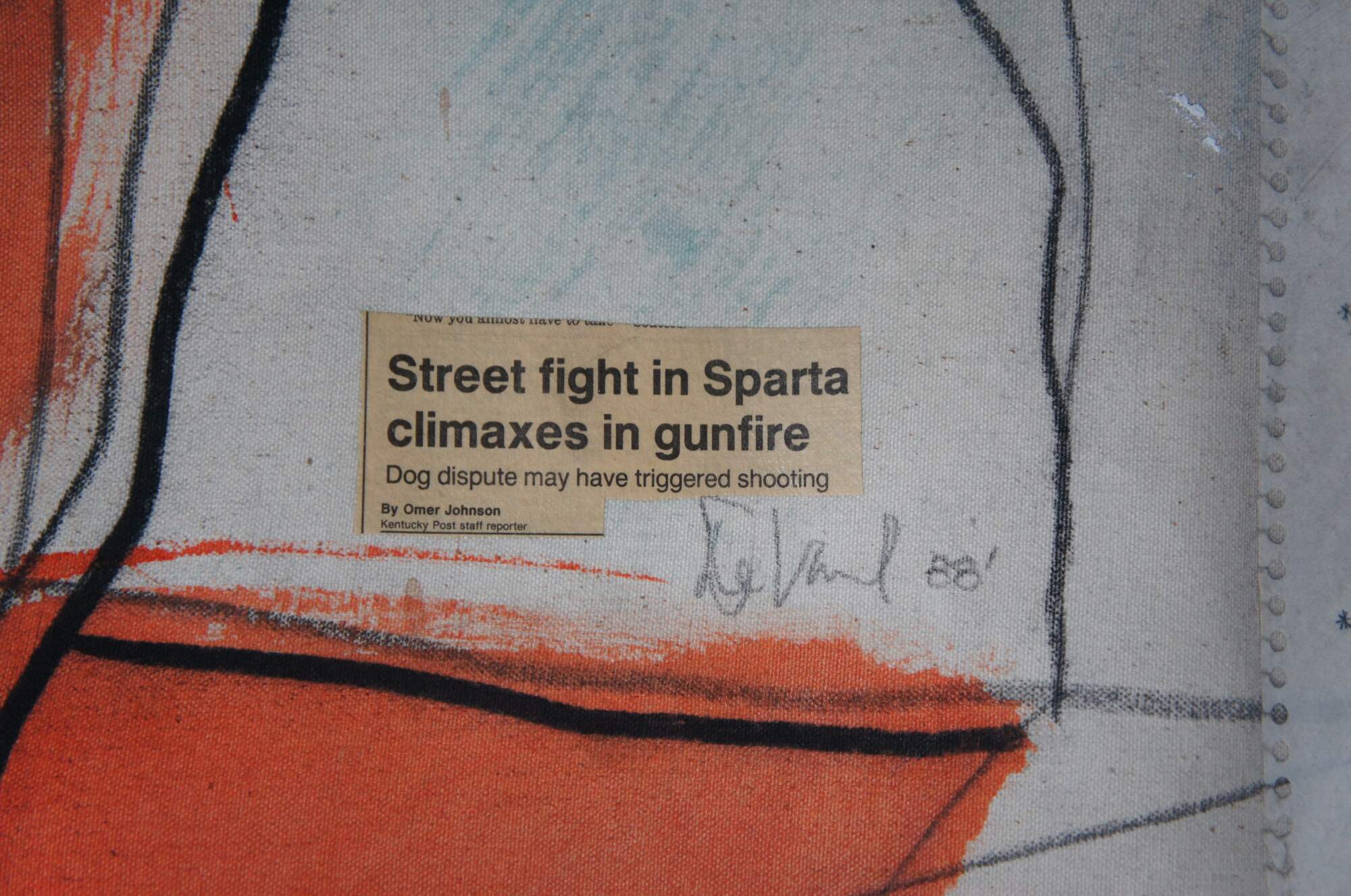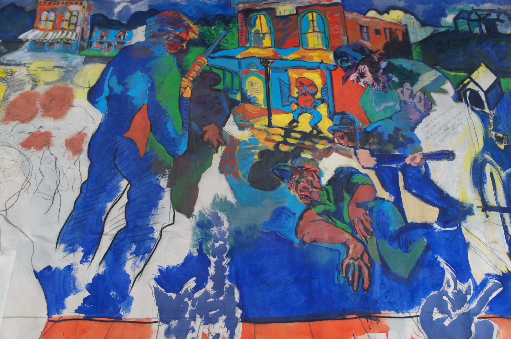 Vintage 1988 David Devaul mixed media expressionist artwork depicting a gunfight in Sparta Kentucky that triggered from a dog dispute. The mural features vibrant abstract acrylic and mixed media.