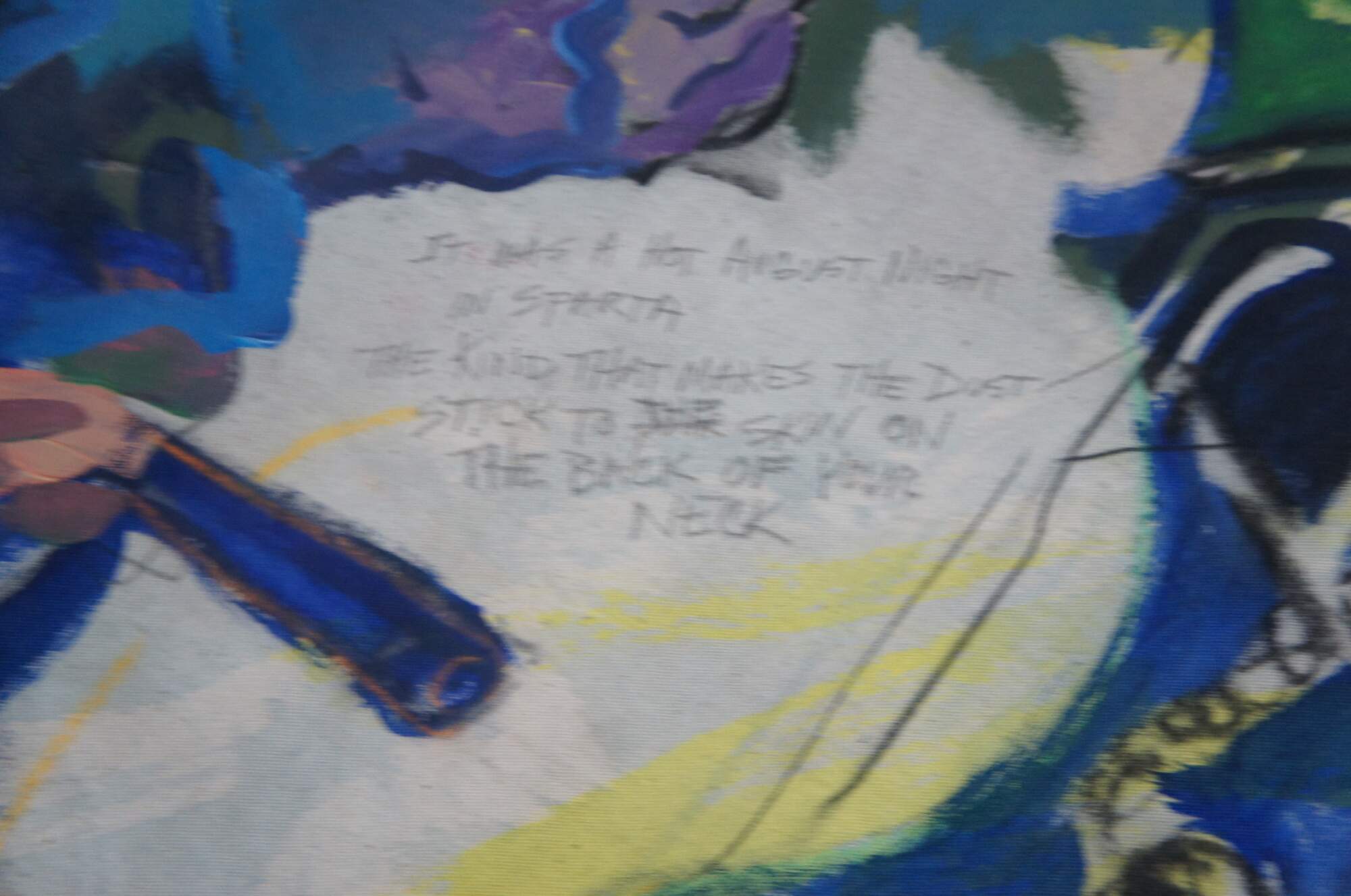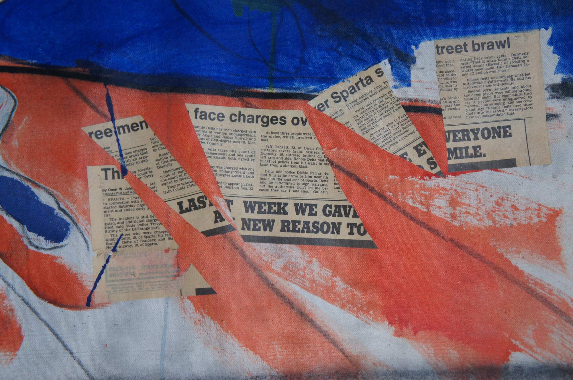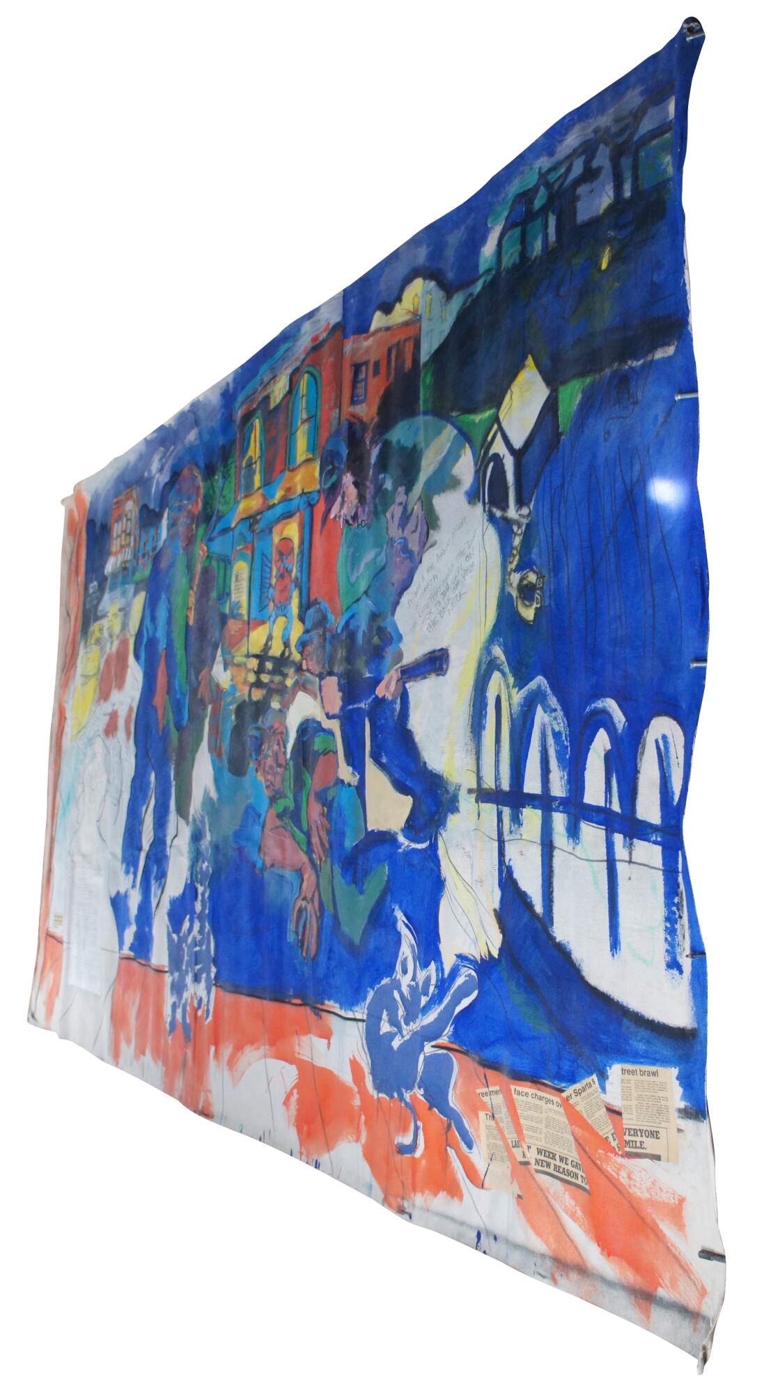Vintage 1988 David Devaul mixed media expressionist artwork depicting a gunfight in Sparta Kentucky that triggered from a dog dispute. The mural features vibrant abstract acrylic and mixed media.