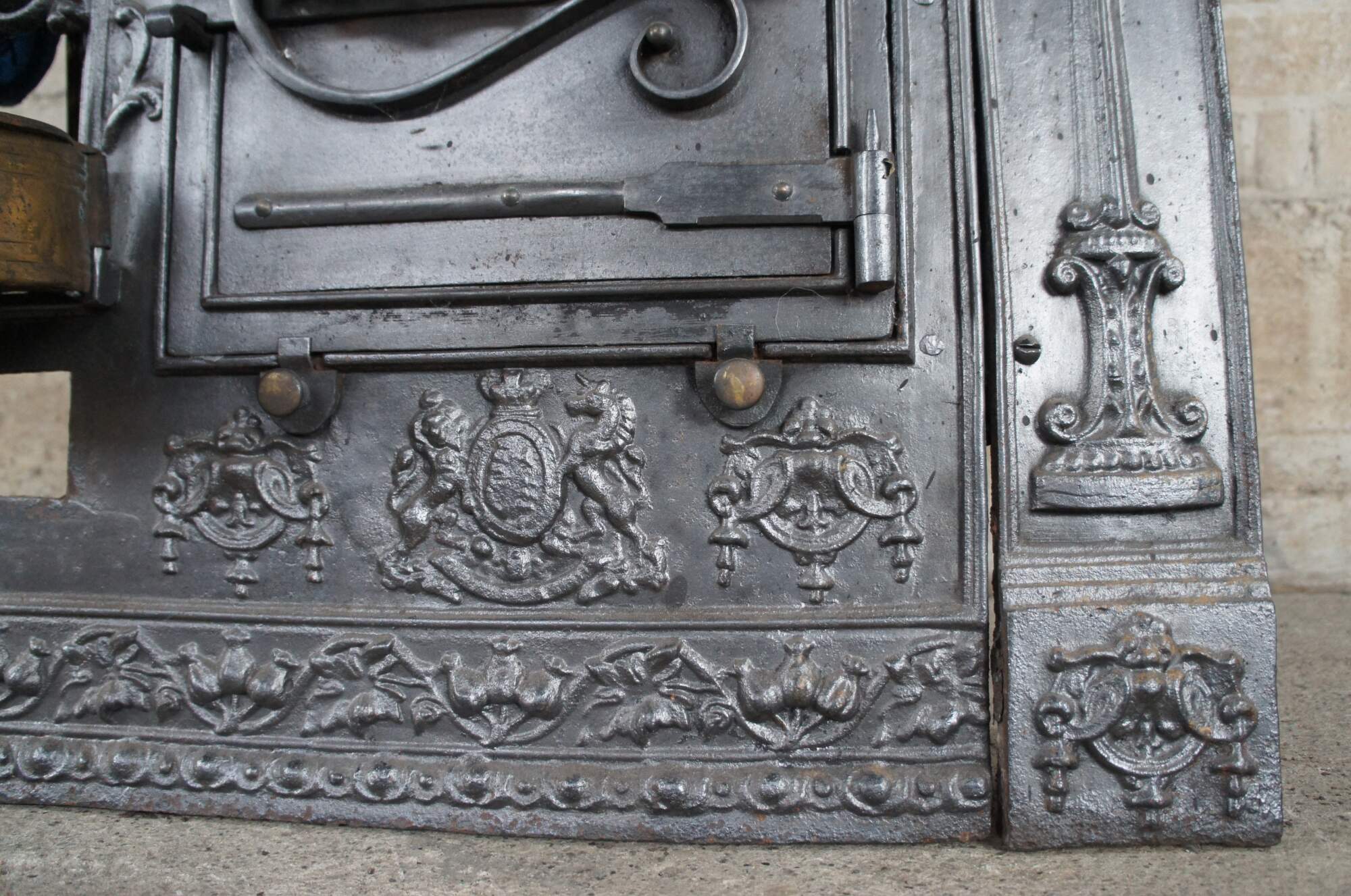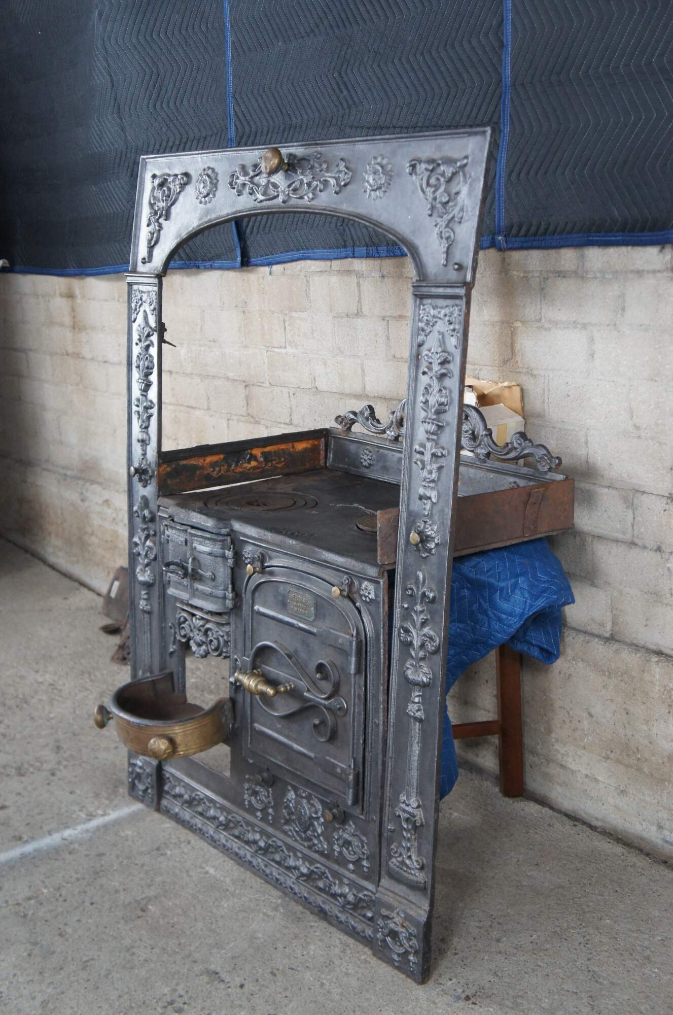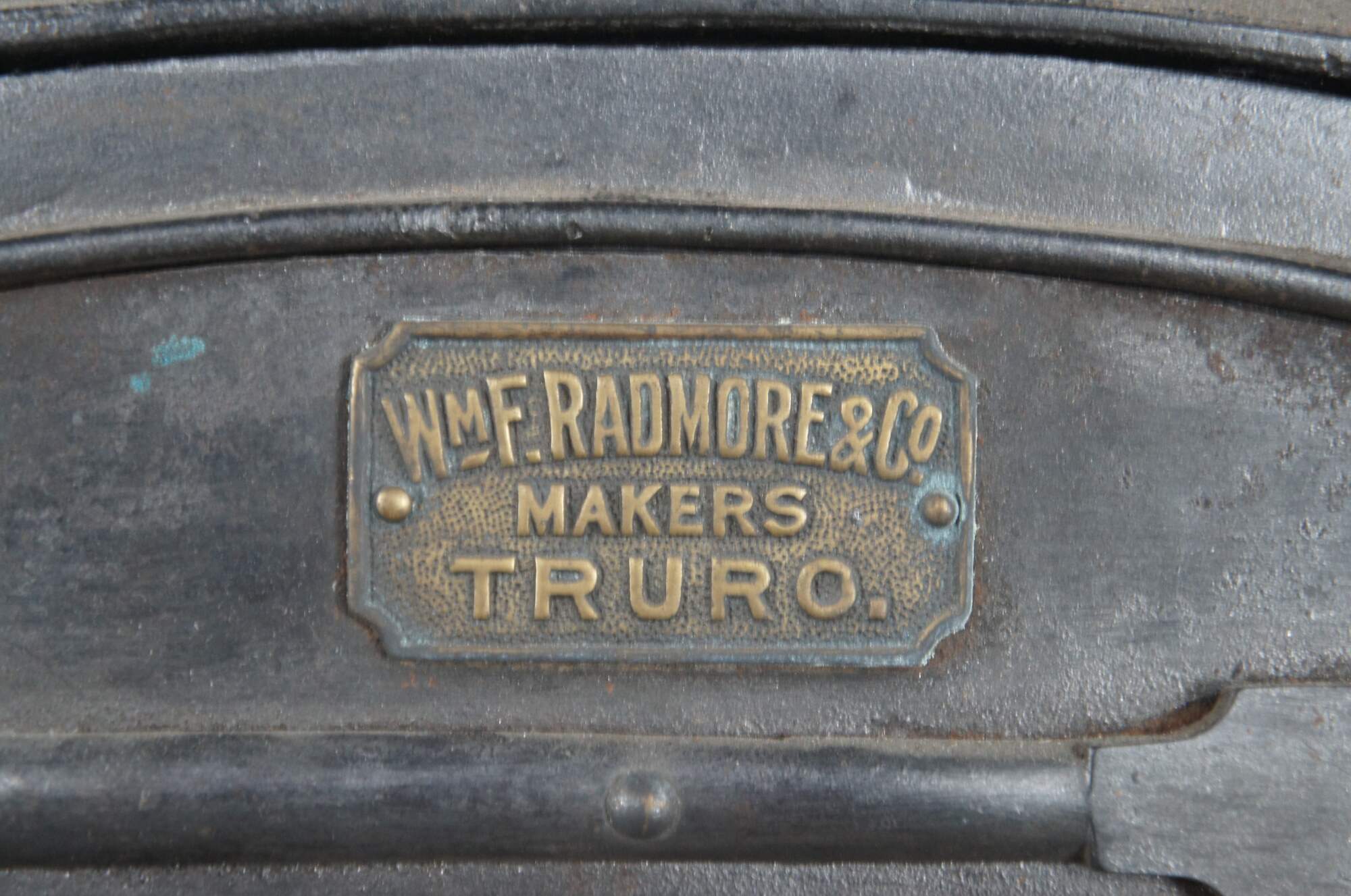 Antique 1840s Cornish WmF Radmore & Co Makers Truro range cooker or fireplace stove featuring brass and cast iron construction