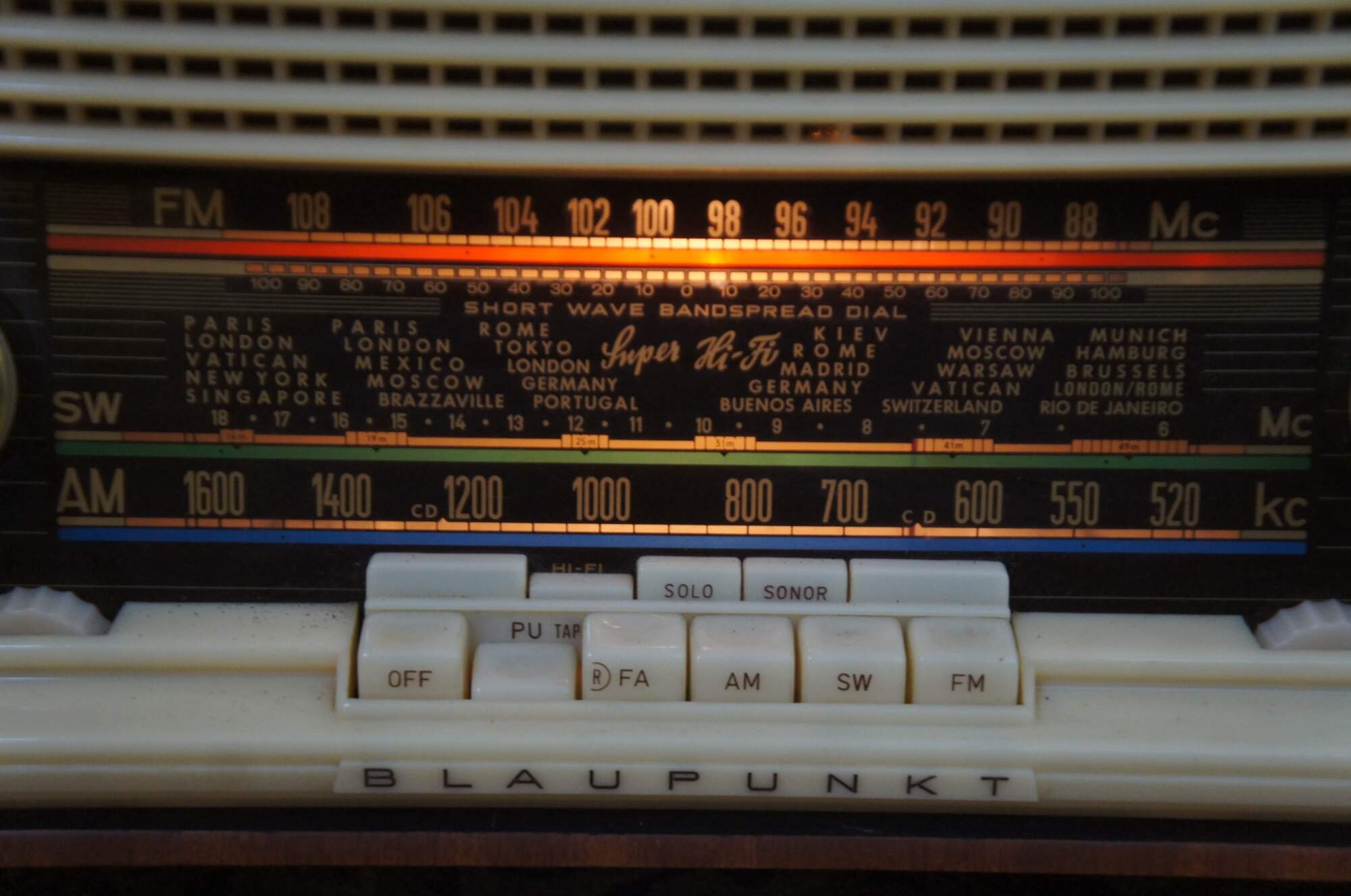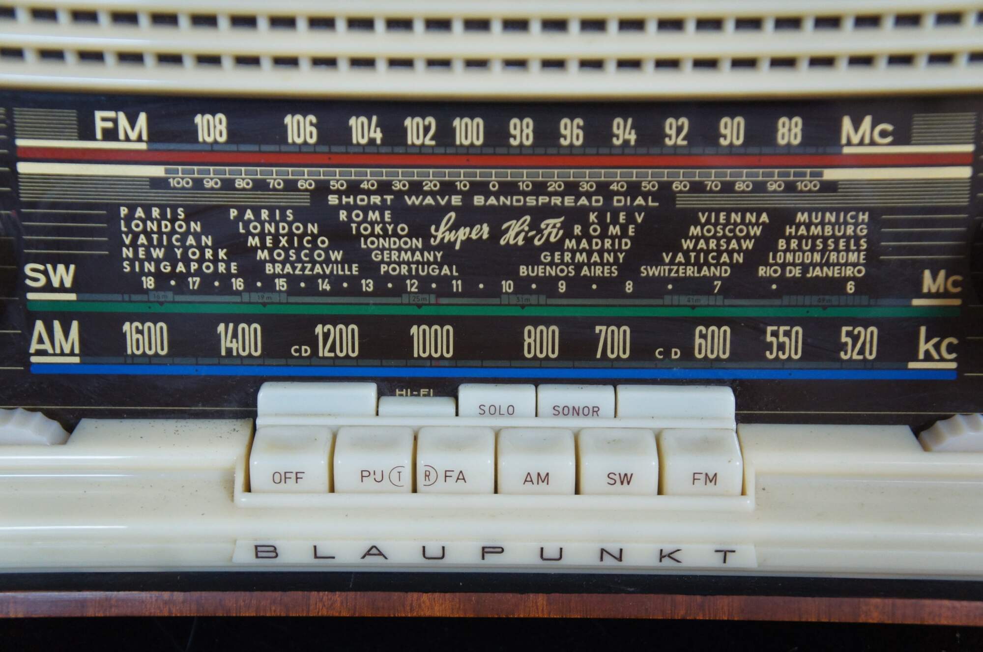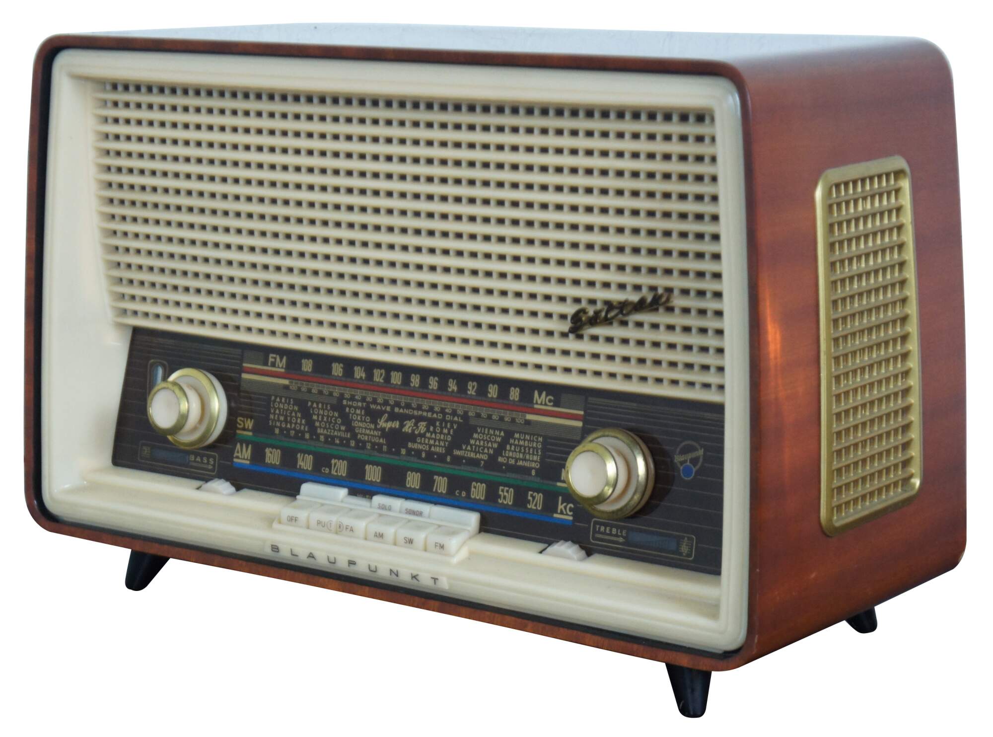 Vintage 1960’s Blaupunkt Sultan radio Type 20203, with brown wood case and white plastic face. Face illuminates and radio works (interior may need cleaning/TLC for optimal operation).
