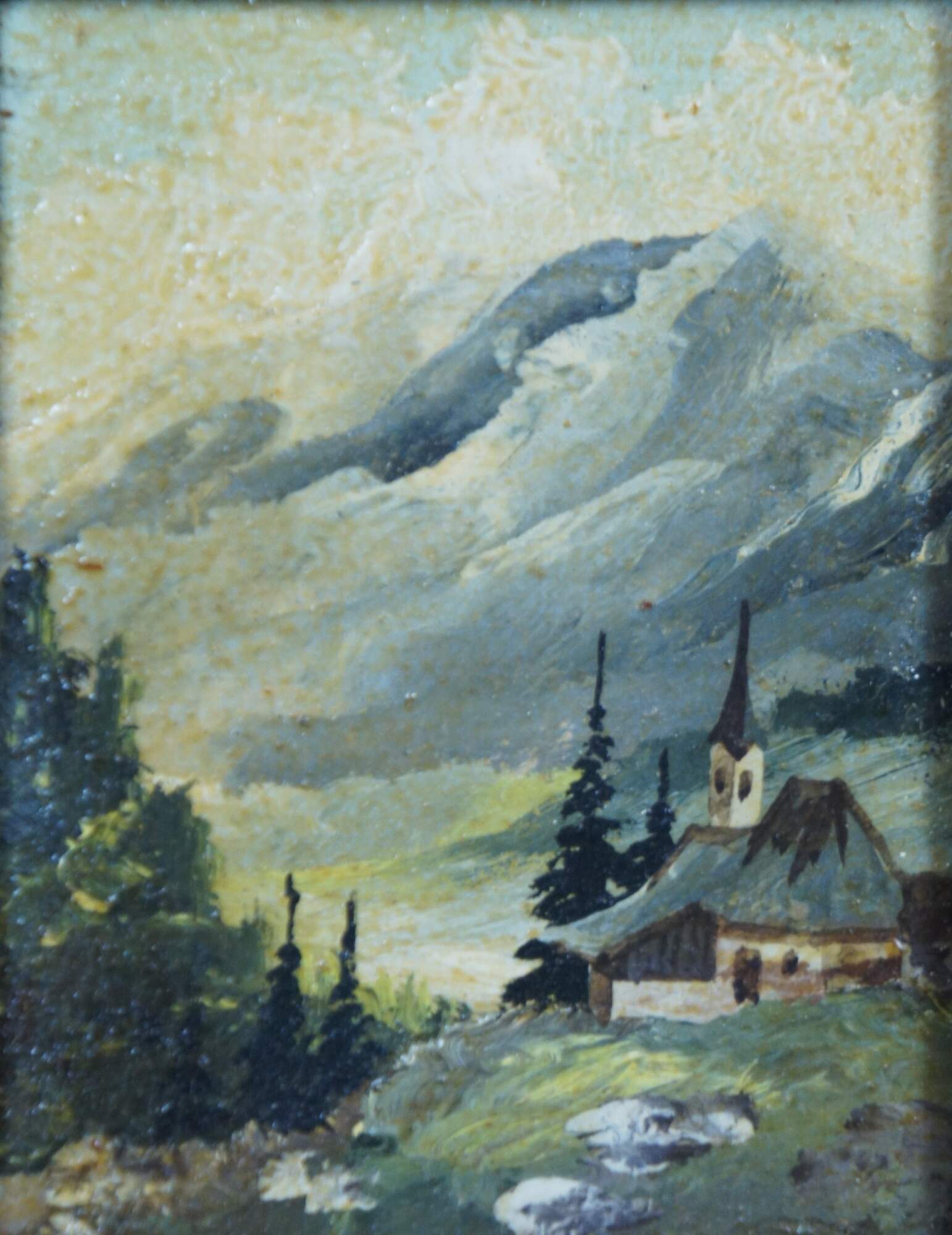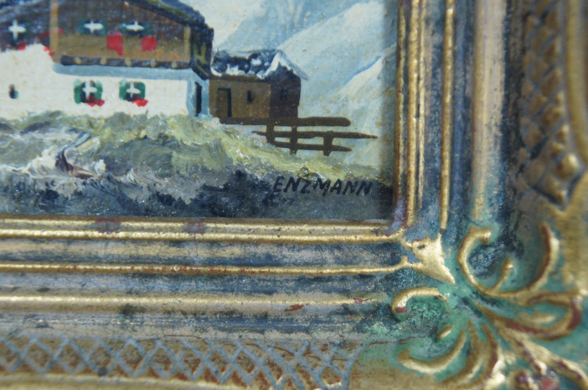 Set of three vintage miniature oil on board German mountain landscape paintings; one is signed Enzmann, possibly referring to Eduard Enzmann (1882-1965).