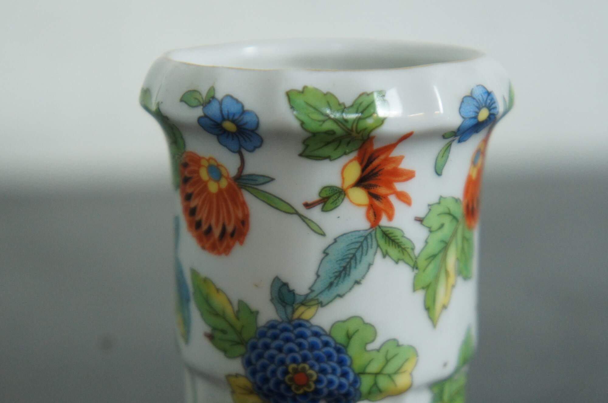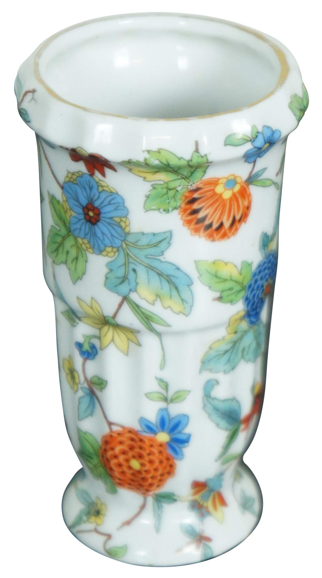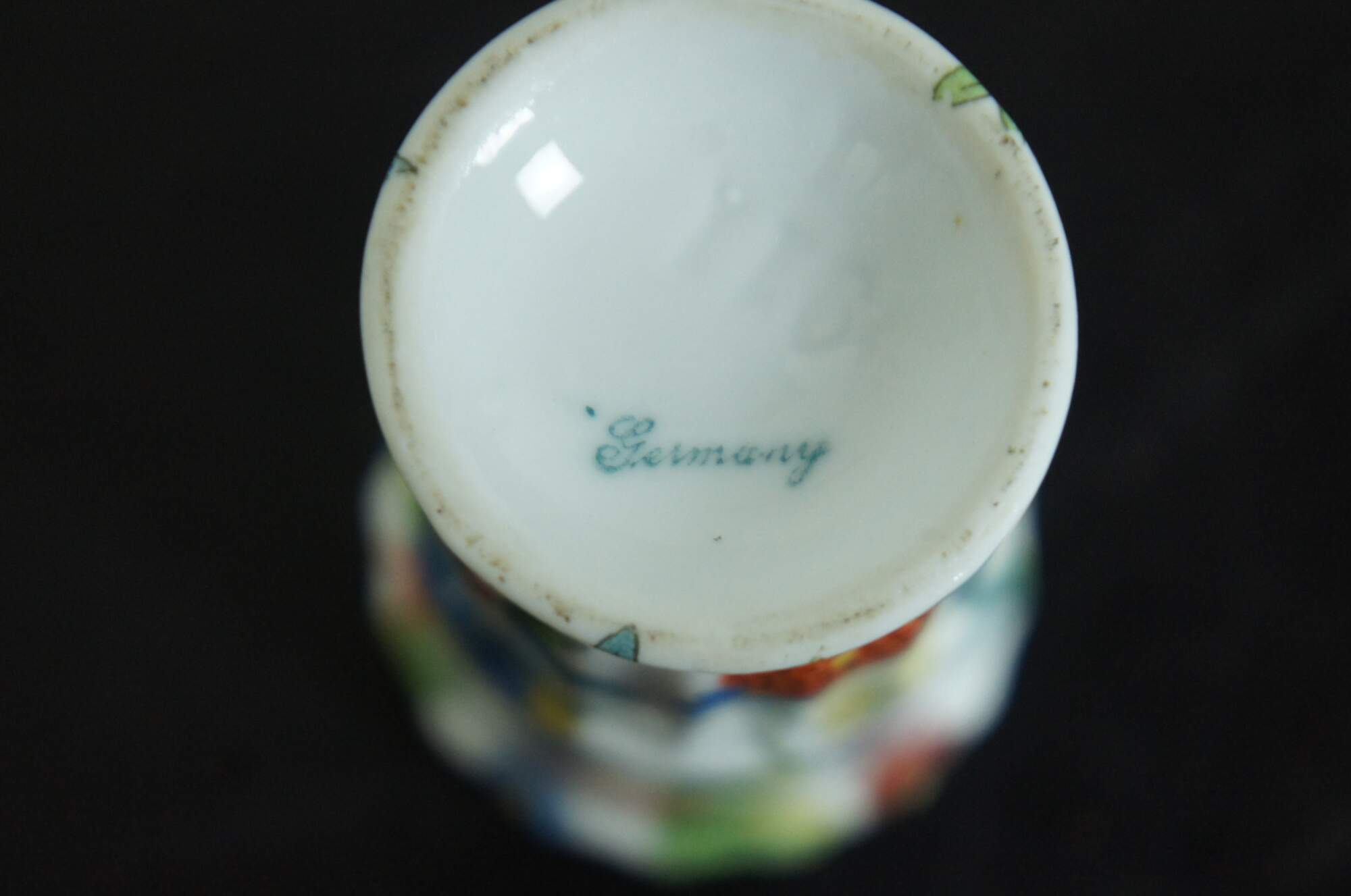 Vintage German porcelain bud vase, handpainted and stylized floral pattern reminiscent of Chrysanthemums. Decorated with orange, blue and yellow flowers.