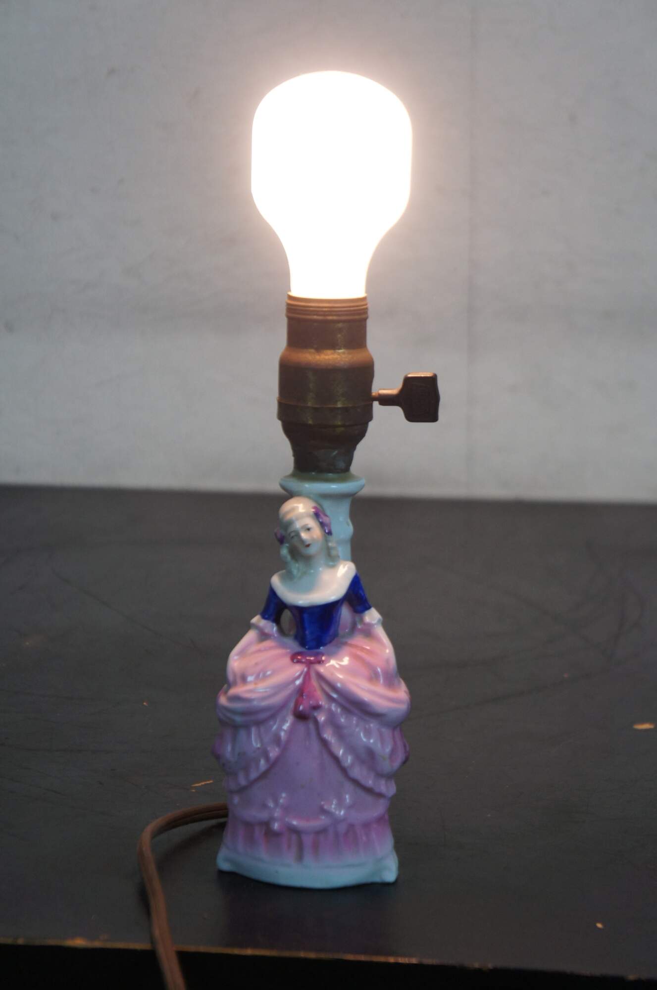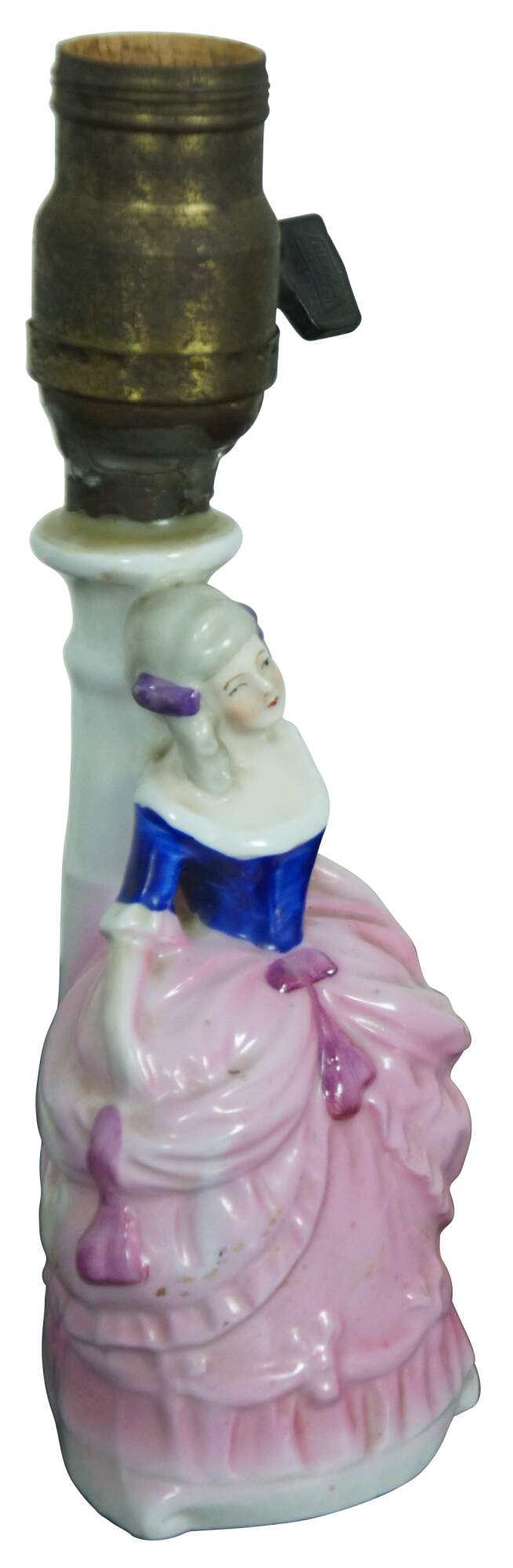 Antique circa 1930s German porcelain budoir lamp marked with the number 6050, in the shape of a female figure in a blue and pink 18th century dress.
