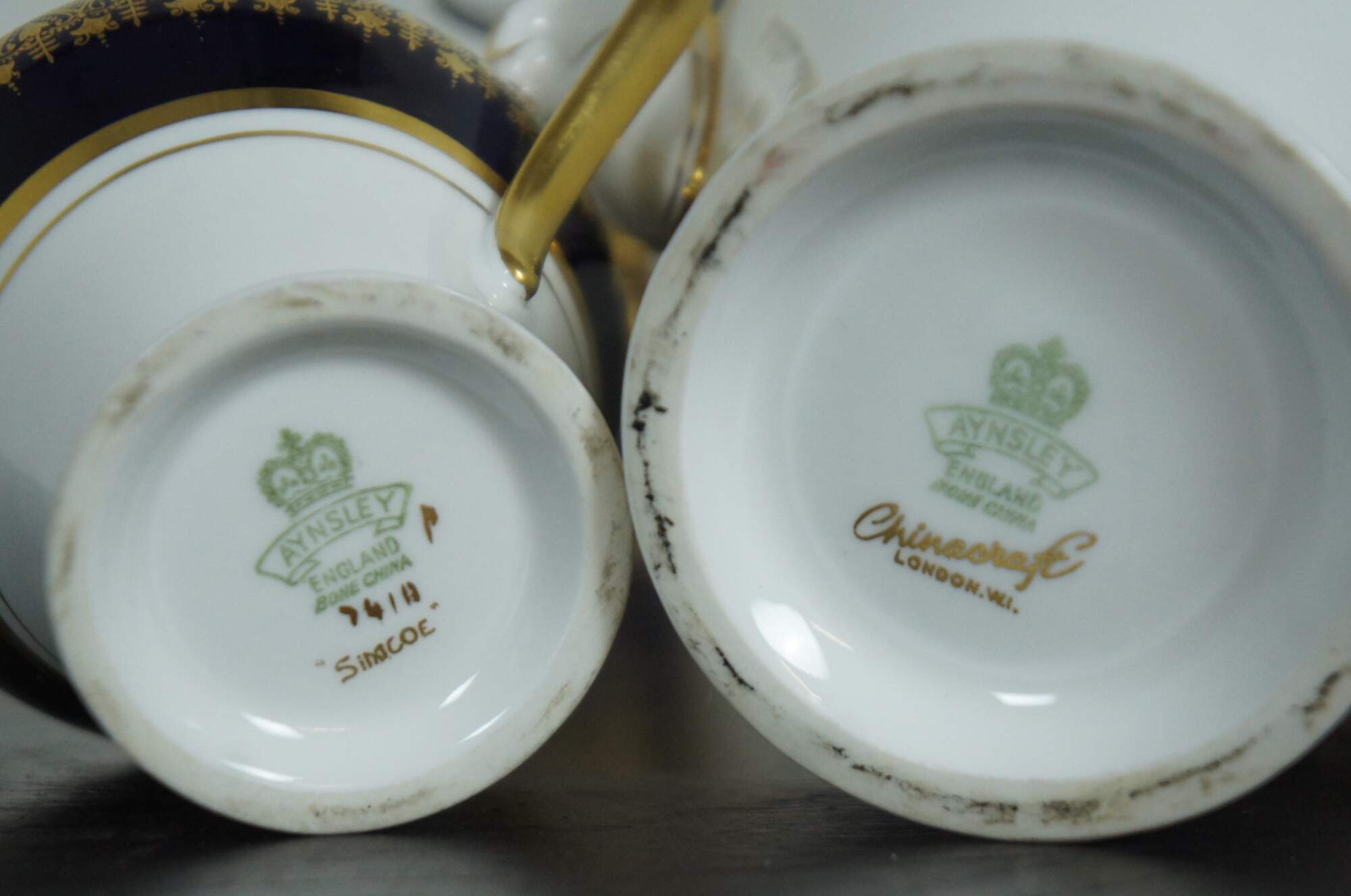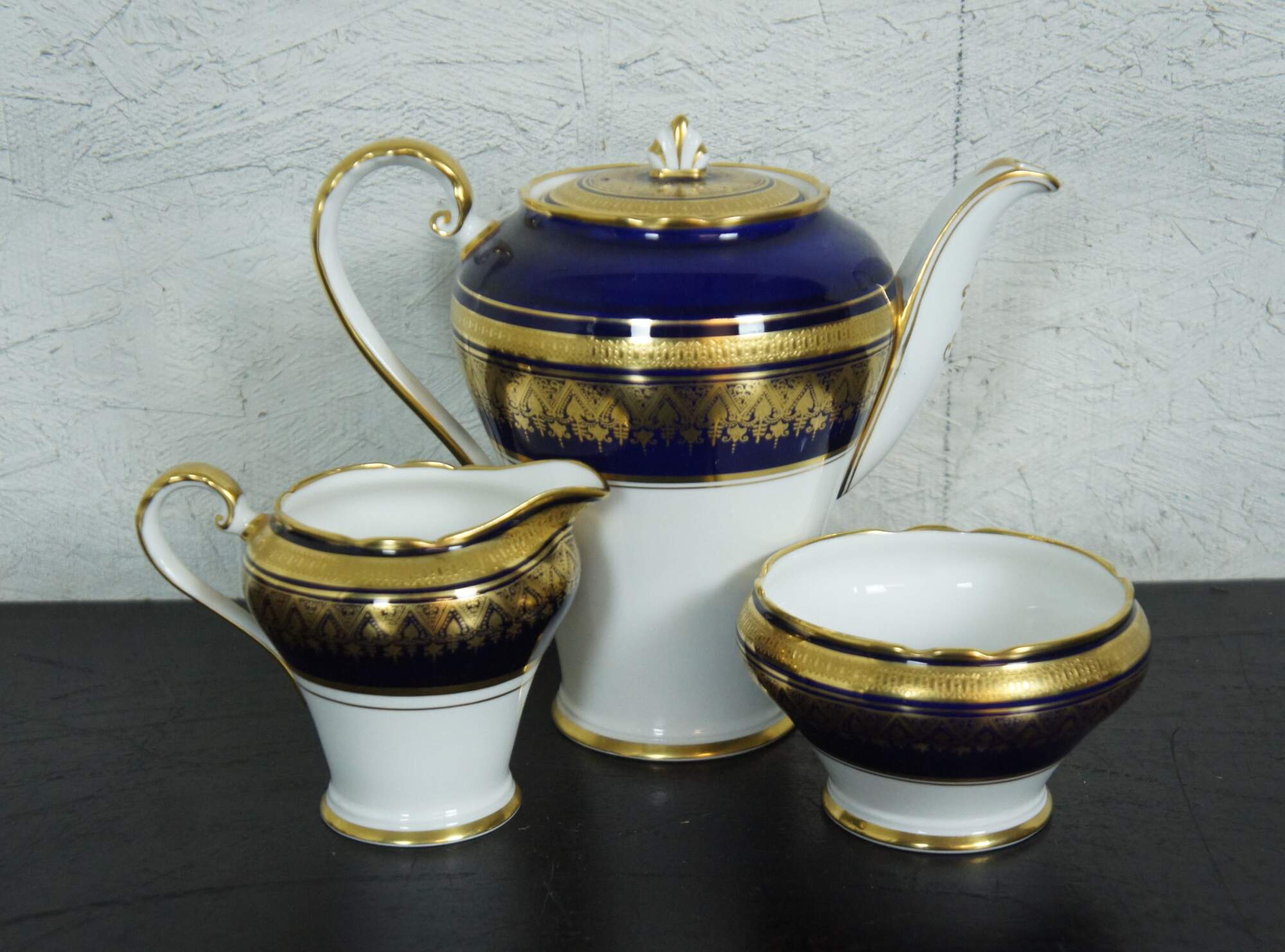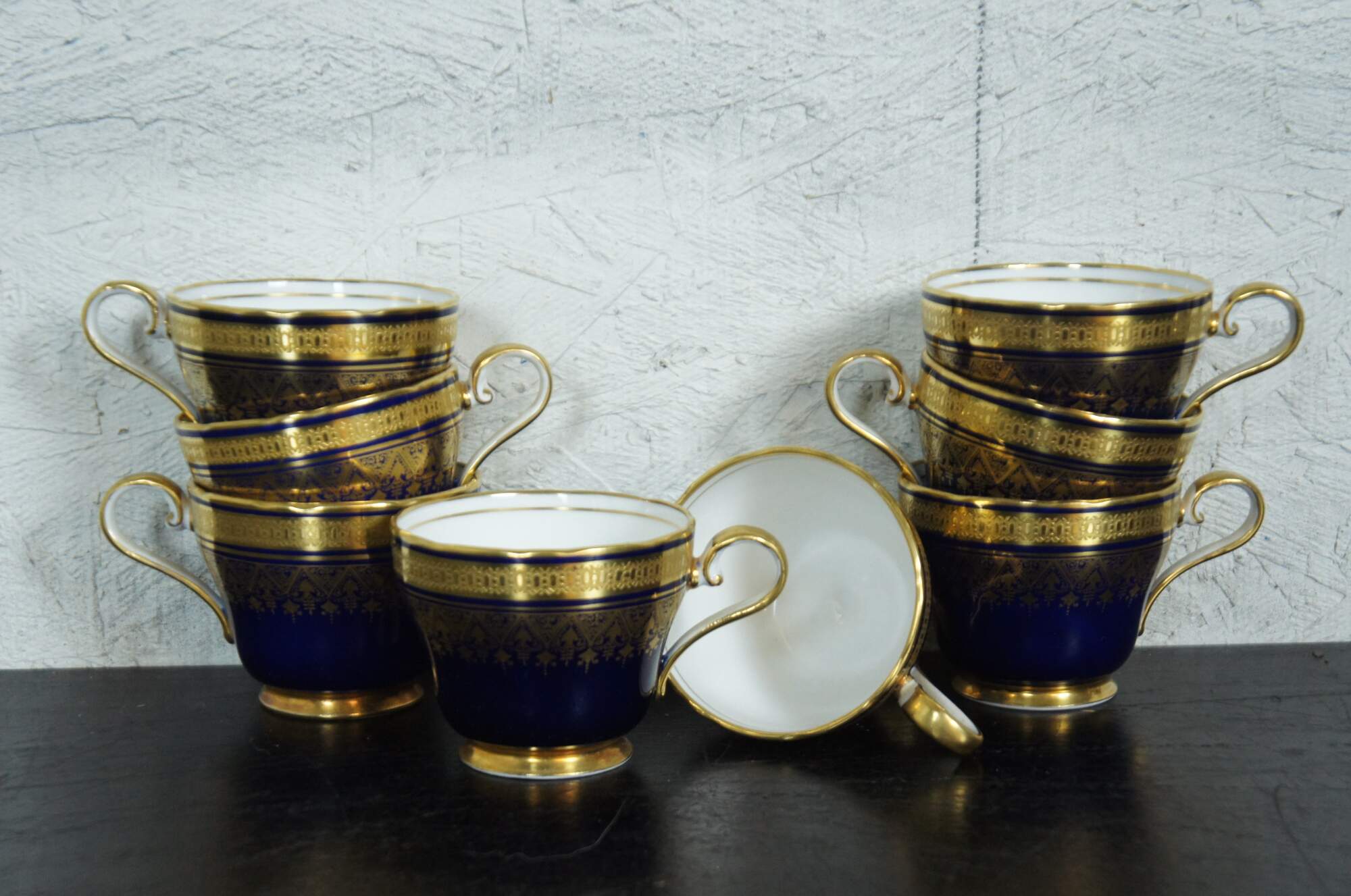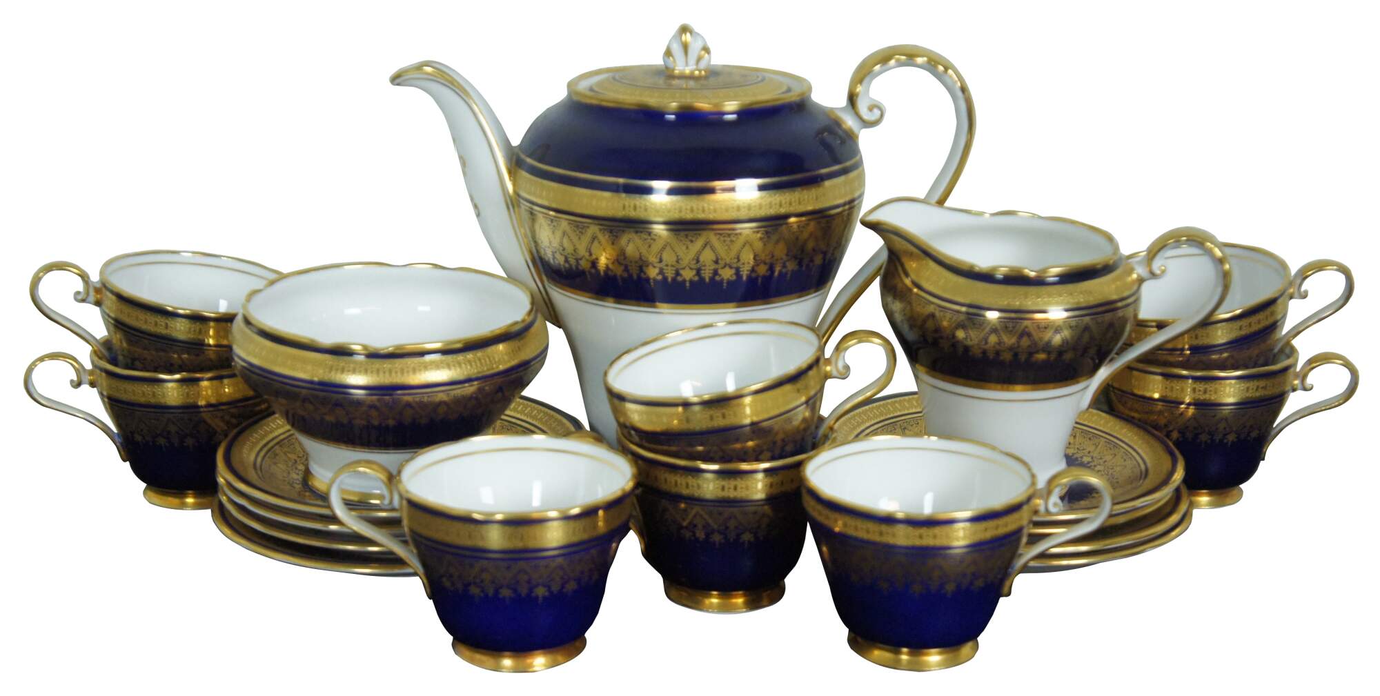 Vintage twenty piece John Aynsley bone china demitasse tea or coffe set in the Simcoe pattern number 7410, featuring an orante design encrusted in gold over cobalt blue and slightly scalloped edges. “Aynsley China Ltd. was a British manufacturer of bone china tableware, giftware and commemorative items. The company was founded in 1775 by John Aynsley in Lane End, Longton, Staffordshire. In 1861 his grandson John Aynsley built the historic Portland Works on Sutherland Road, Longton, Staffordshire.[4] The company's profitability made it a desirable acquisition. In June 1970 Spode put in a bid, this was then topped in July by Denbyware. Discussions then followed with Waterford Glass and a £1 million bid was agreed. In 1970 John Aynsley and Sons was taken over by Waterford and renamed Aynsley China Ltd. In 1987 Waterford sold the company in order to focus the group's fine china sales on the worldwide Wedgwood brand.[5]