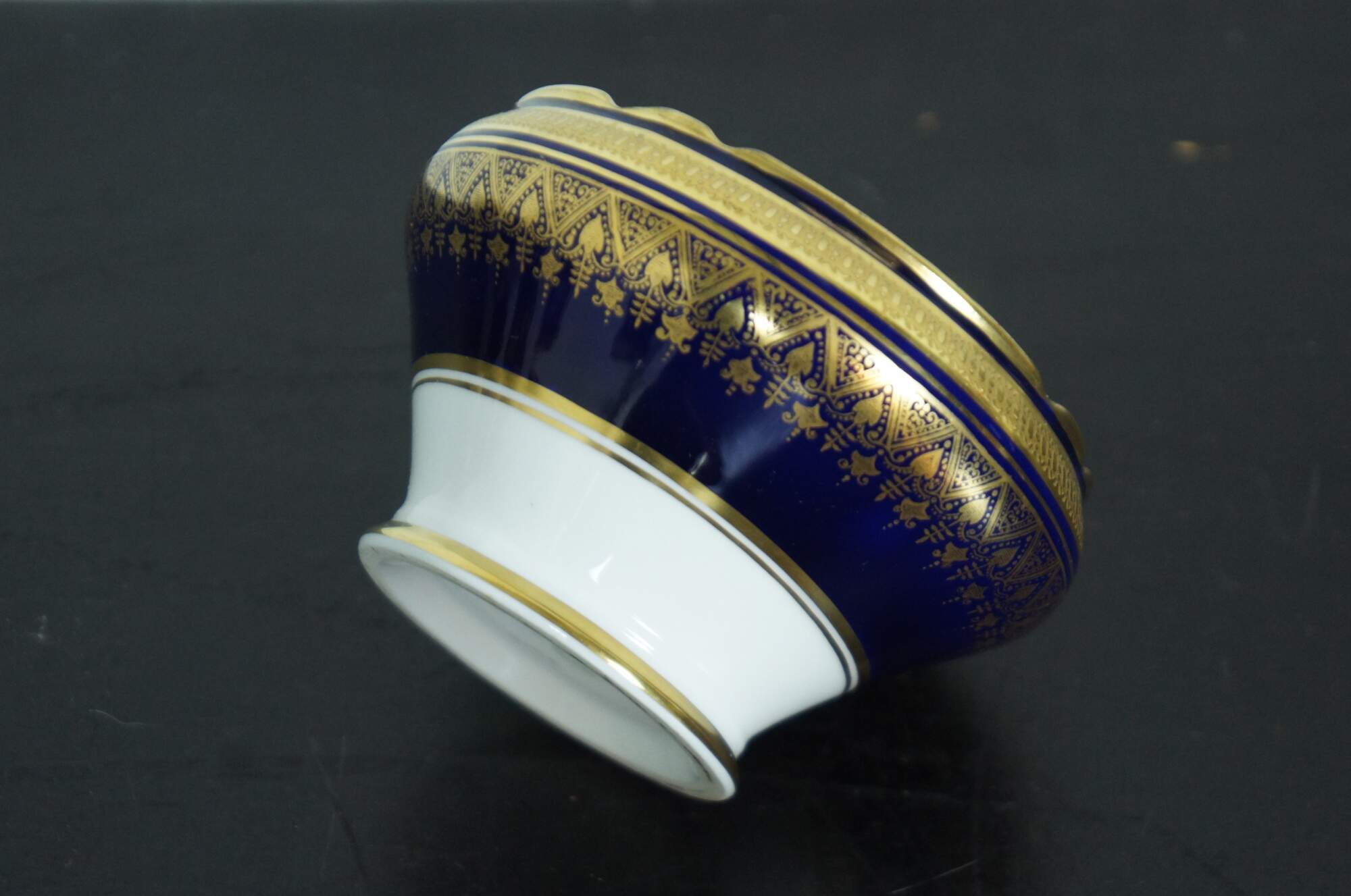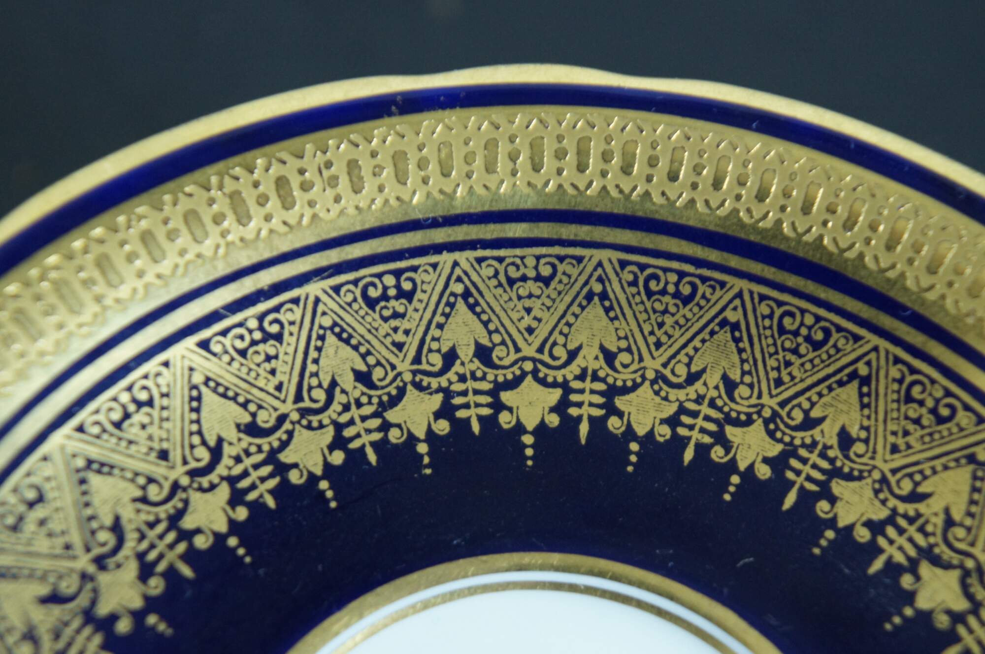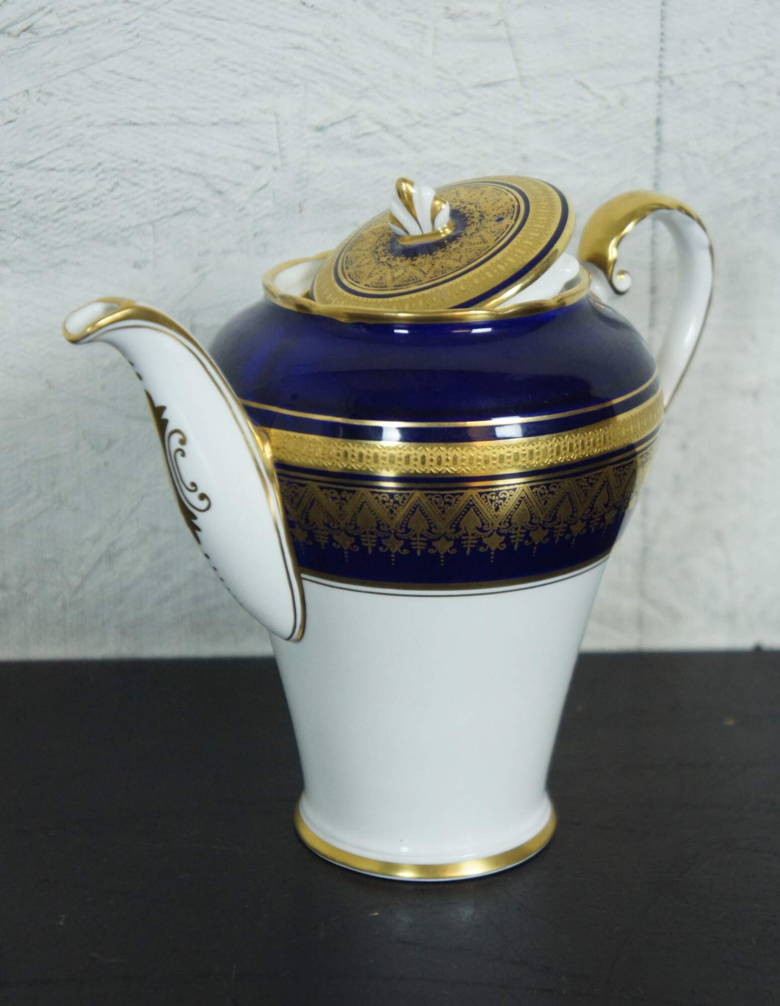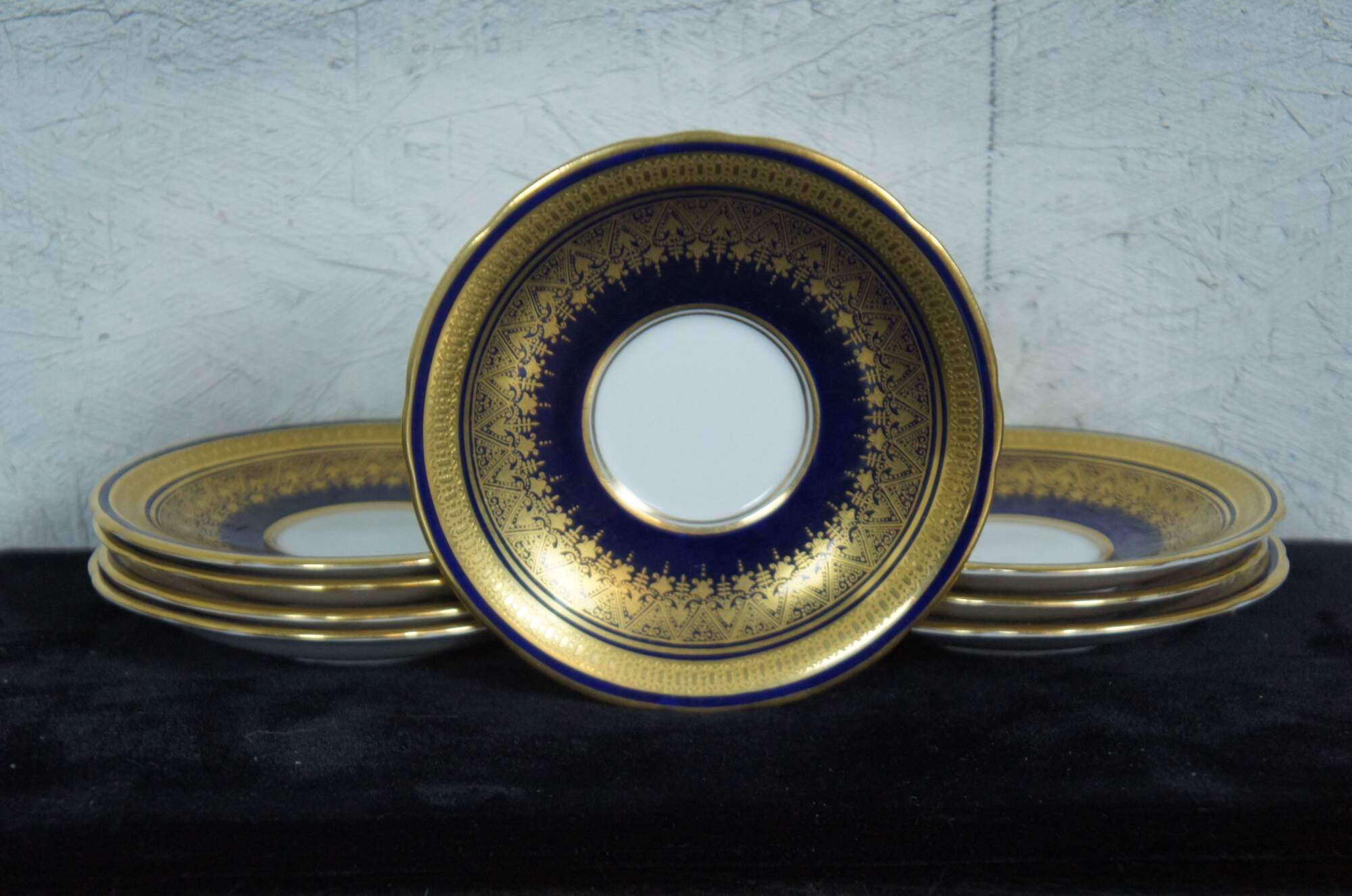 Vintage twenty piece John Aynsley bone china demitasse tea or coffe set in the Simcoe pattern number 7410, featuring an orante design encrusted in gold over cobalt blue and slightly scalloped edges. “Aynsley China Ltd. was a British manufacturer of bone china tableware, giftware and commemorative items. The company was founded in 1775 by John Aynsley in Lane End, Longton, Staffordshire. In 1861 his grandson John Aynsley built the historic Portland Works on Sutherland Road, Longton, Staffordshire.[4] The company's profitability made it a desirable acquisition. In June 1970 Spode put in a bid, this was then topped in July by Denbyware. Discussions then followed with Waterford Glass and a £1 million bid was agreed. In 1970 John Aynsley and Sons was taken over by Waterford and renamed Aynsley China Ltd. In 1987 Waterford sold the company in order to focus the group's fine china sales on the worldwide Wedgwood brand.[5]