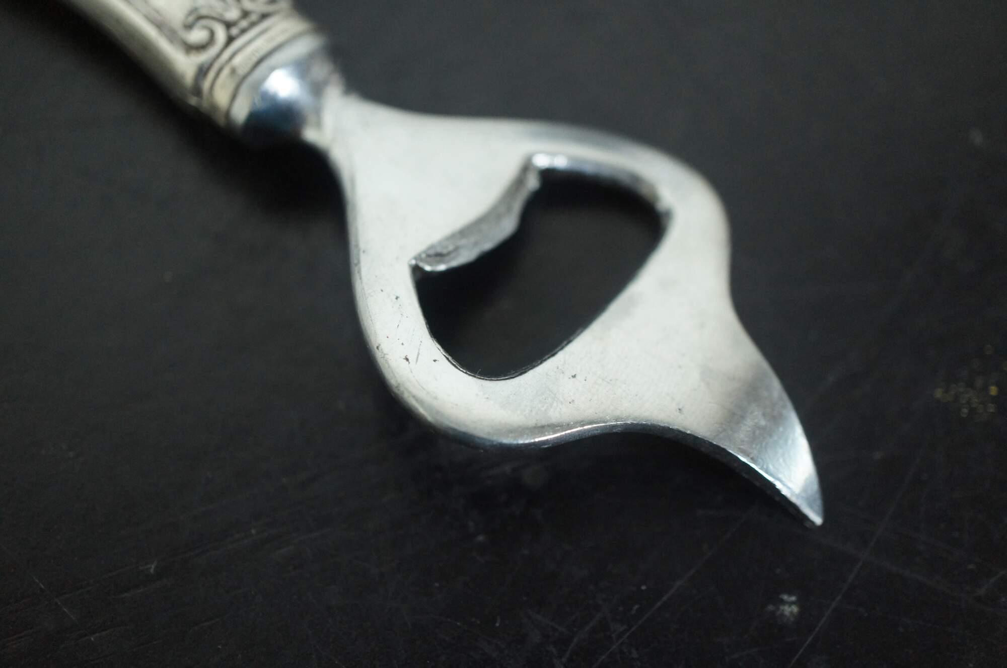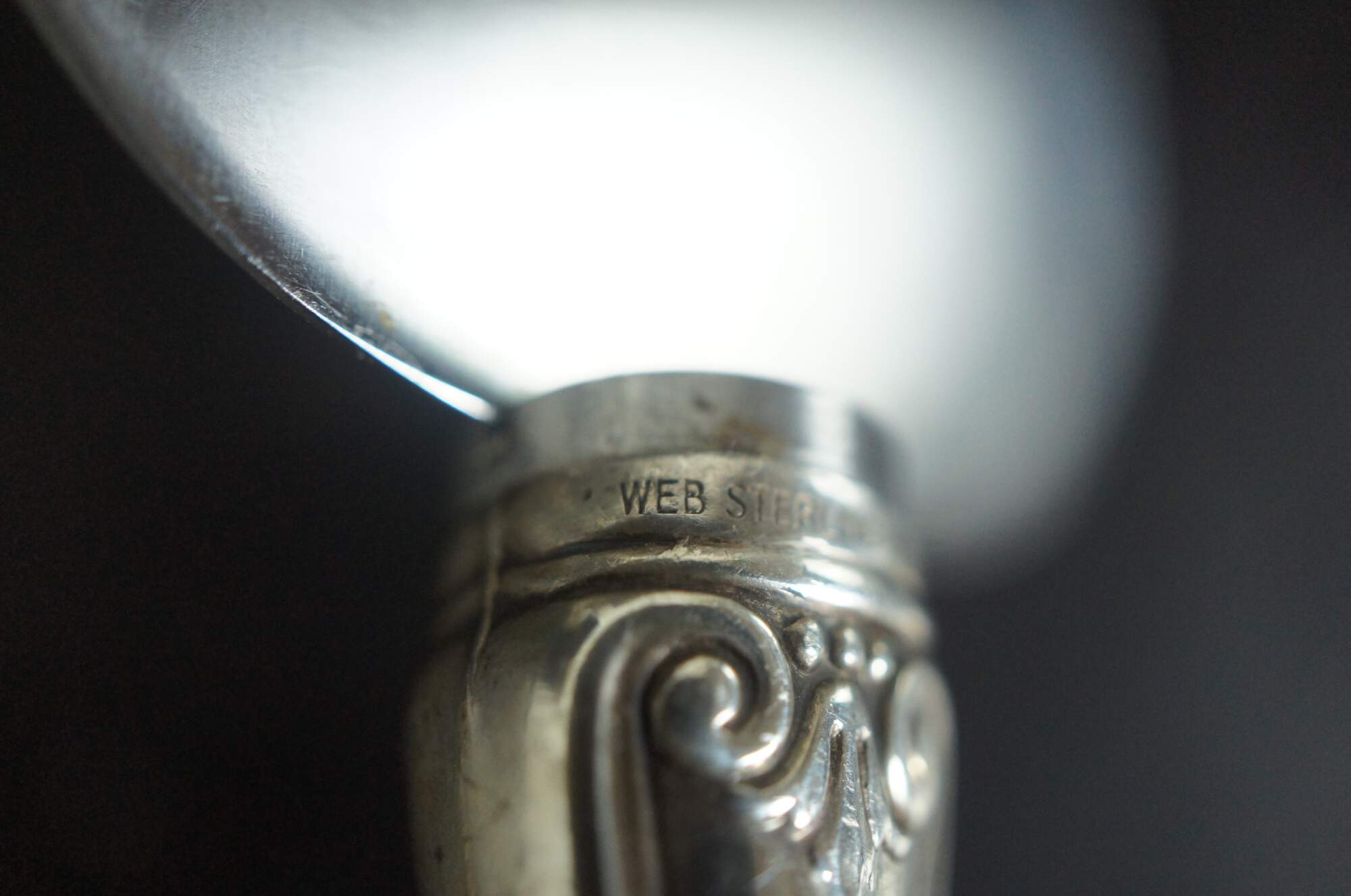 Vintage 1960s sterling silver and stainless steel cake knife and bottle opener by Web Sterling. Cake knife is engraved with “MEL & TDF 8-27-66.” “Web Silver Company - Philadelphia, PA ~ ca. 1950 to present. Holloware, flatware, & novelties in sterling. Acquired flatware dies from Wiedlich in 1952.”