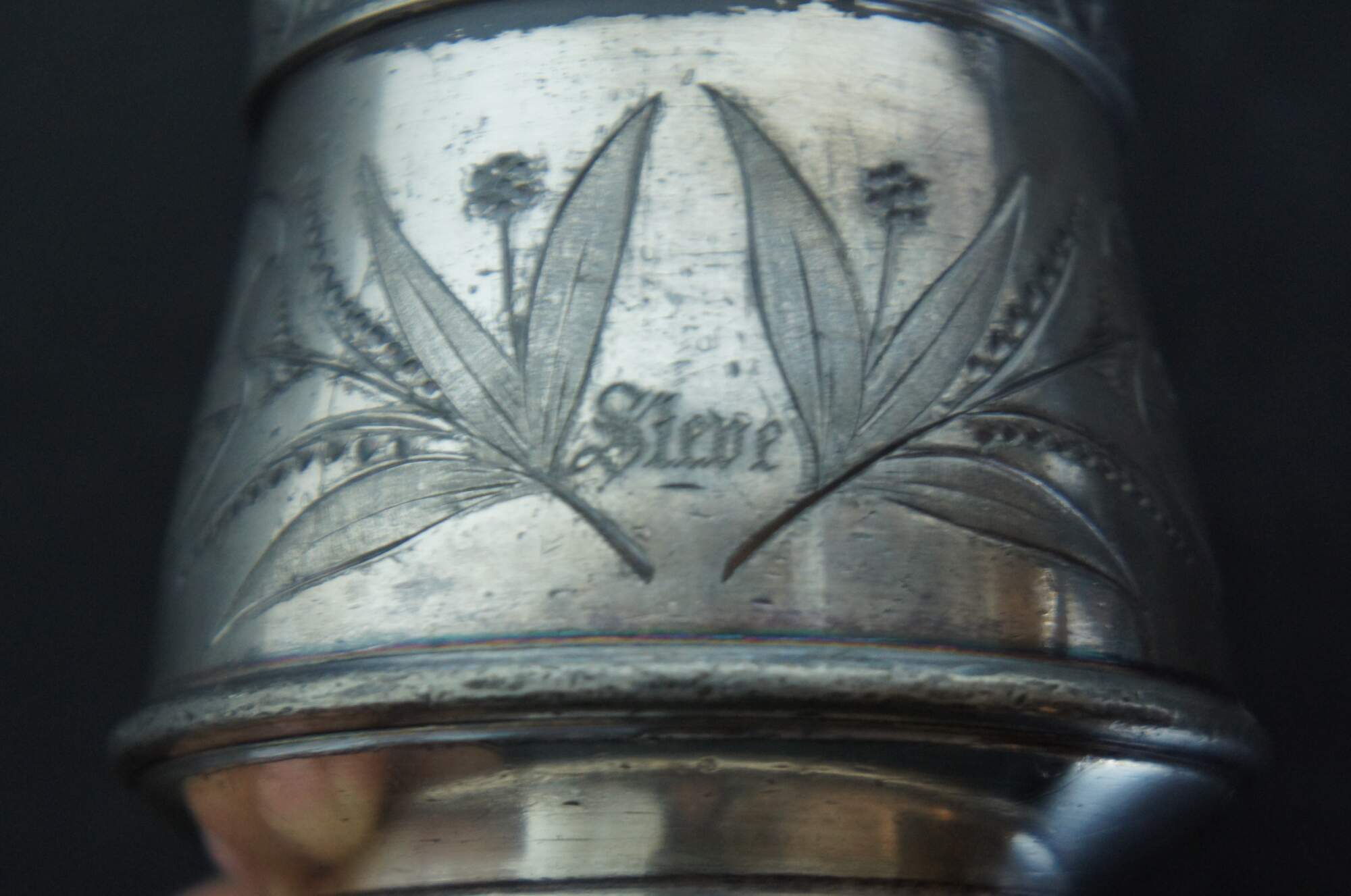 Antique Victorian Hartford Quadruple Silver Plate number 2 mug or cup, eithed with a eastlake design of flowers and an artist’s palette, and engraved with the name Steve.