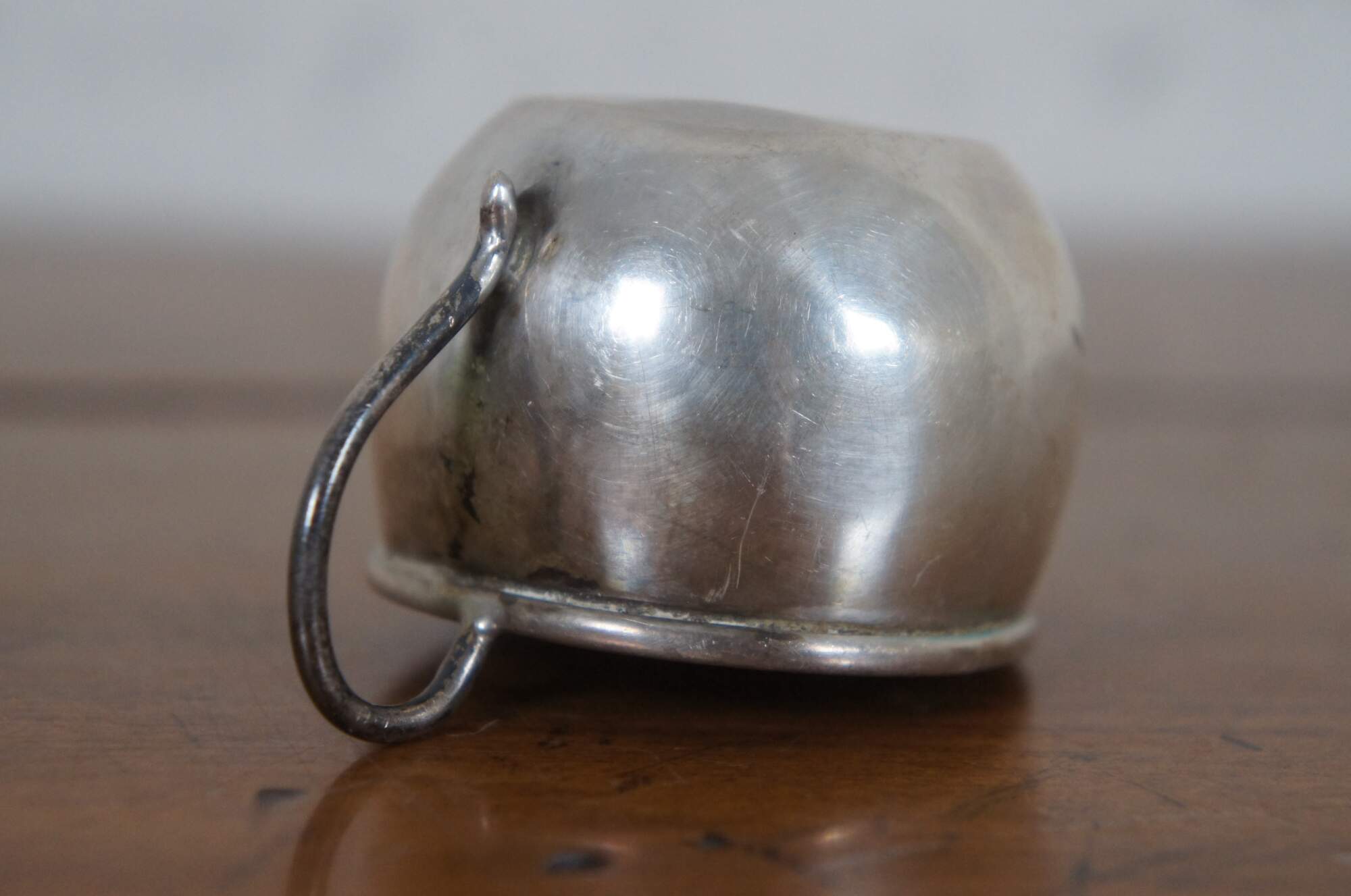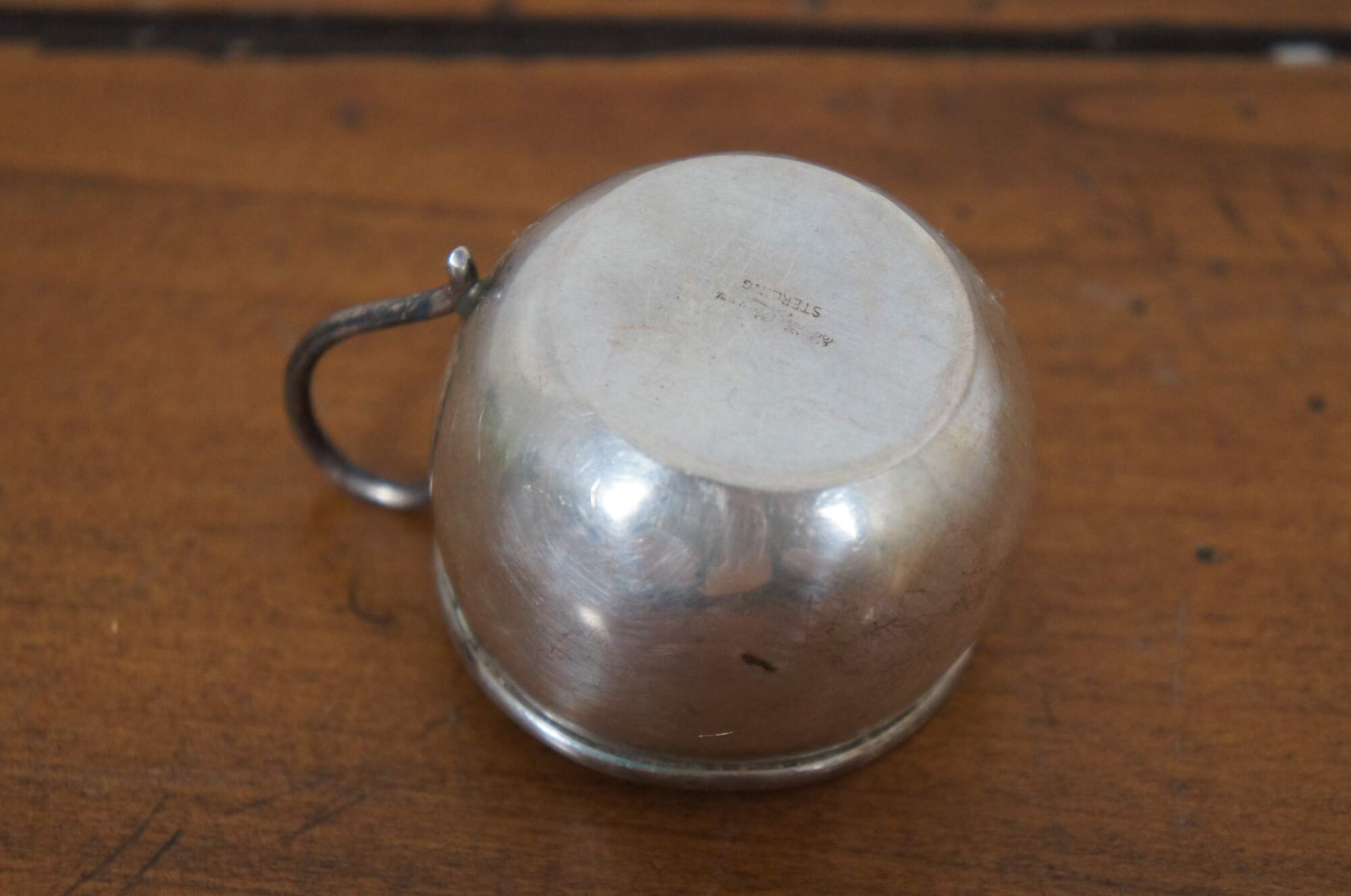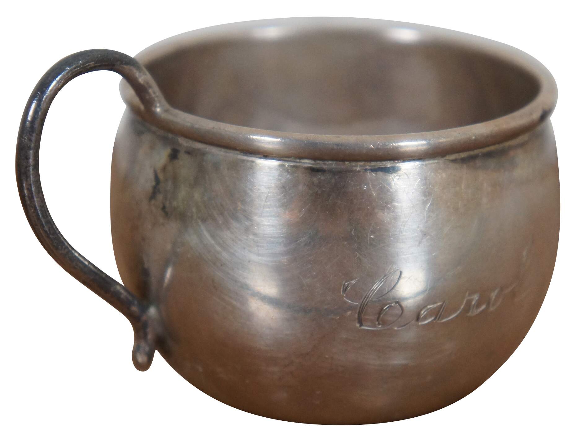 Antique sterling silver baby’s christening cup or mug with a round body, engraved with the name Carol.