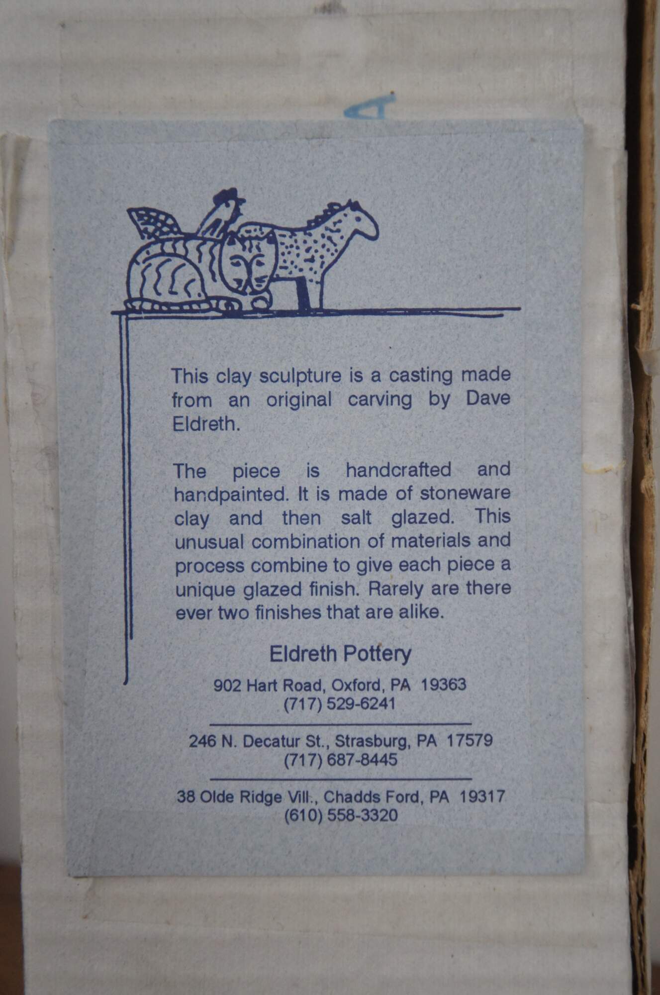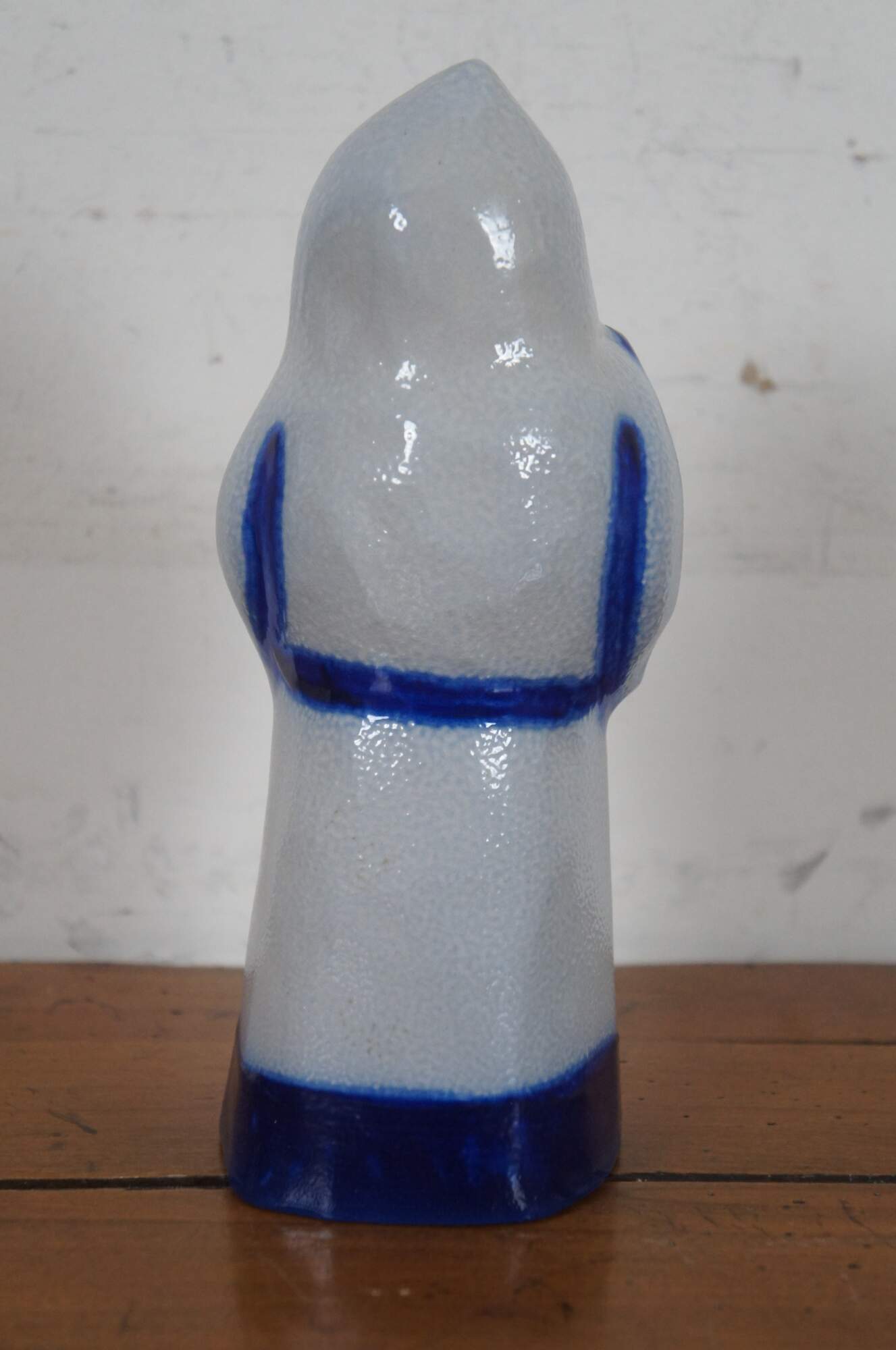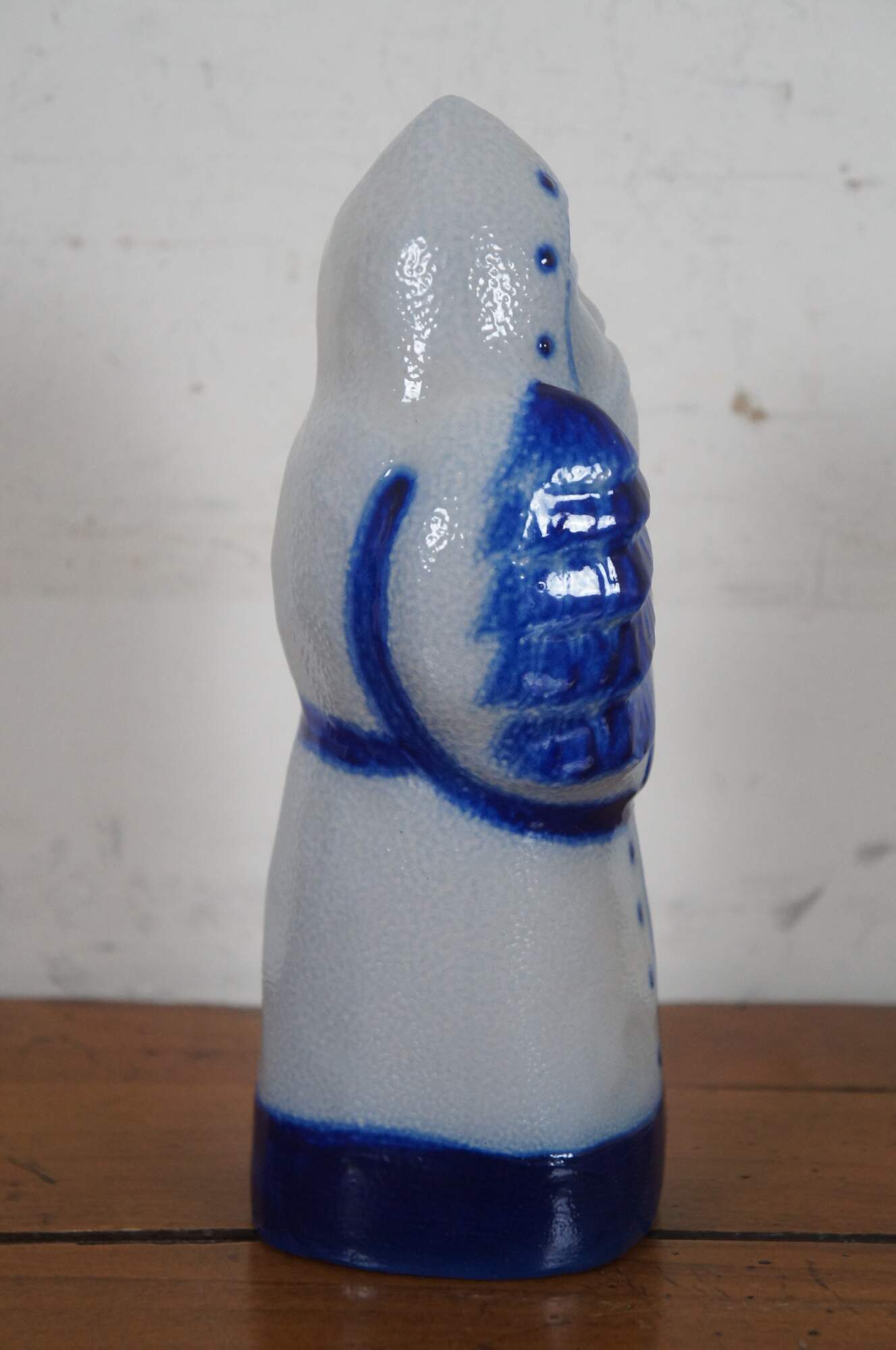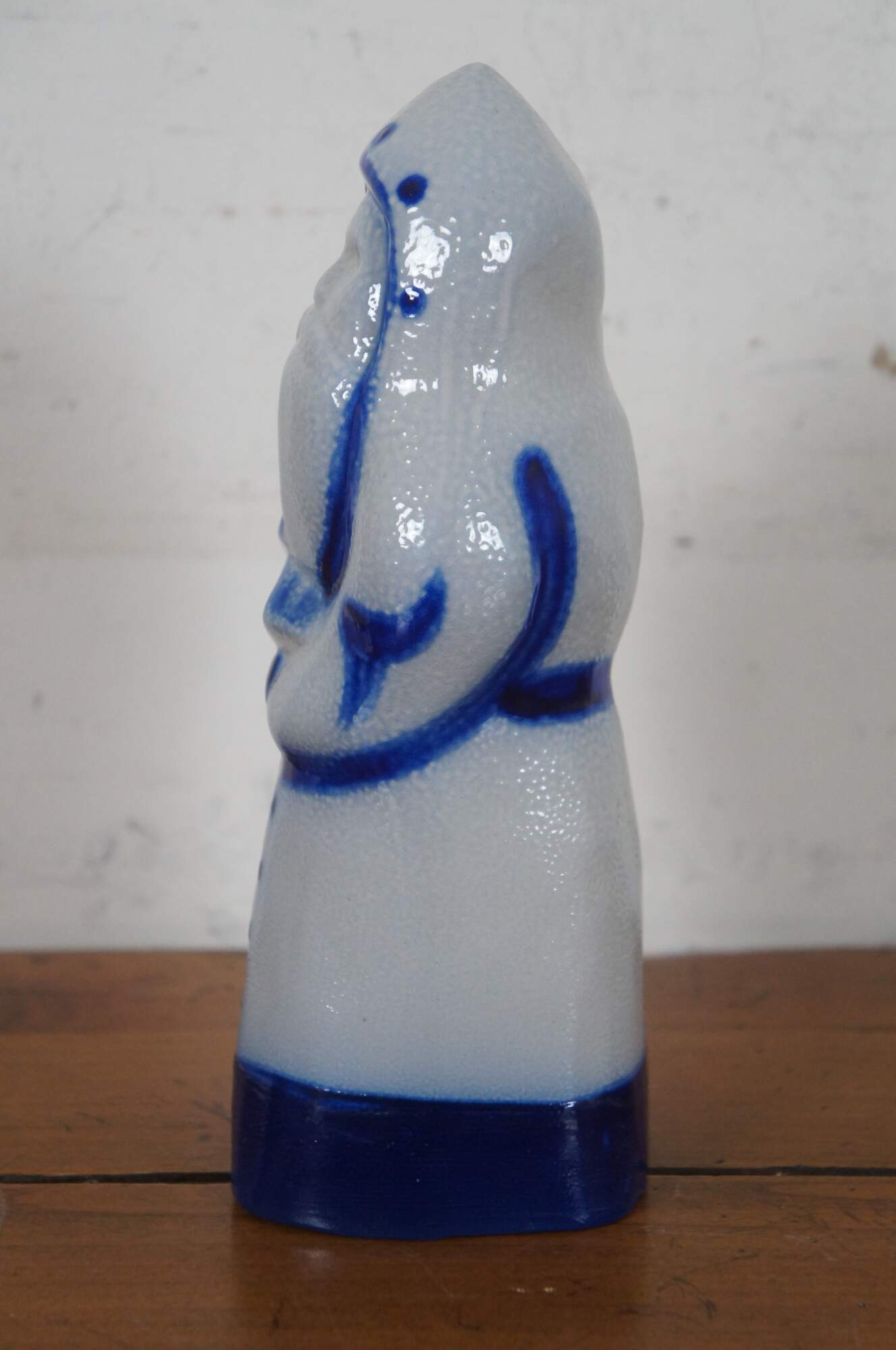 Vintage blue and white stoneware salt glazed sculpture by Dave Eldreth Pottery shaped like an antique style Santa Claus holding a pine tree. Includes original box.