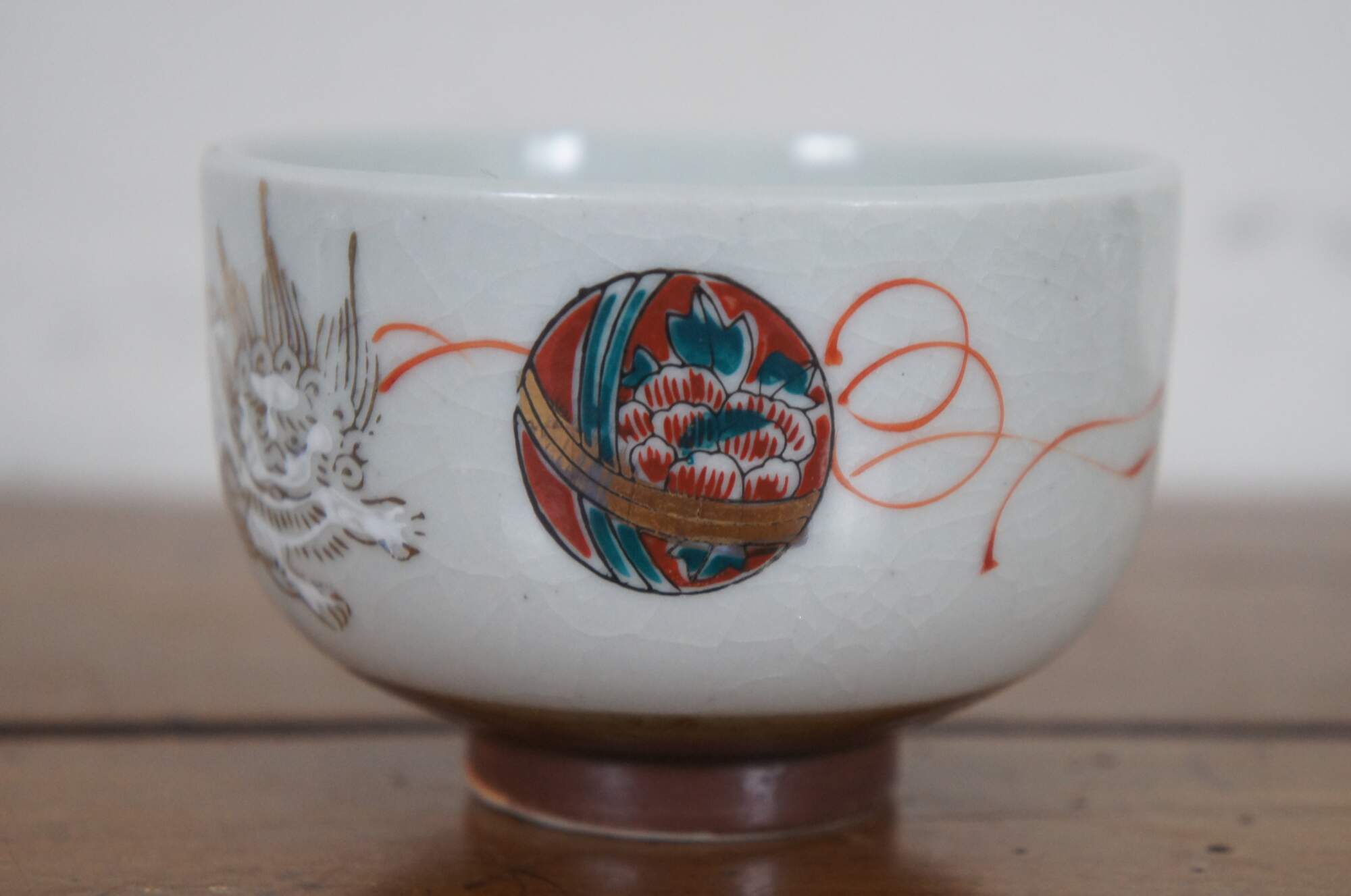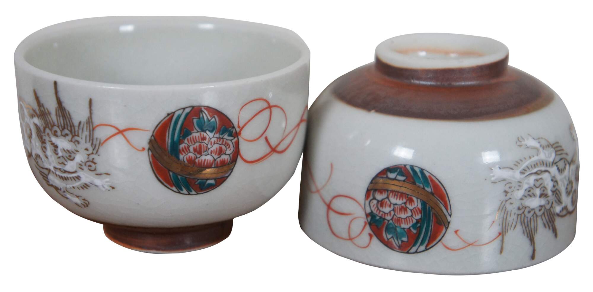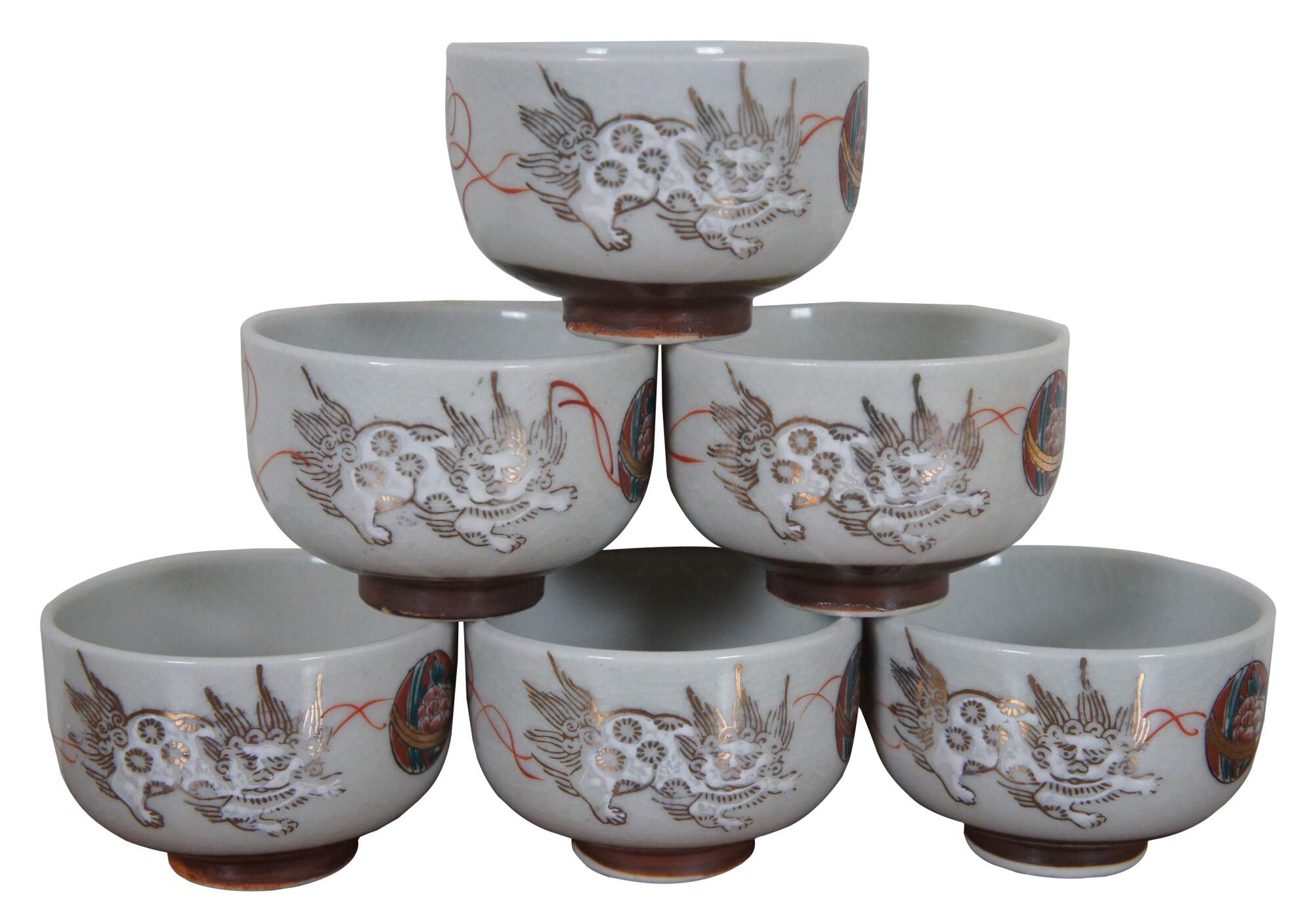 Set of six vintage Japanese porcelain tea cups with brown un-glazed bases, painted with white and gold lions and red and green floral medallions.