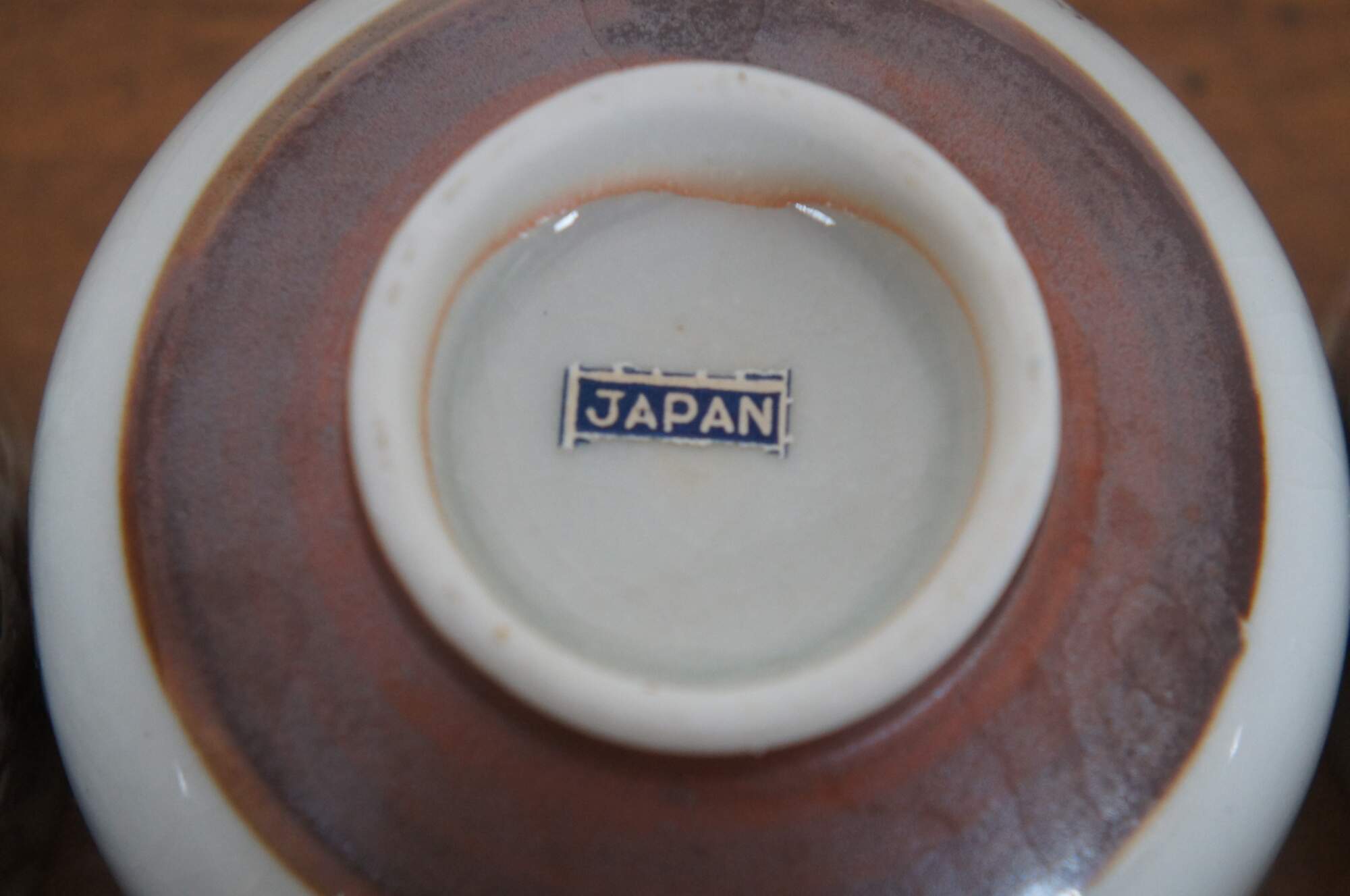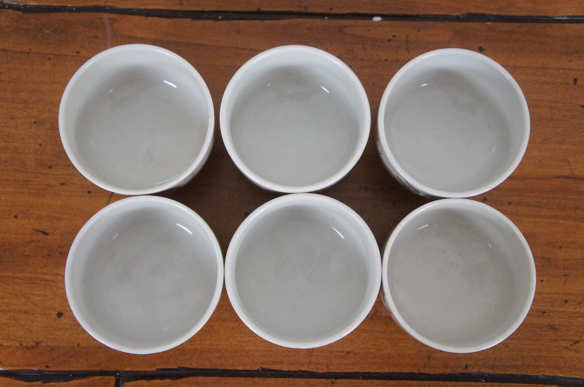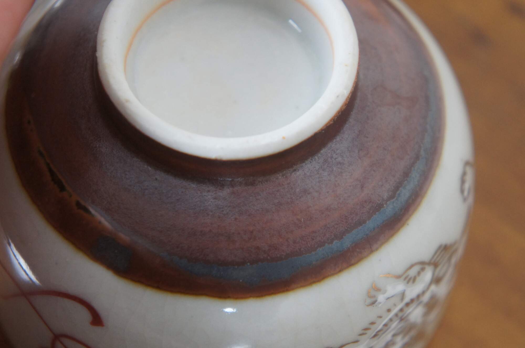 Set of six vintage Japanese porcelain tea cups with brown un-glazed bases, painted with white and gold lions and red and green floral medallions.