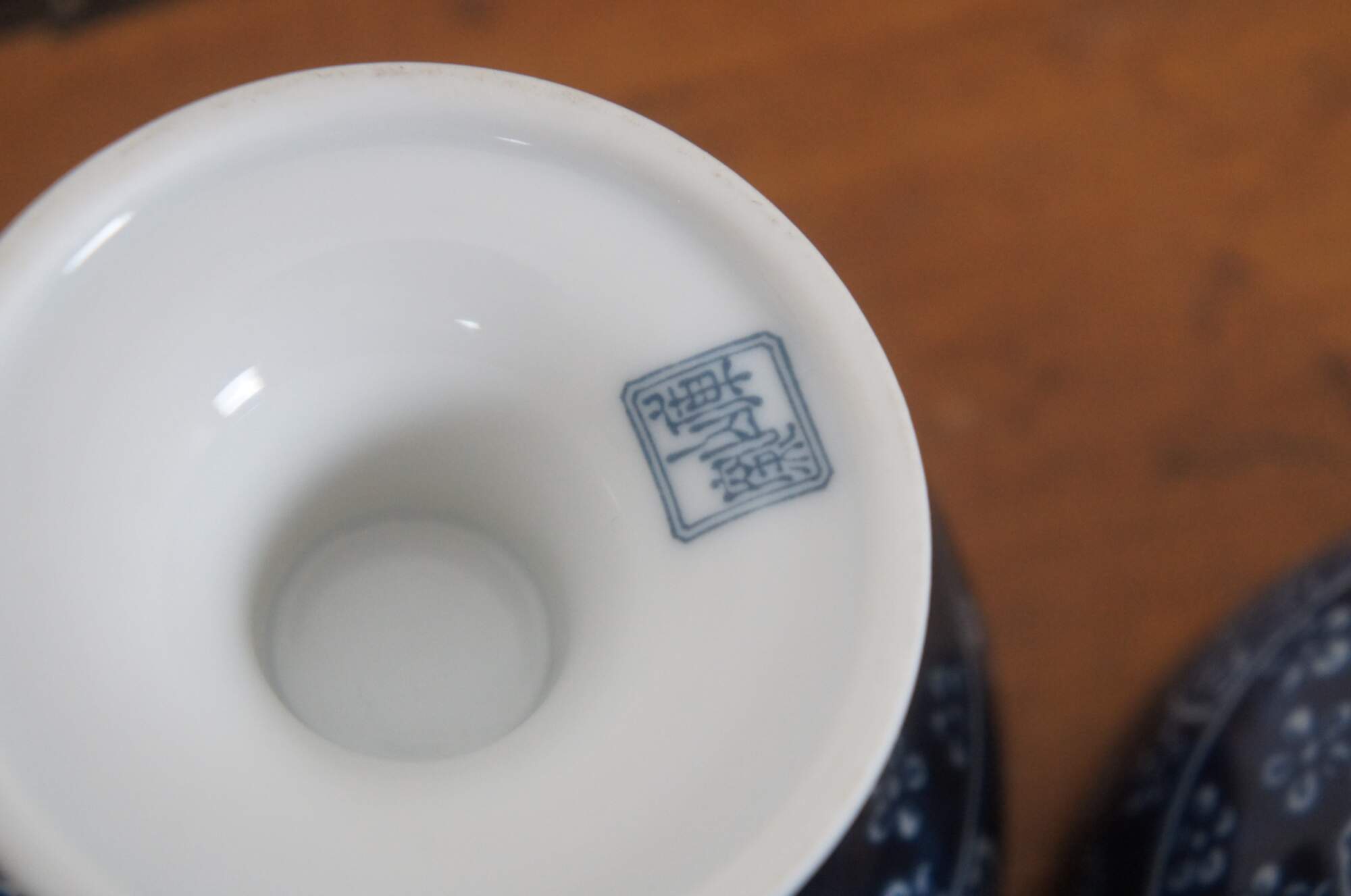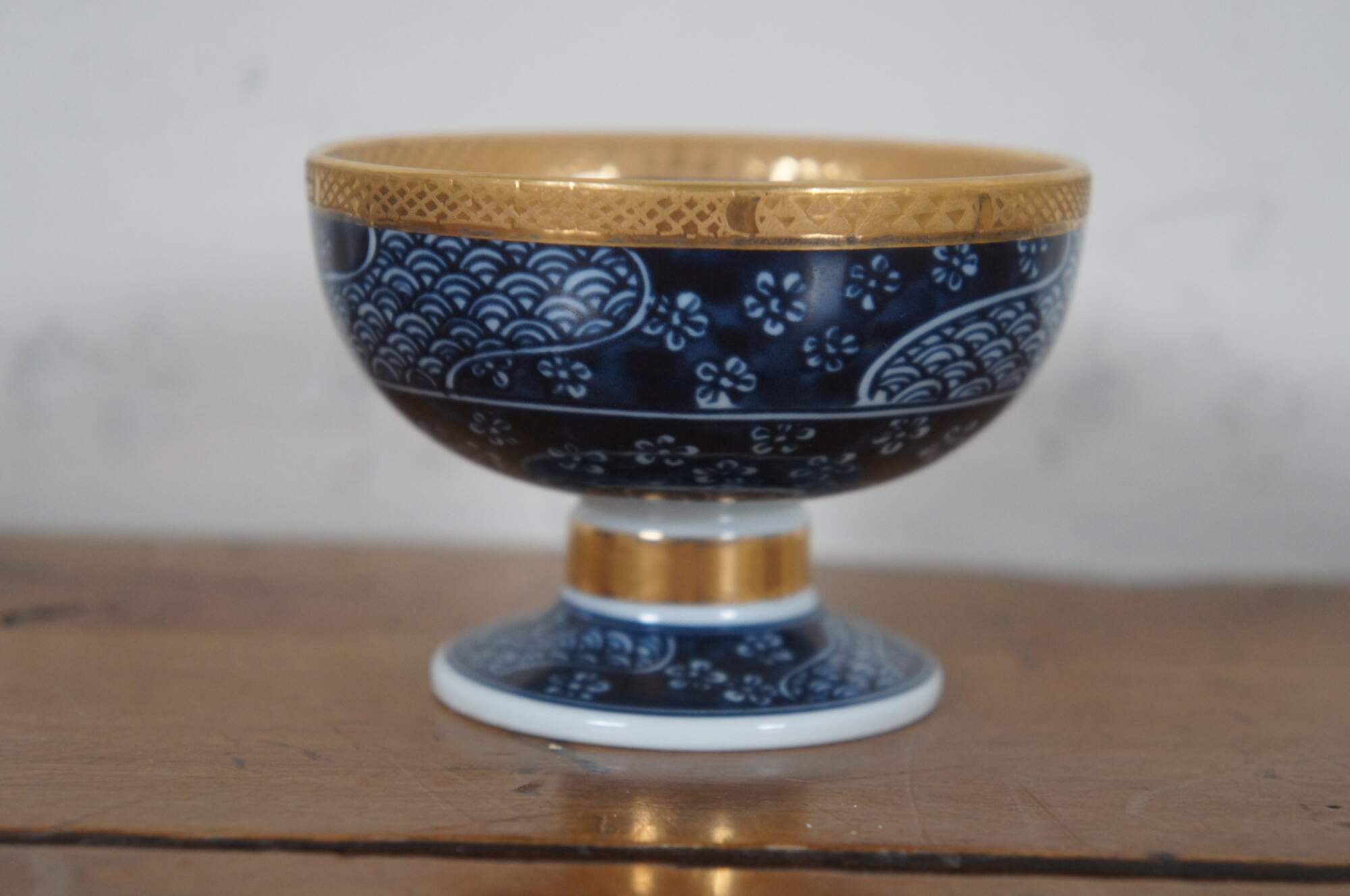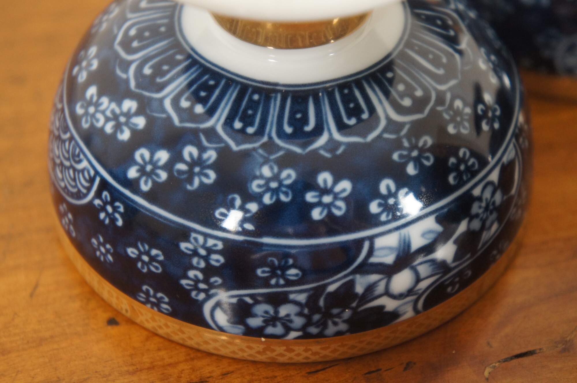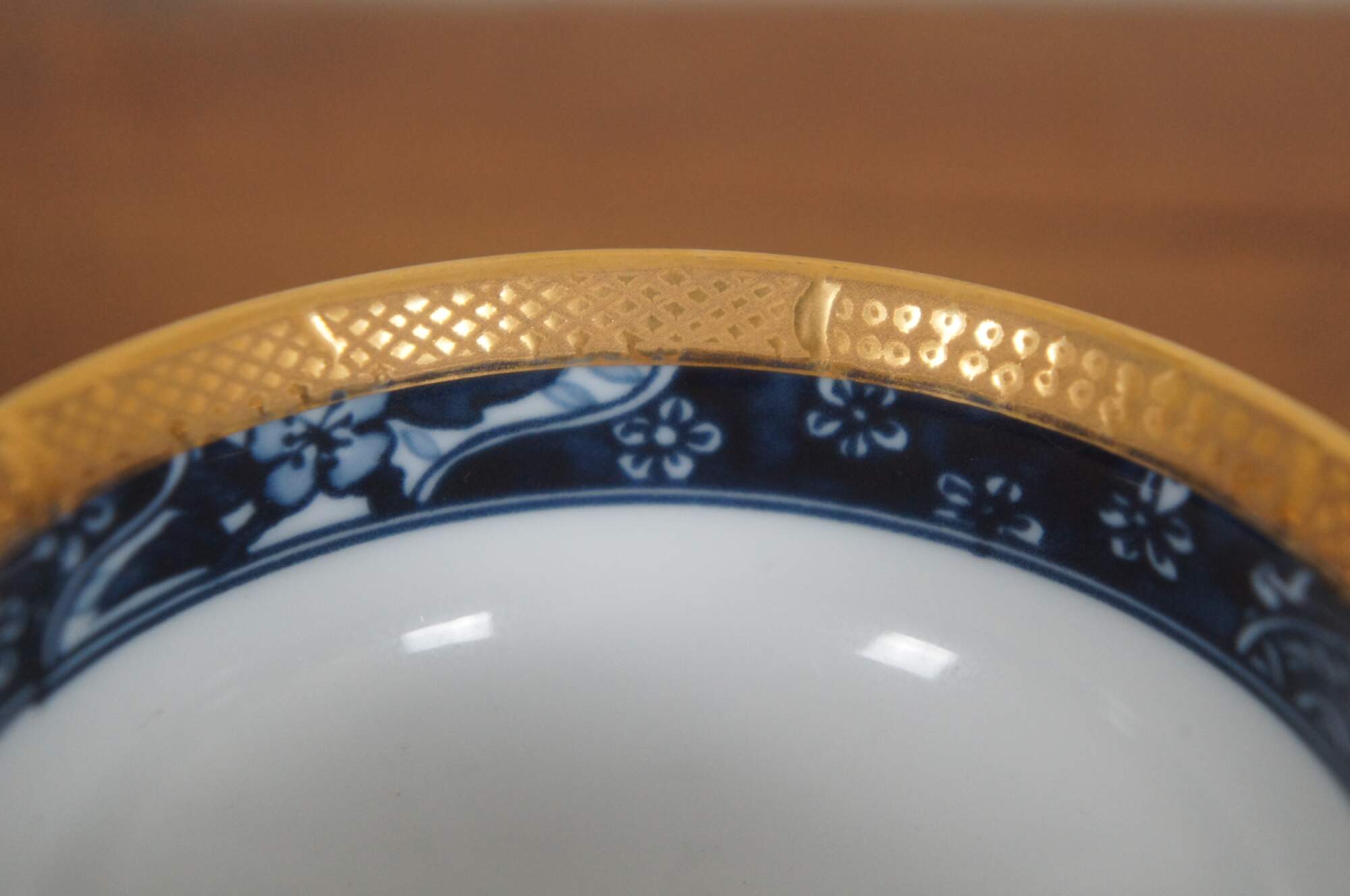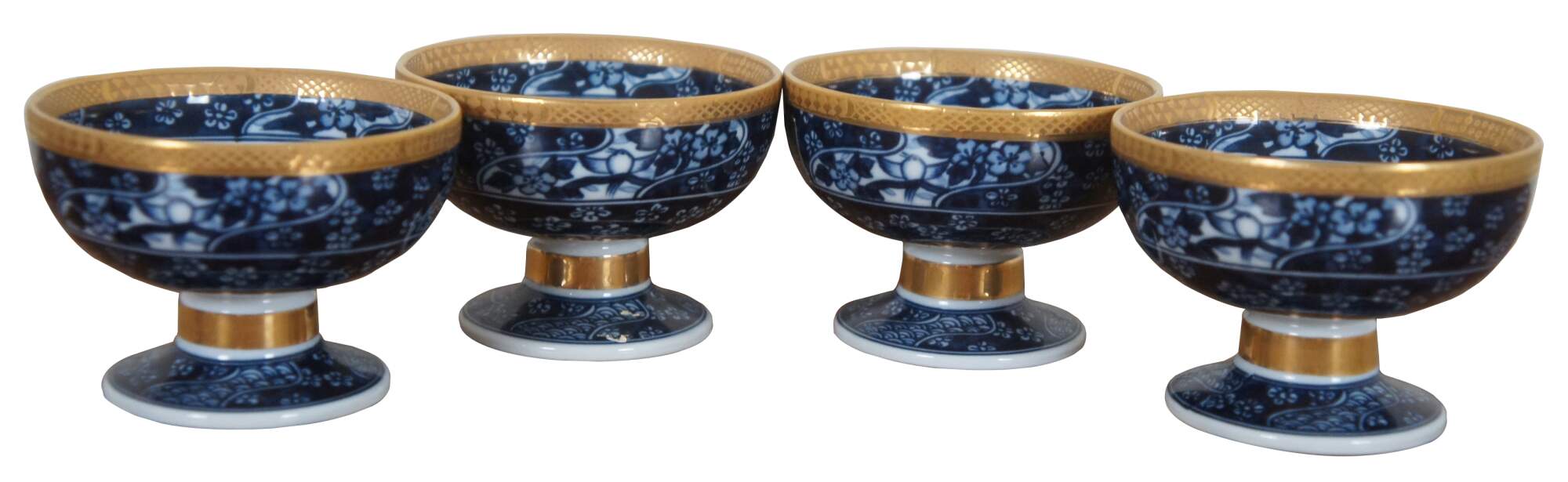 Set of four Japanese floral blue and white porcelain rice bowls with bright gold trim.