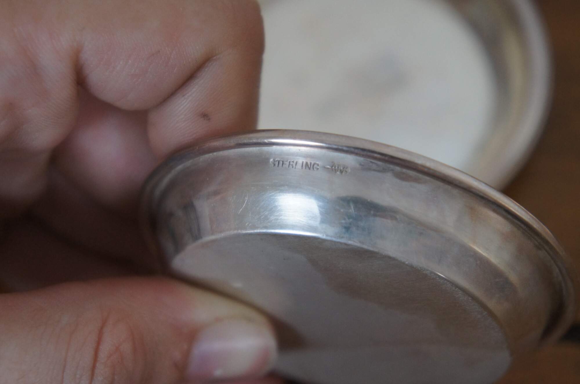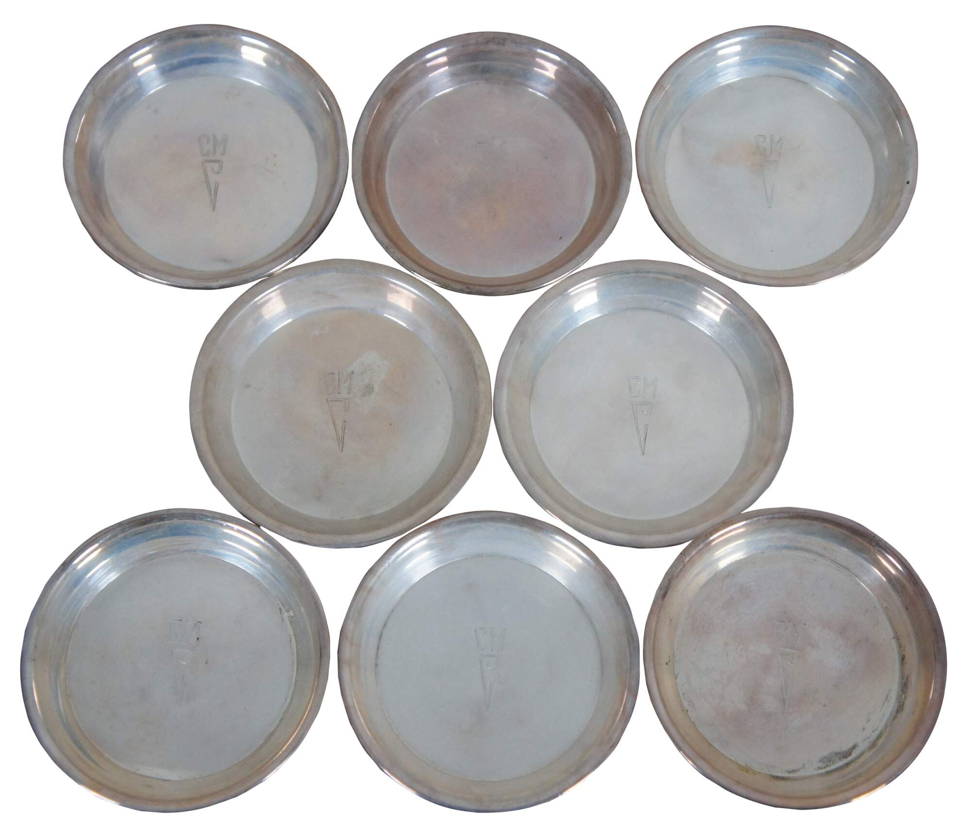 Set of eight vintage Webster Co sterling silver drink coasters engraved with the initials CMC. North Attleboro, MA - founded in 1869 by George K. Webster.