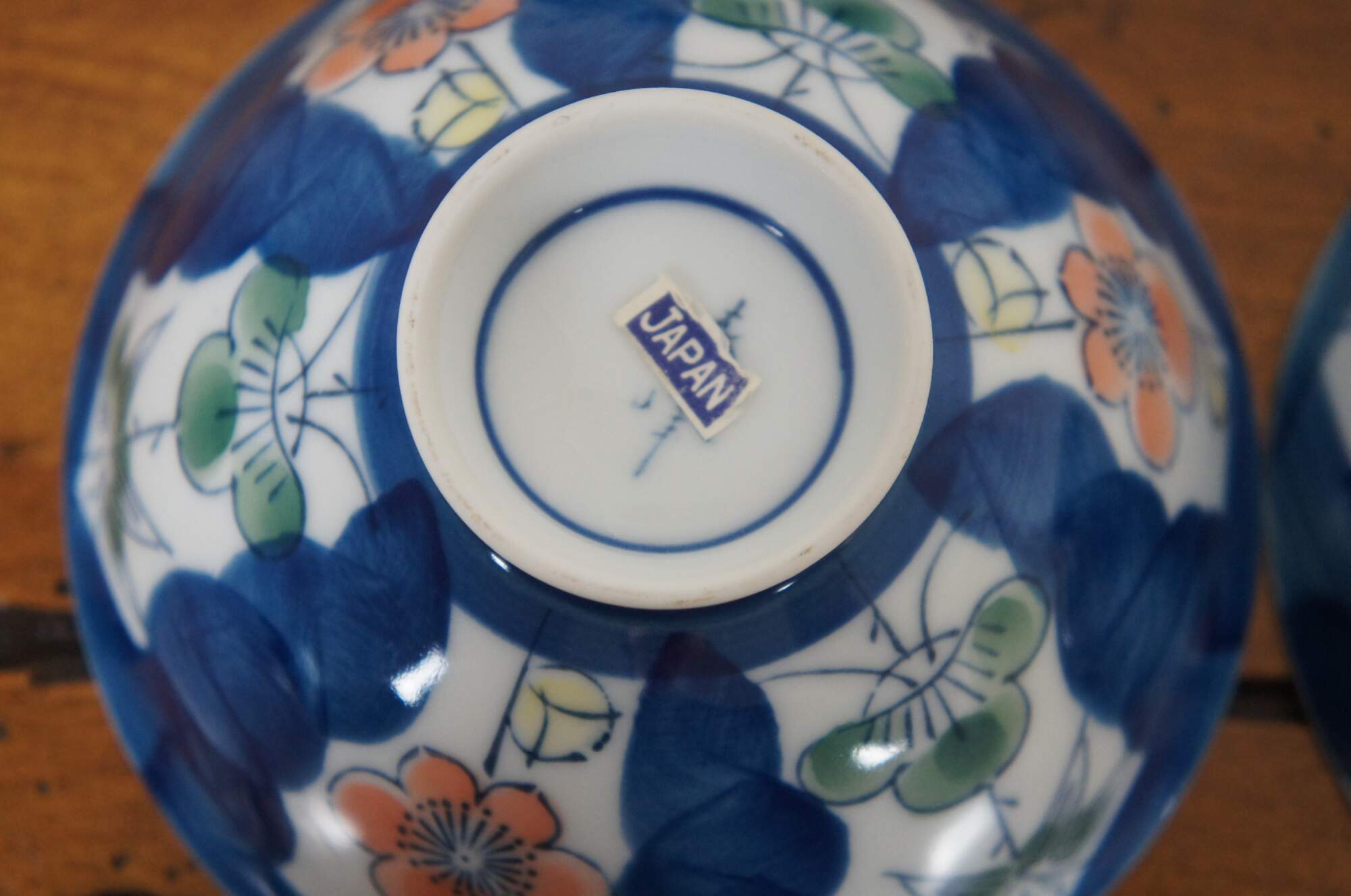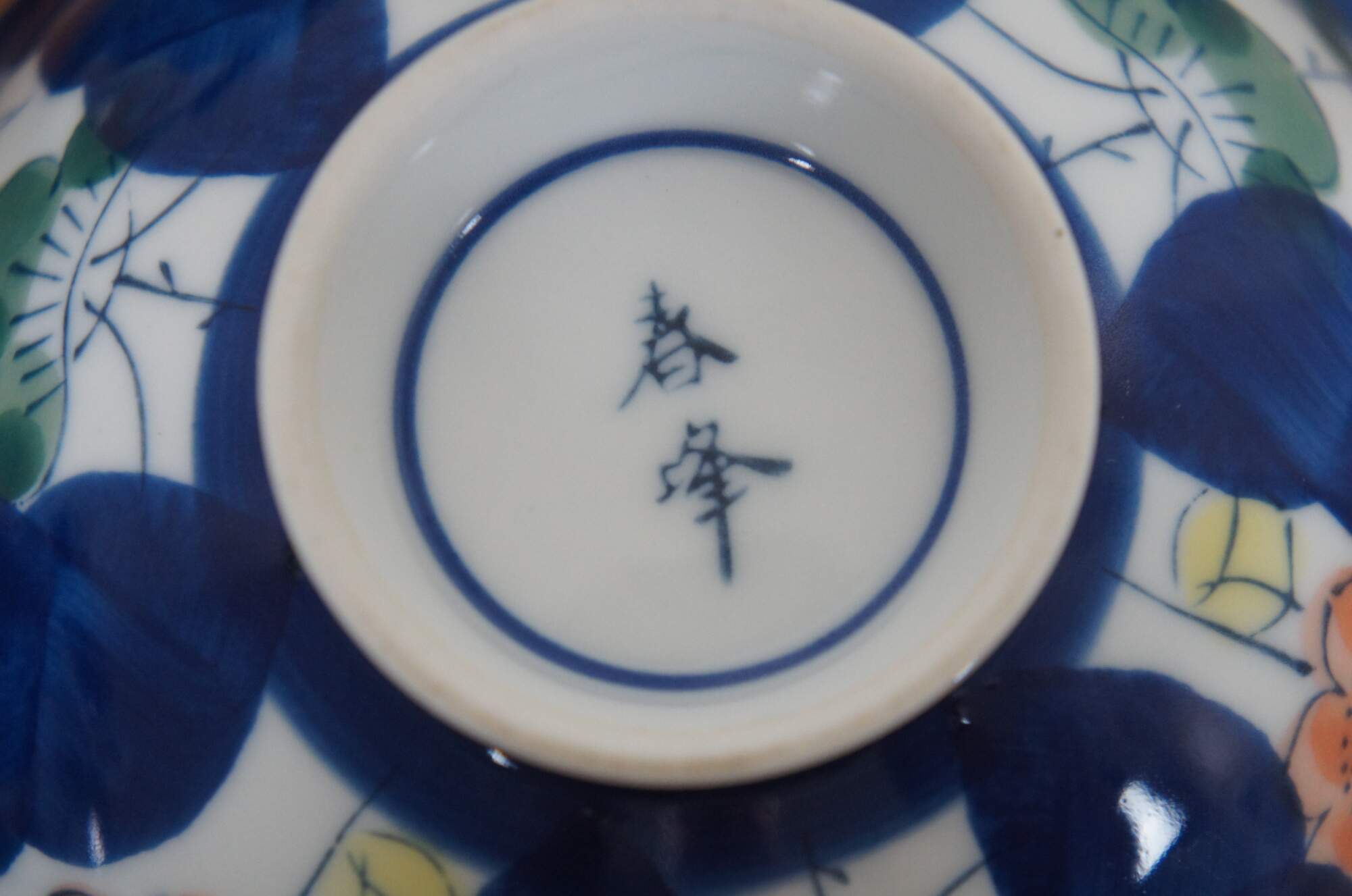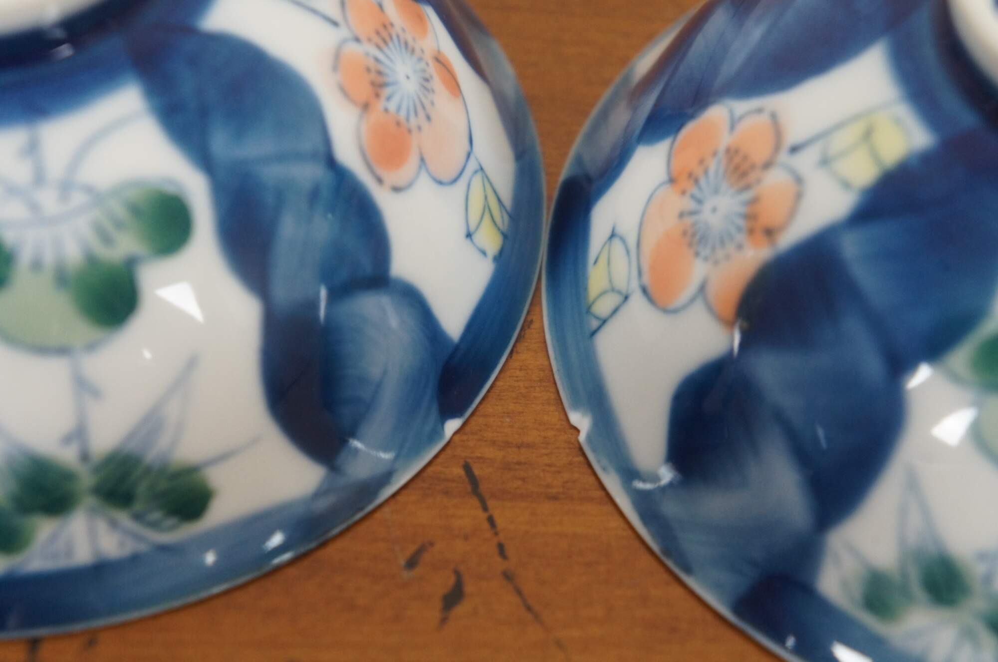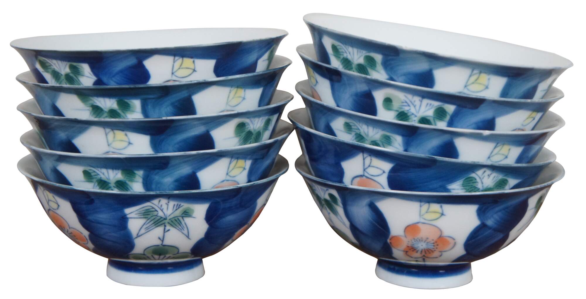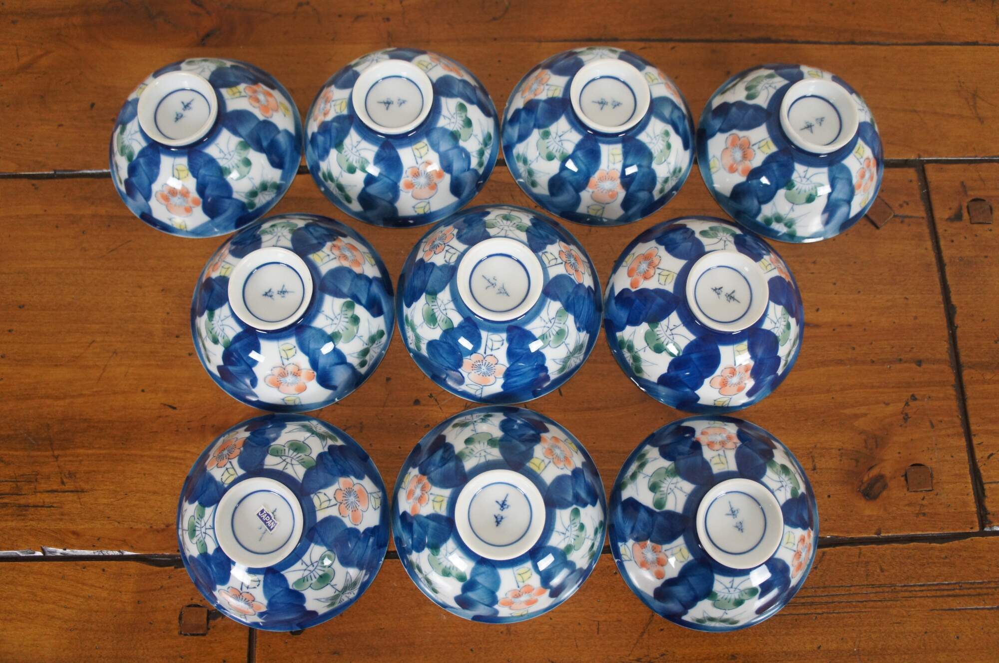 Vintage set of ten Japanese rice bowls painted with an imari / arita style with blue, peach and green florals.