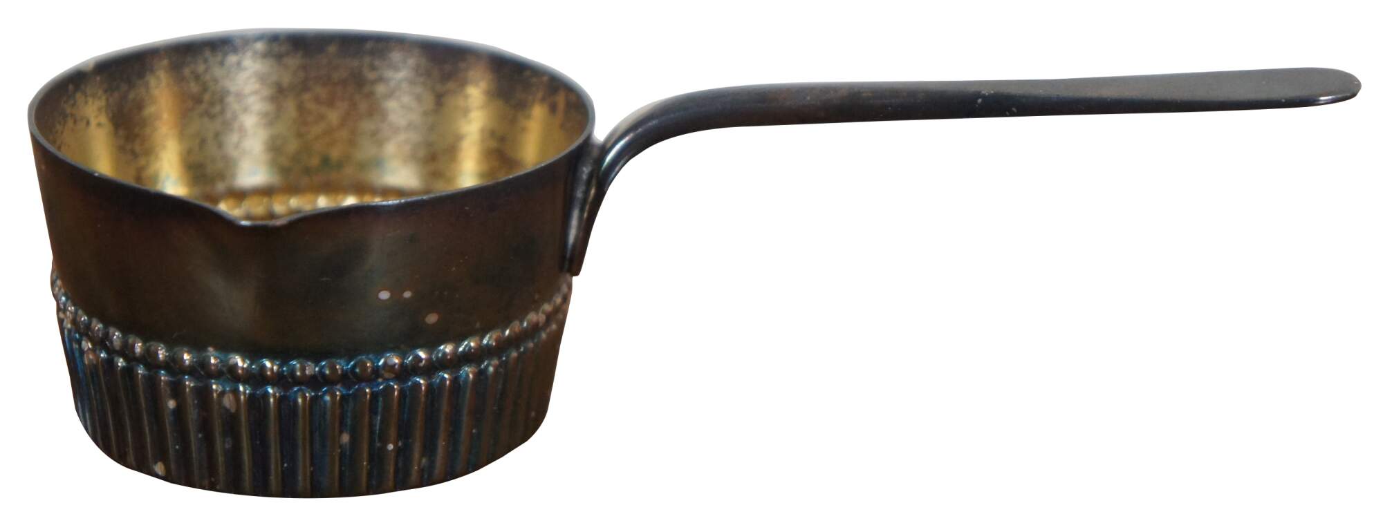 Early to mid 1800s sterling silver measuring scoop with spout by Taylor and Lawrie with fluted and beaded sides and small pour spout.. “Philadelphia, PA - Active ca. 1837-1850. Working silversmiths Robert H. Taylor and Robert D. Lawrie; Taylor was Scottish, Lawrie was Irish, hence the thistle and harp in their manufacturer's mark, often seen with other retailer's mark.”
