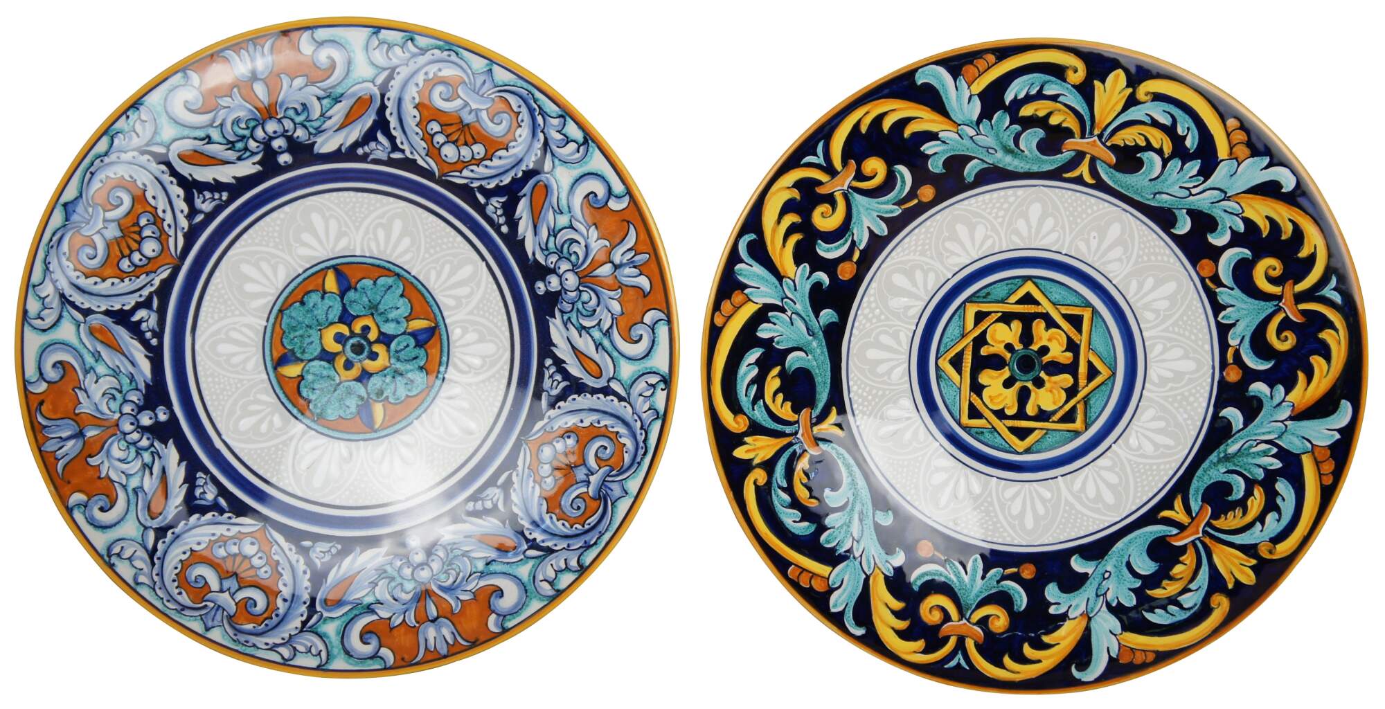 Two ceramic Francesca plates made in Deruta Italy for Cottura pottery with colorful geometric patterns both with wire for hanging.