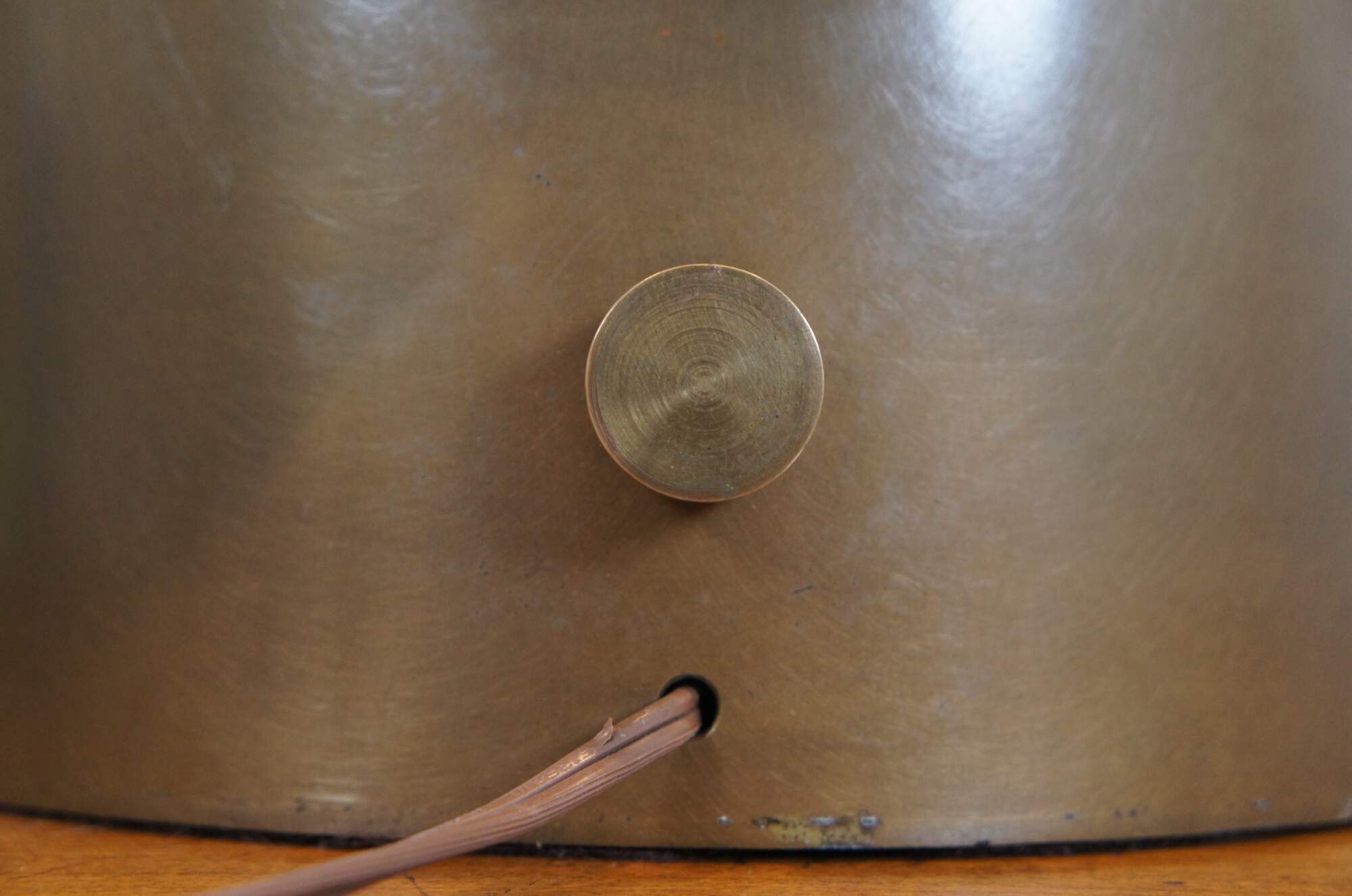 Two vintage Restoration Hardware heavy brass canister table lamps featuring cylindrical / round geometric form with lower dimmer knob, circular finial and oversized tapered shade.