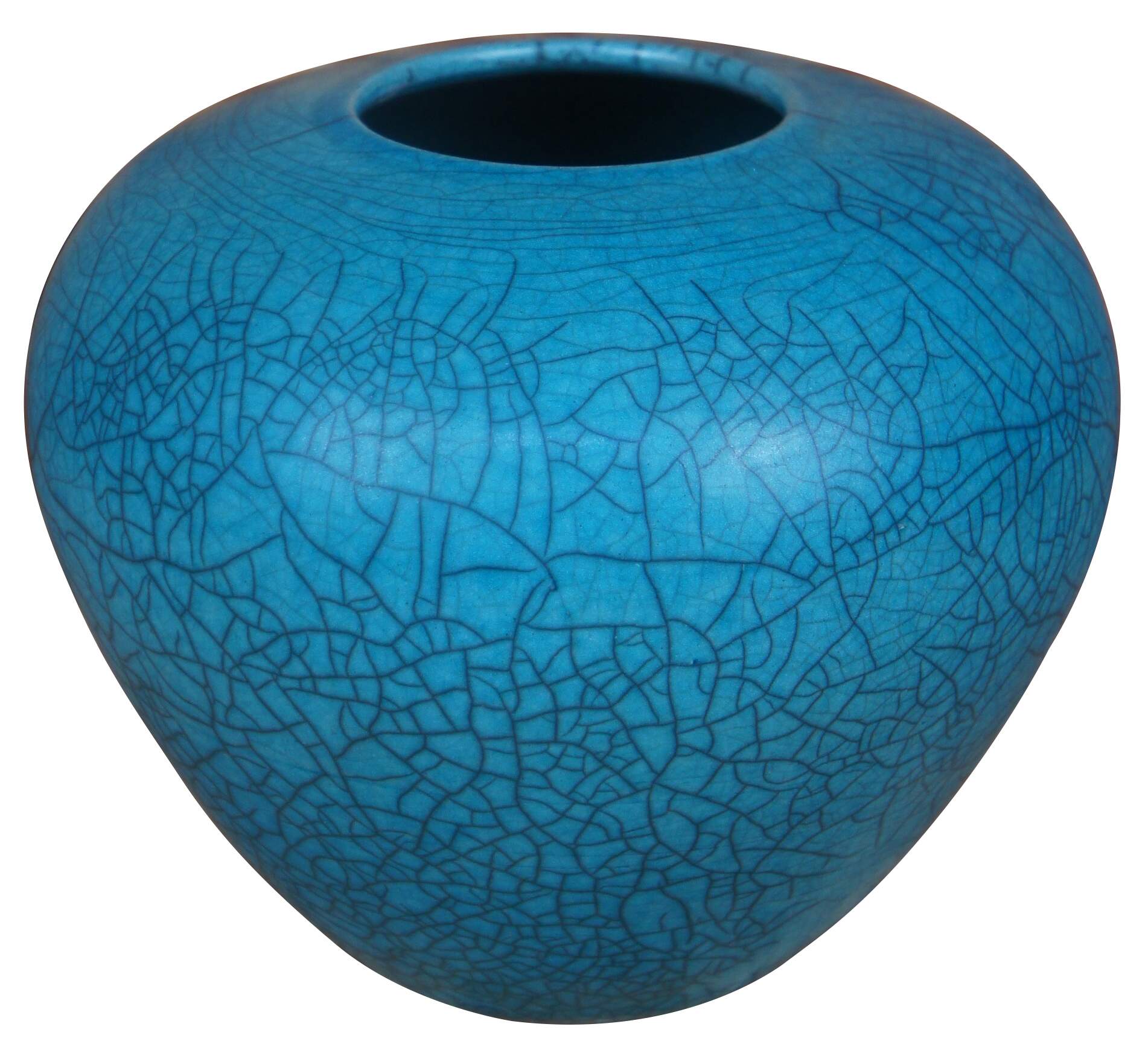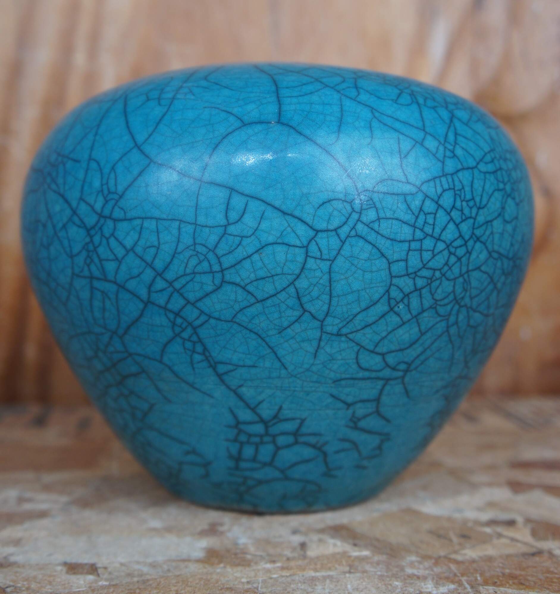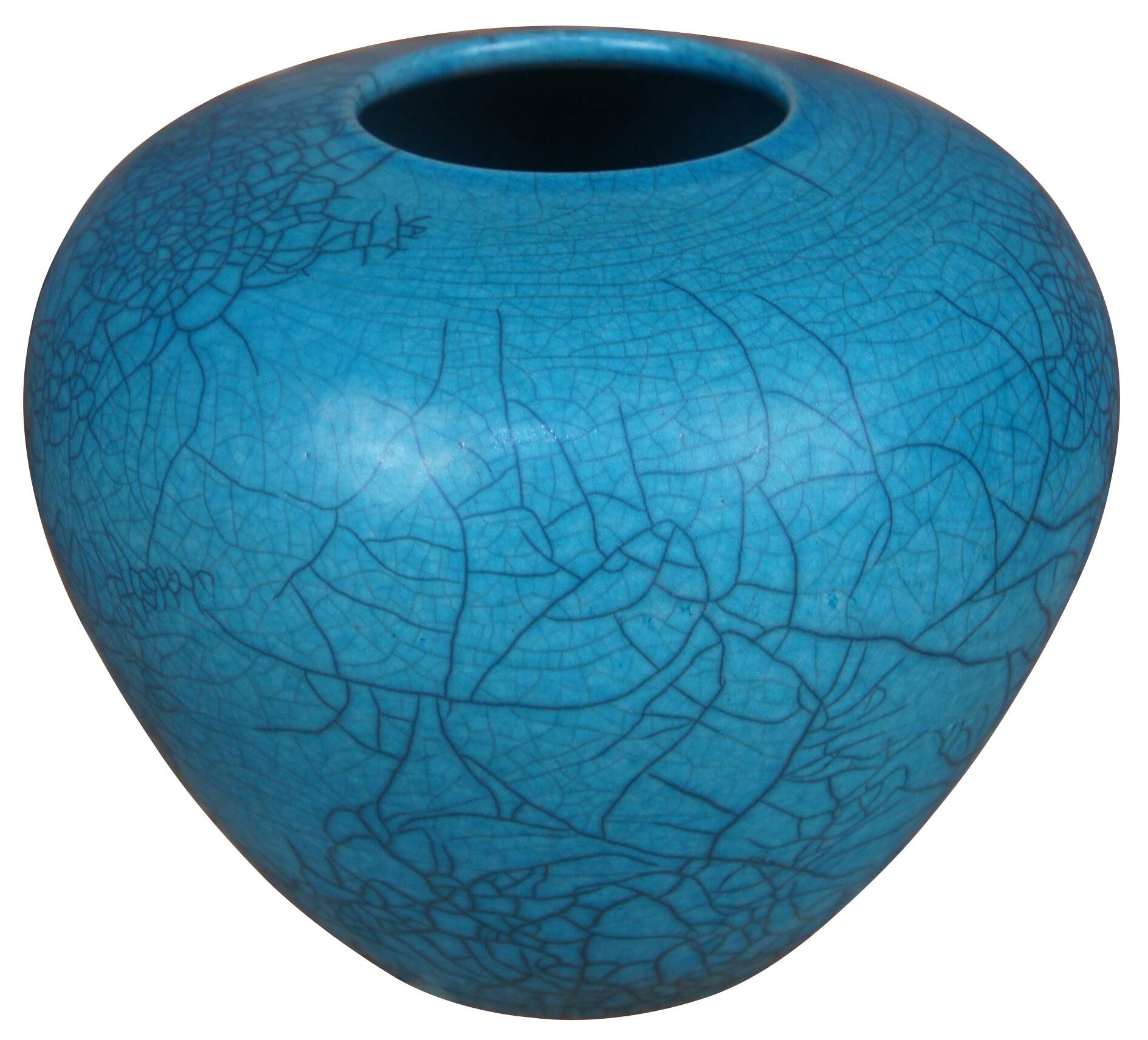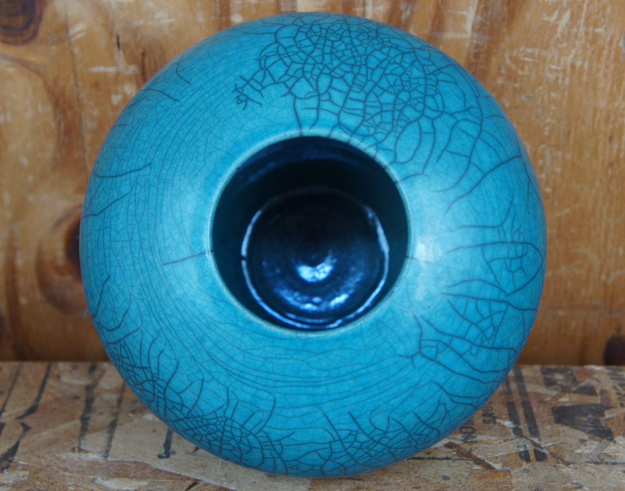 1980s vintage raku ceramic centerpiece vase by Les Mitchell Studio of Dallas Texas with crackled texture distinctive of raku in turquoise azure blue.