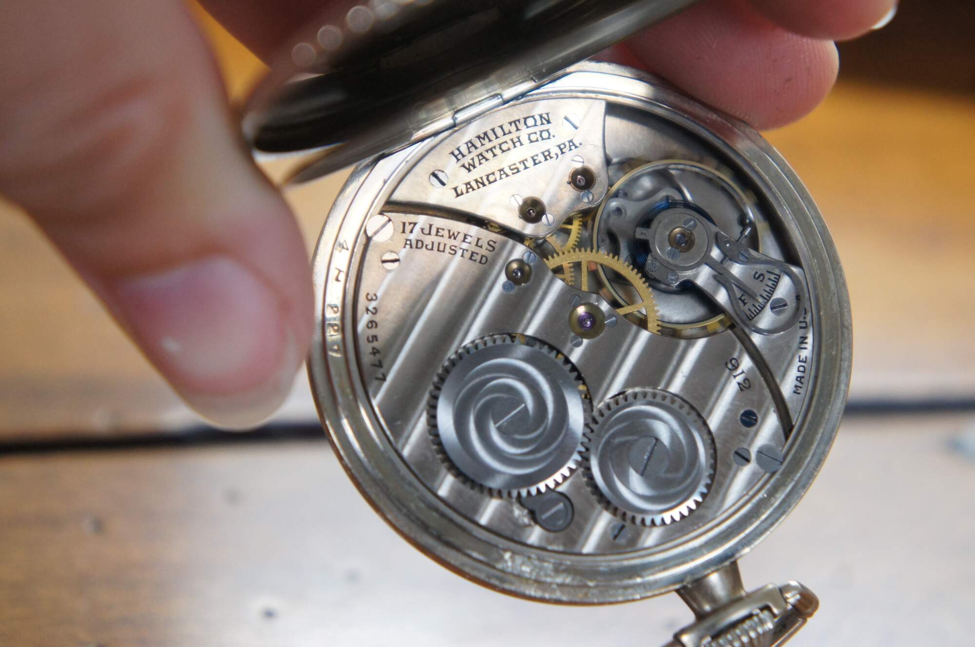 Antique 1920’s 14K white gold filled mechanical railroad pocket watch by Hamilton Watch Company of Lancaster, PA, featuring an art deco foliate design around the sides and an embossed medallion on the face; case marked with Fahys caduceus logo and serial number 741227, works serial number 3265477, grade 912, 17 Jewels. Includes original box. Runs when wound.