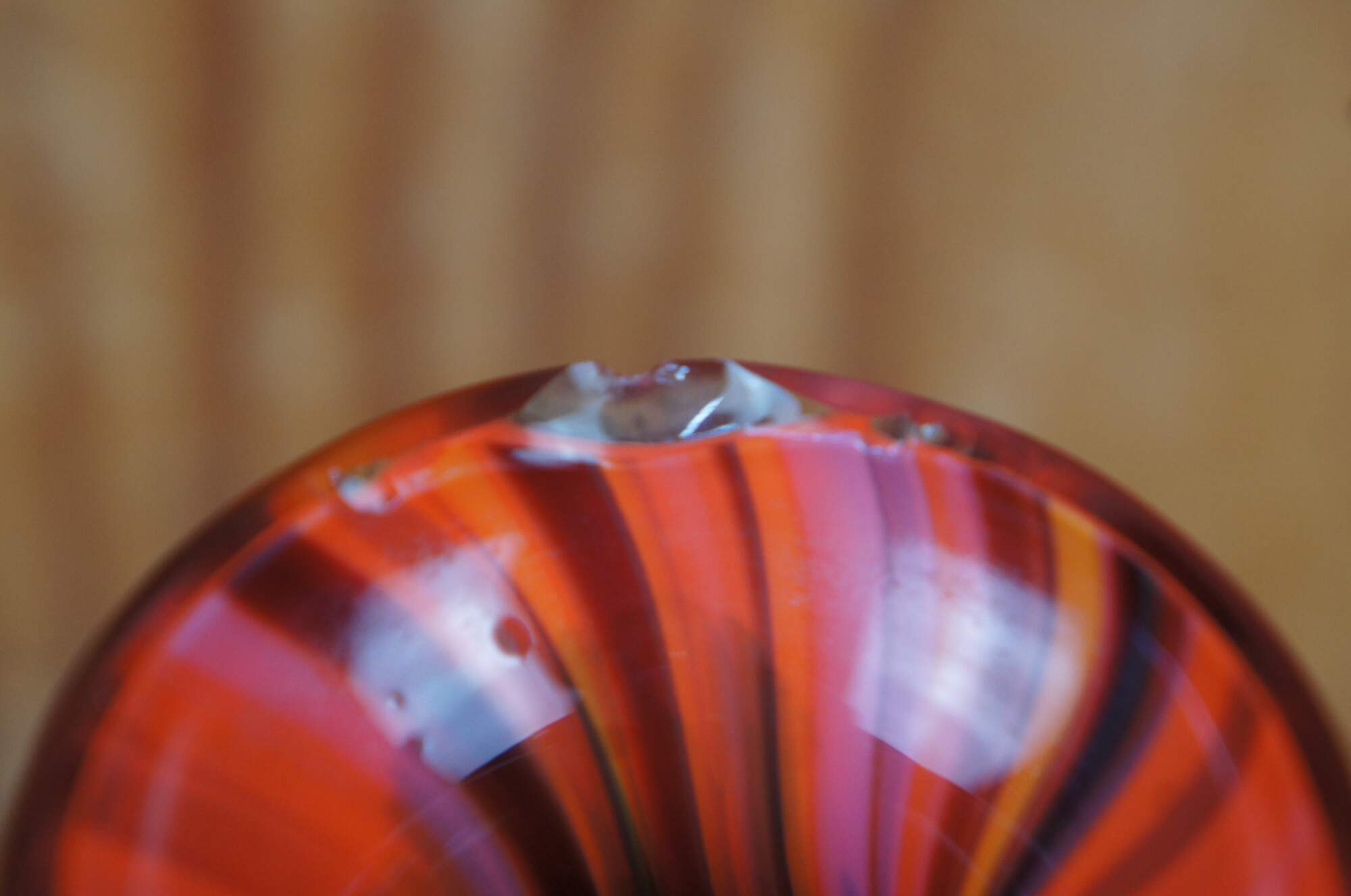 Five vintage Bohemian Czechoslovakian art glass bud vases featuring swirled / flared / ruffled designs with vibrant colors and black accents.