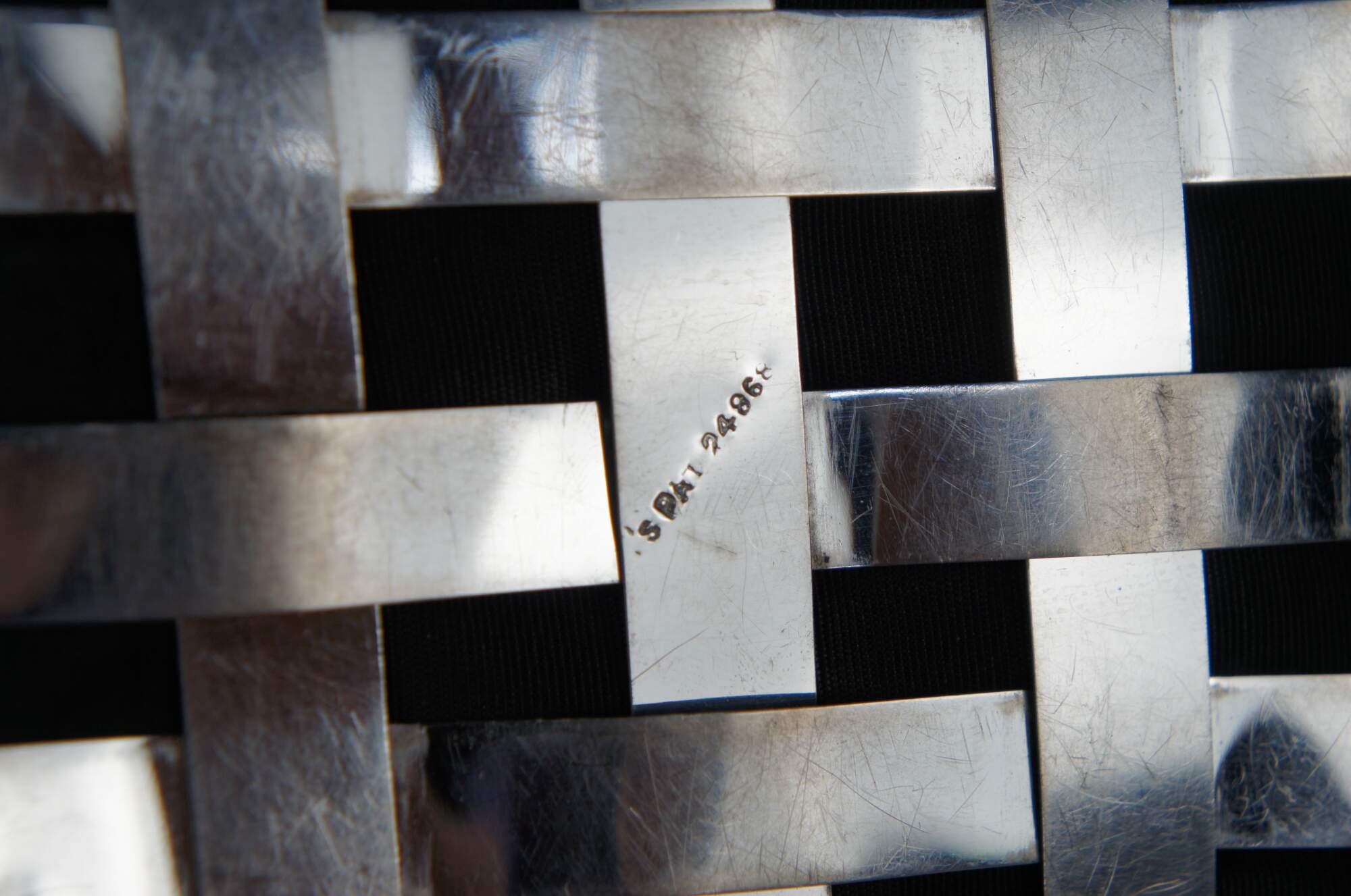 1950s mid century purse basket with bakelite top and clear lucite handle featuring basket woven metal bands and fabric lining.