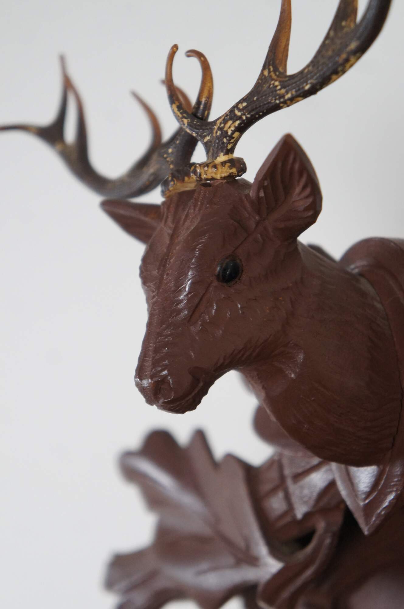 Good antique condition - wear and distressing commensurate with age and use, repair to leaf, split next to bag, antlers not original, working.